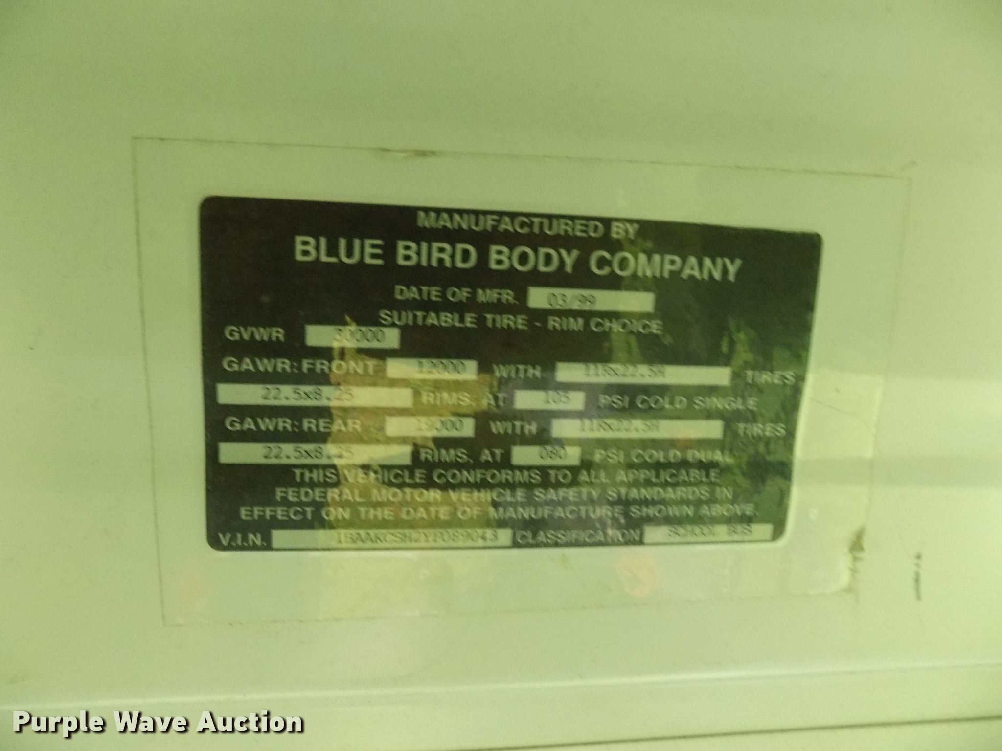 Purple Wave is selling a used Bus in Kansas. This item is a 1999 Blue Bird TC2000 school bus with the following: 116,931 miles on odometer, Cummins ISB 5.9L L6 diesel engine, Automatic transmission, Single axle, AC and heat, 72 passenger capacity, Spring suspension, Hydraulic brakes, 11R22.5 tires, GVWR 30,000 lbs