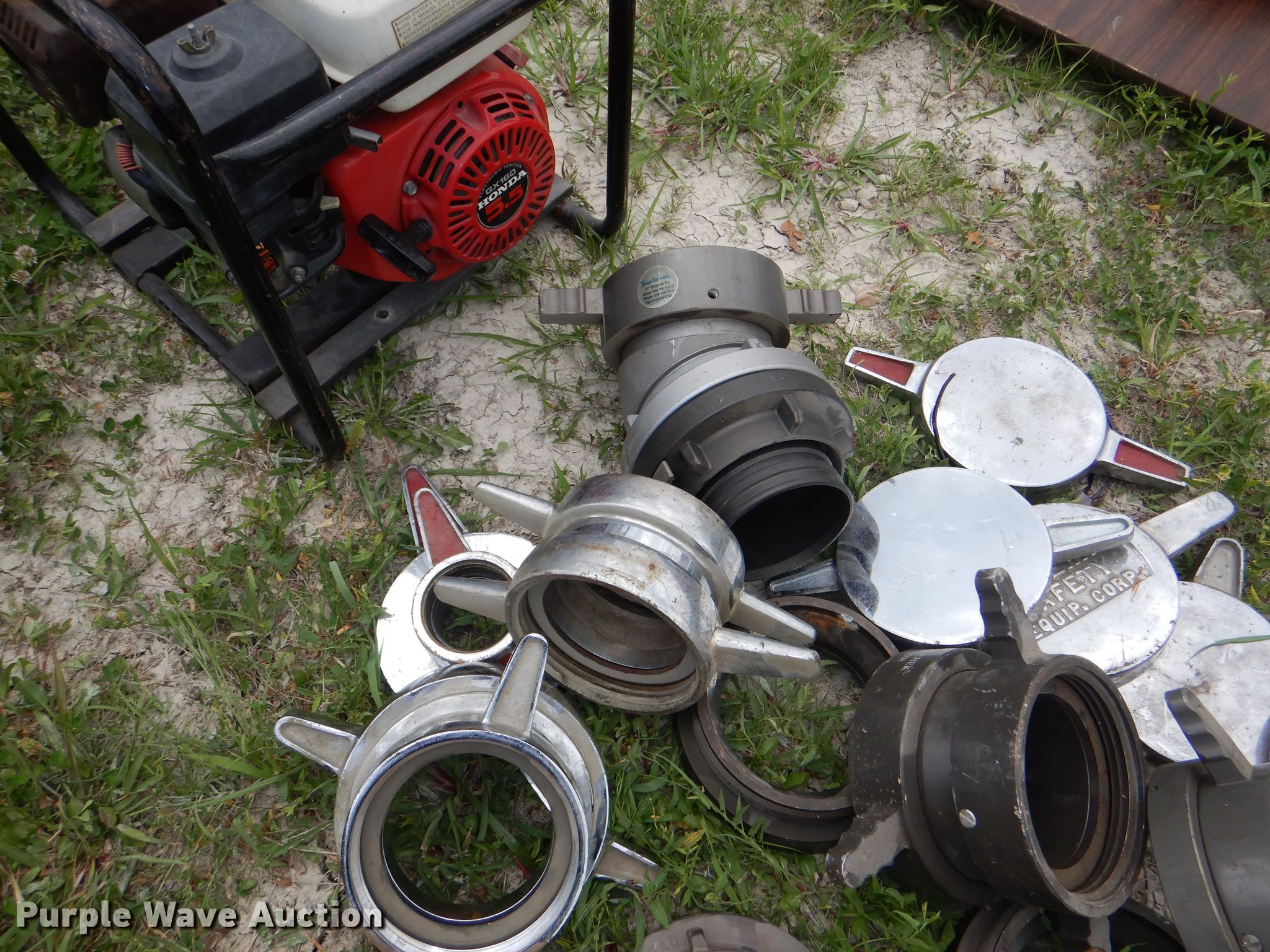 Water pump, hose, and connectors. Honda gas engine 5.5 HP, (4) caps, (14) connectors, (2) hose, Bucket of connectors. Herington, KS 67449