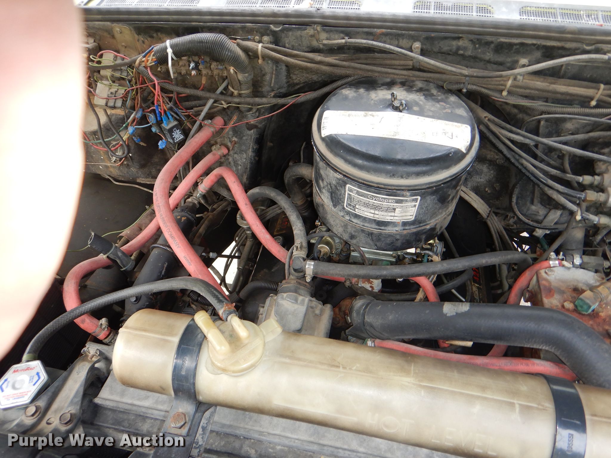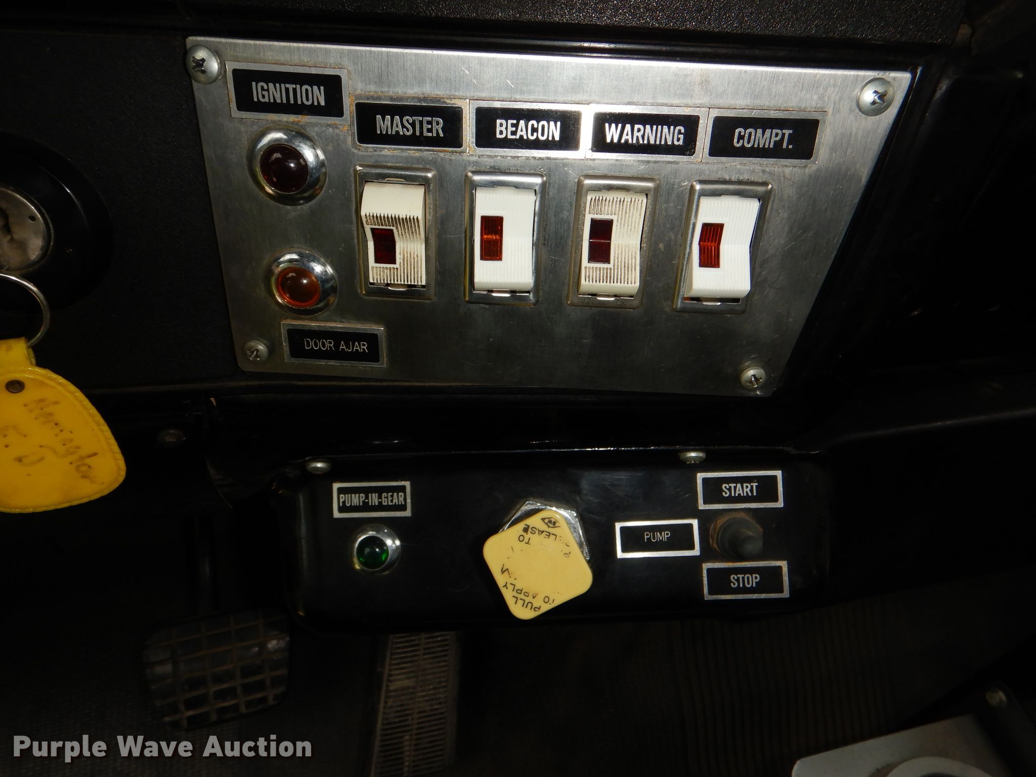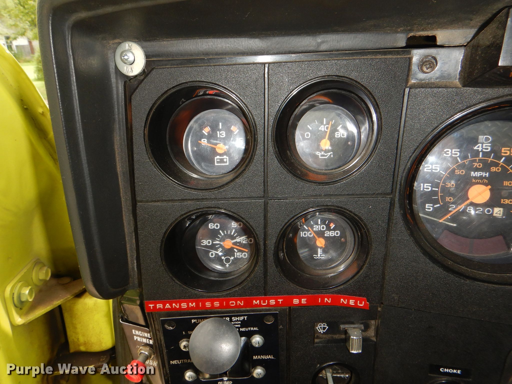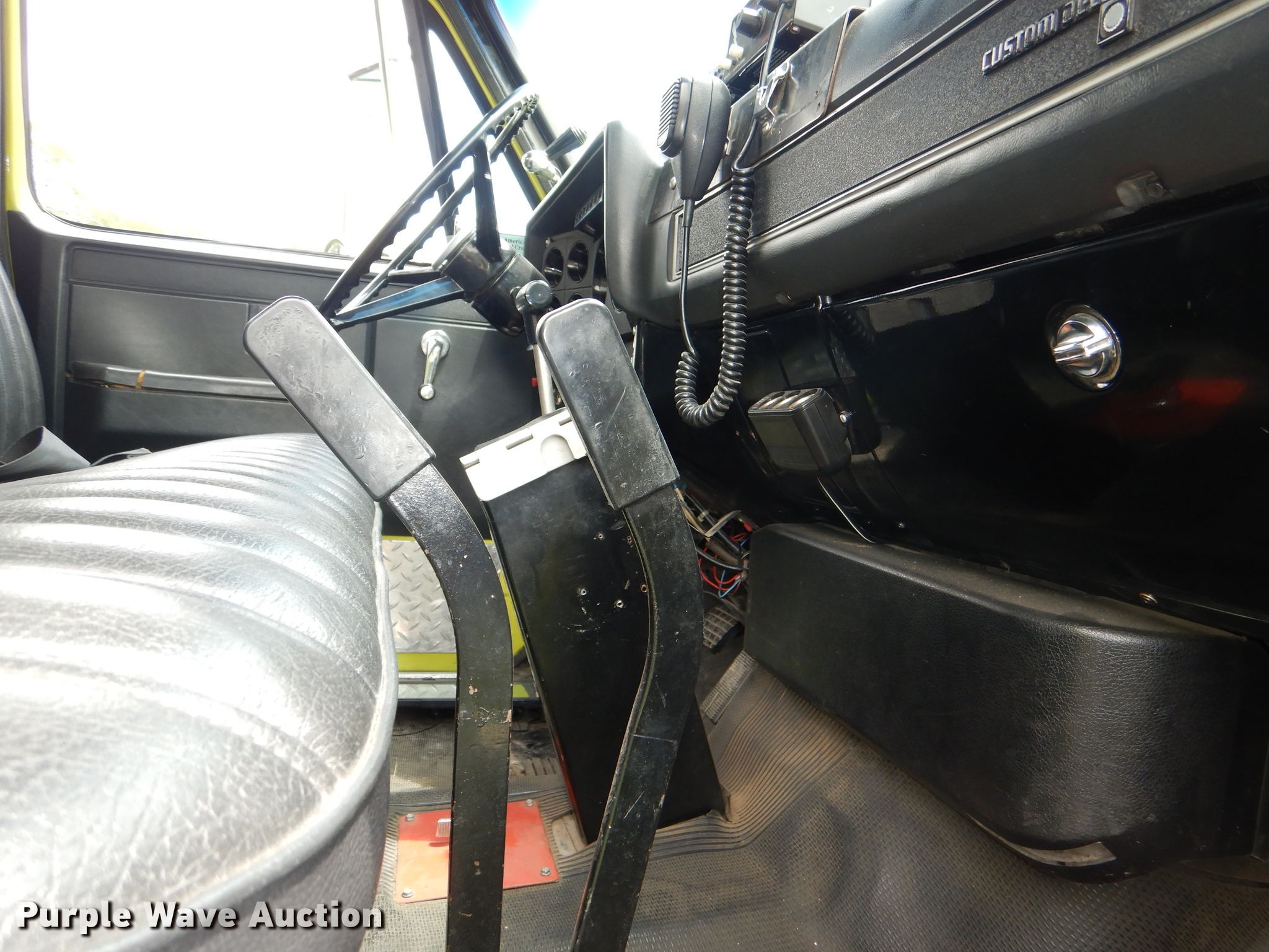 Purple Wave is selling a used Fire Truck or Emergency Vehicle in Kansas. This item is a 1984 Chevrolet C70 fire truck with the following: 27,820 miles on odometer, GM 427 C.I.D. gas engine, Automatic transmission, Four wheel drive, Single axle, Heat, Winch, 12,000 lbs capacity, Hale water pump, Gas engine, 750 gallon water tank, 10 gallon foam tank, Electric hose reel, 200' hose, SCBA cylinder capable, 168" wheelbase, Spring suspension, Air brakes, Goodyear 9.00-20 tires, GVWR 27,080 lbs, Unit# 5