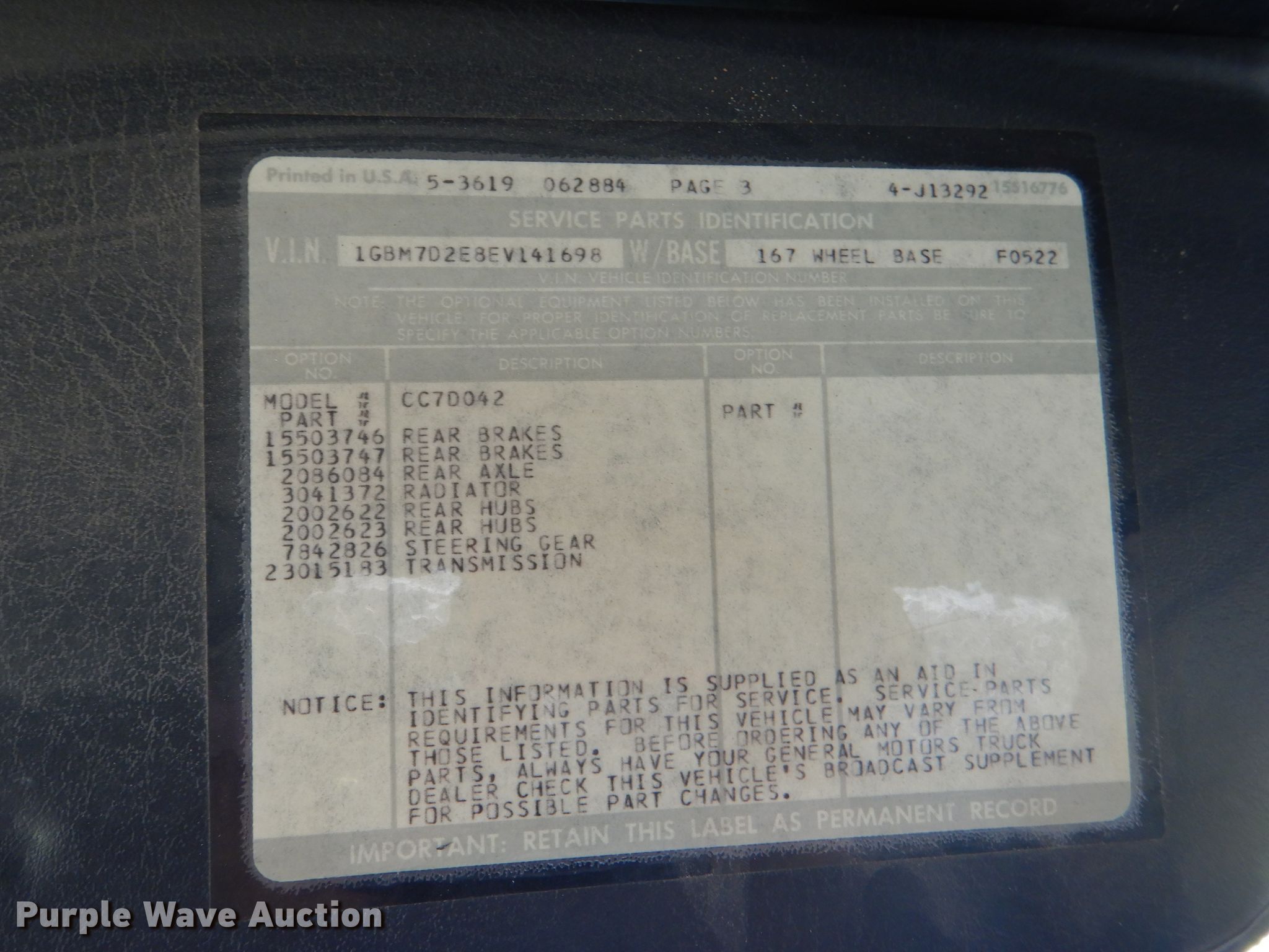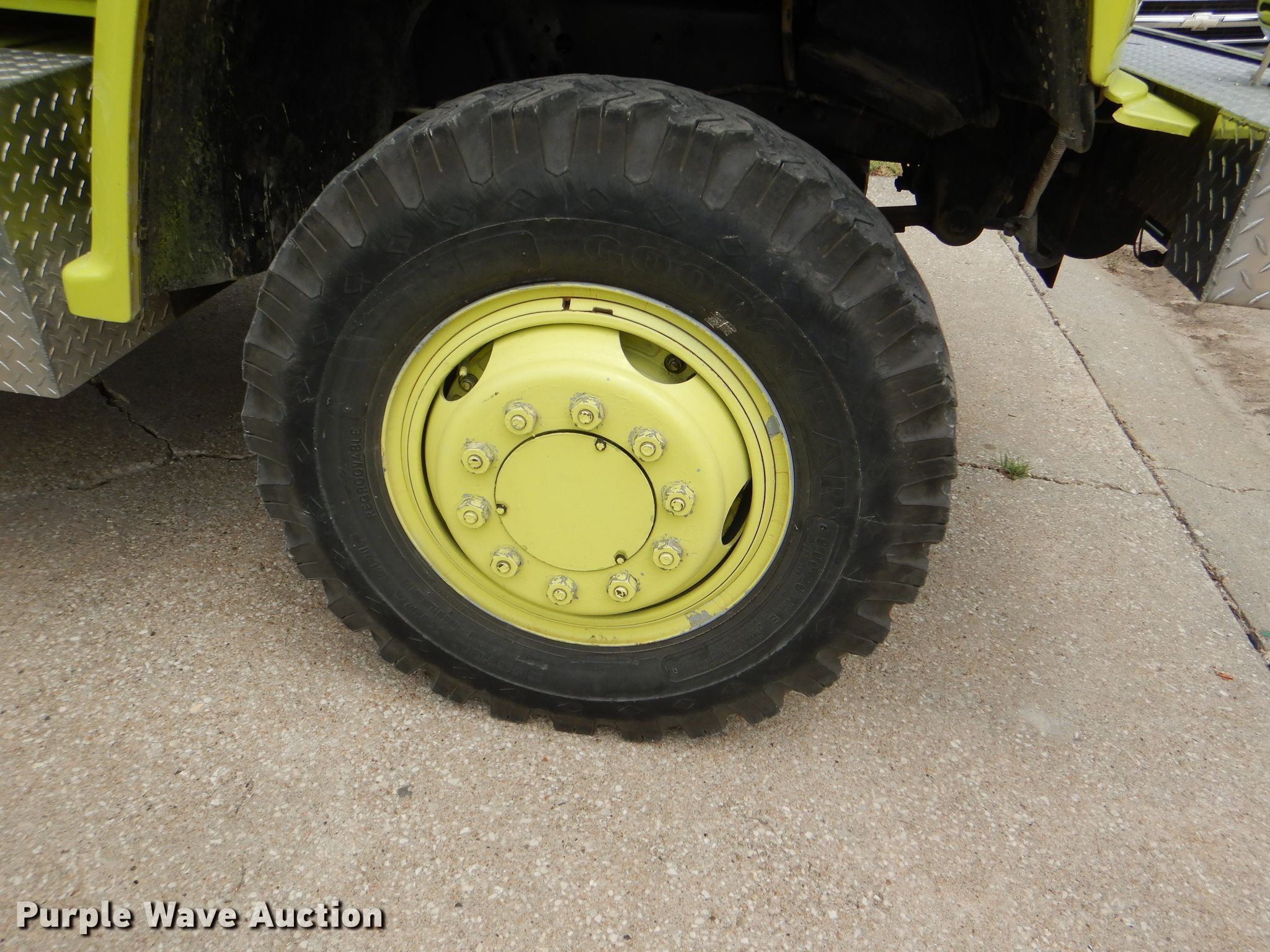 1984 Chevrolet C70 fire truck. 27,820 miles on odometer, GM 427 C.I.D. gas engine, Automatic transmission, Four wheel drive, Single axle, Heat, Winch 12,000 lbs capacity, Hale water pump Gas engine, 750 gallon water tank, 10 gallon foam tank, Electric hose reel 200' hose, SCBA cylinder capable, 168" wheelbase, Spring suspension, Air brakes, Goodyear 9.00-20 tires, GVWR 27,080 lbs, Unit# 5. Kansas title. 1GBM7D2E8EV141698. Herington, KS 67449