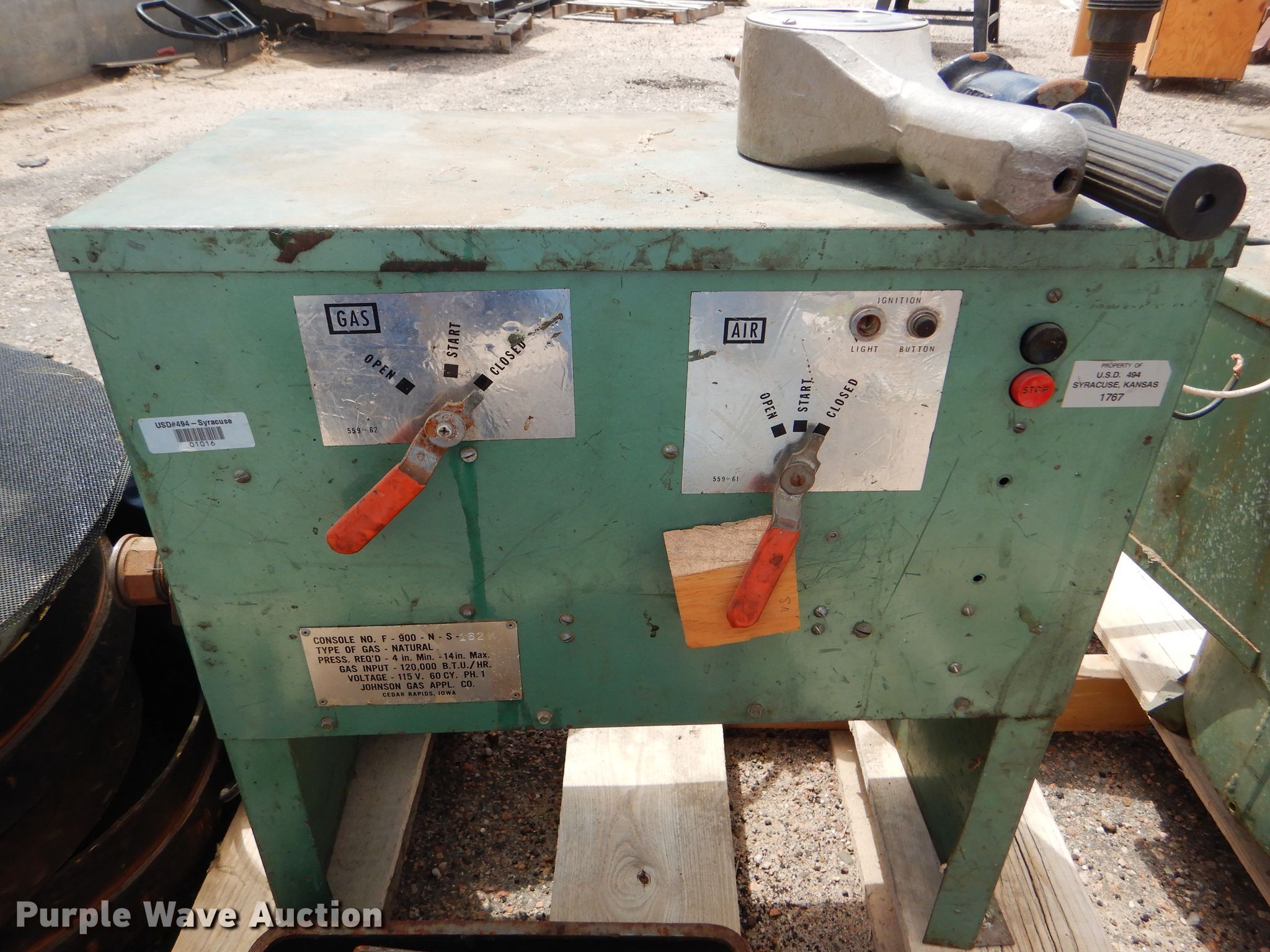 Purple Wave is selling a used Tools in Kansas. This item is a Johnson F-900 foundry with the following: Natural gas operation, 120,000 BTU input, Crucible, Crucible tongs, Casting equipment, Pyrometer