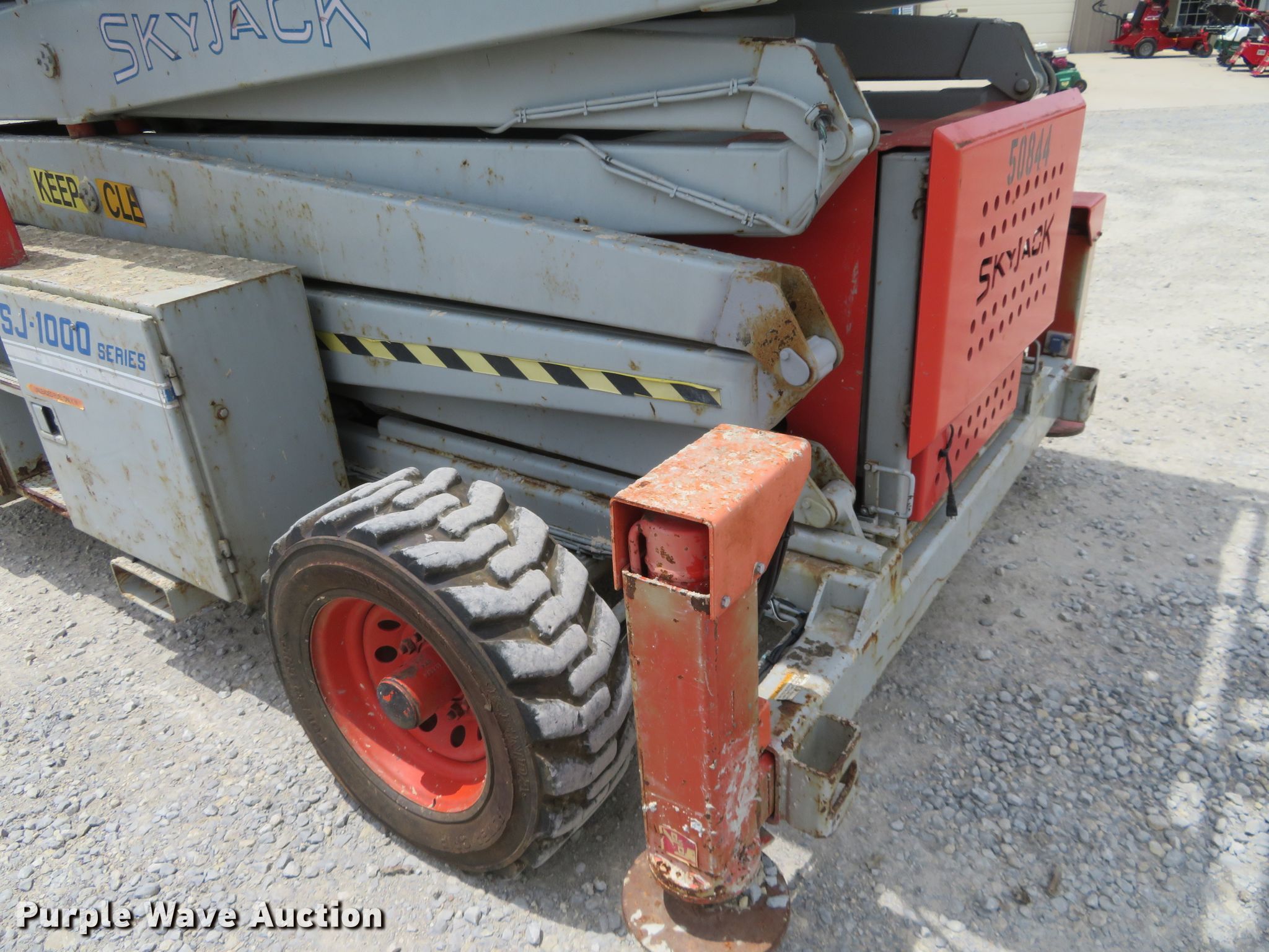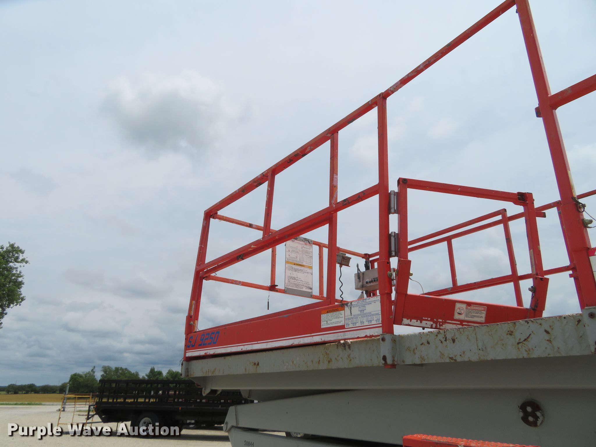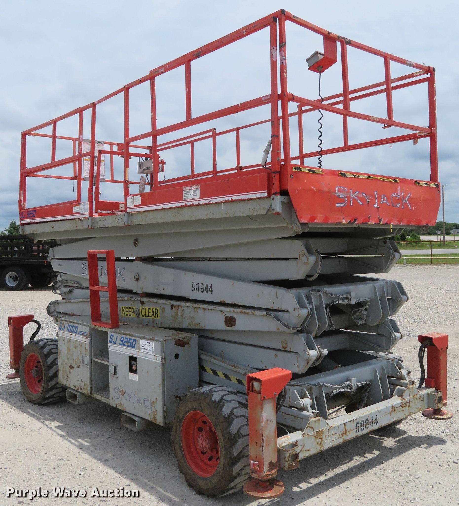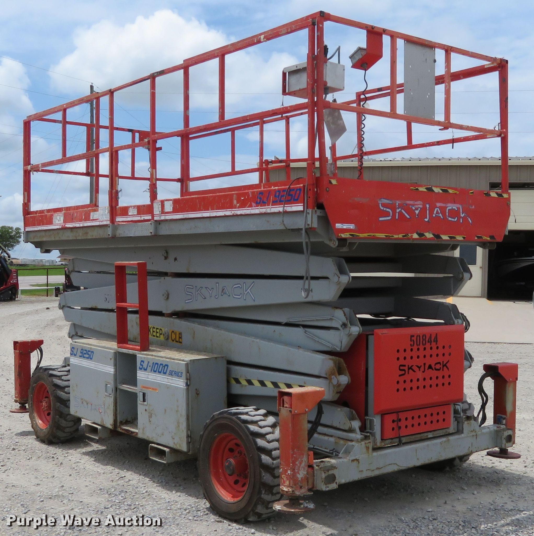 Purple Wave is selling a used Scissor or Vertical Lift in Kansas. This item is a 2000 Skyjack 9250 scissor lift with the following: 3,005 hours on meter, Four cylinder dual fuel engine, Gas or propane capable, Four wheel drive, 1,500 lbs max lift capacity, 50' max lift height, 26' max travel height, 23'L x 6'W platform, Ground and platform controls, Powered platform extensions, Hydraulic outriggers, 10-16.5 foam-filled tires, Serial 50844