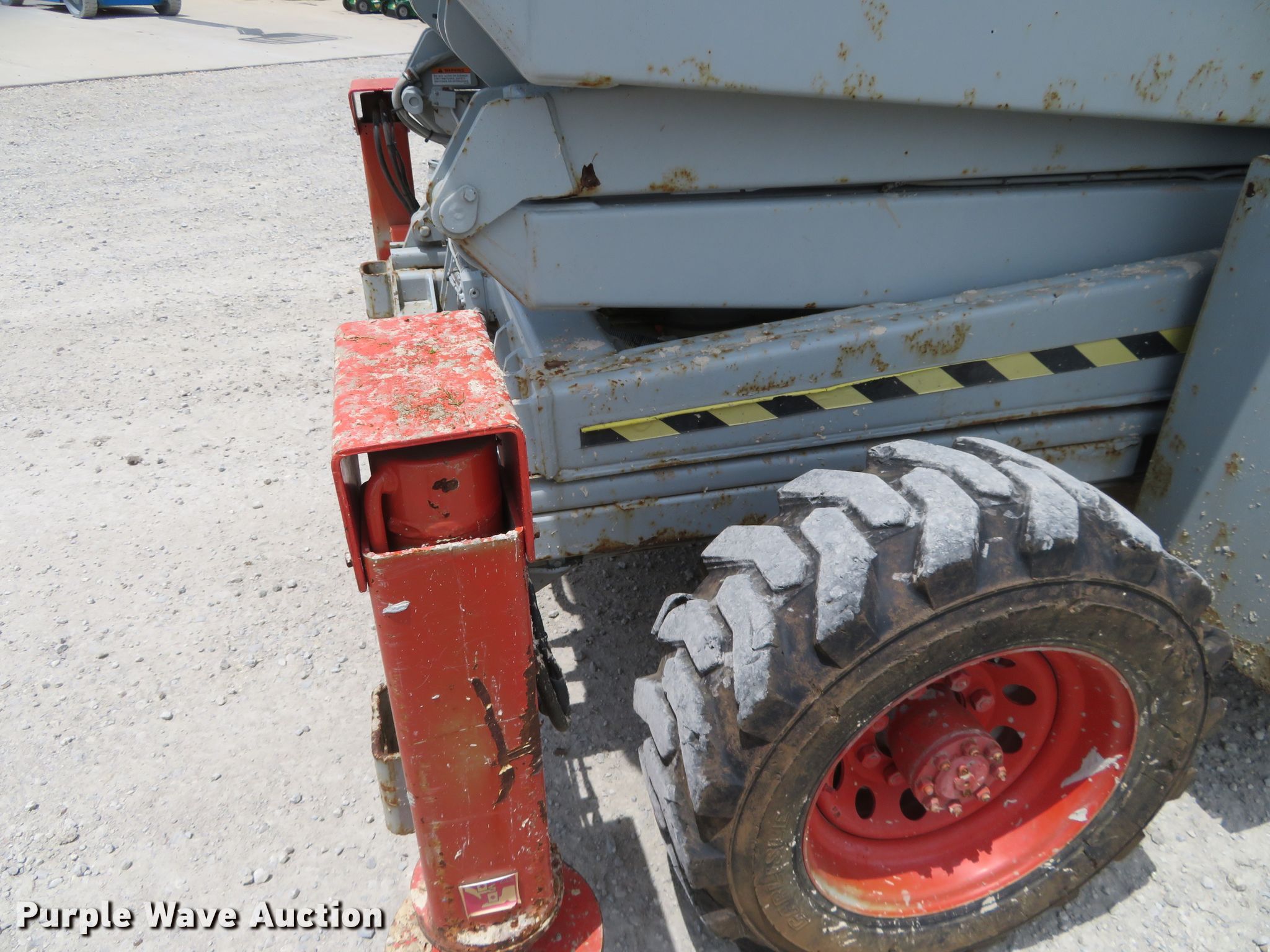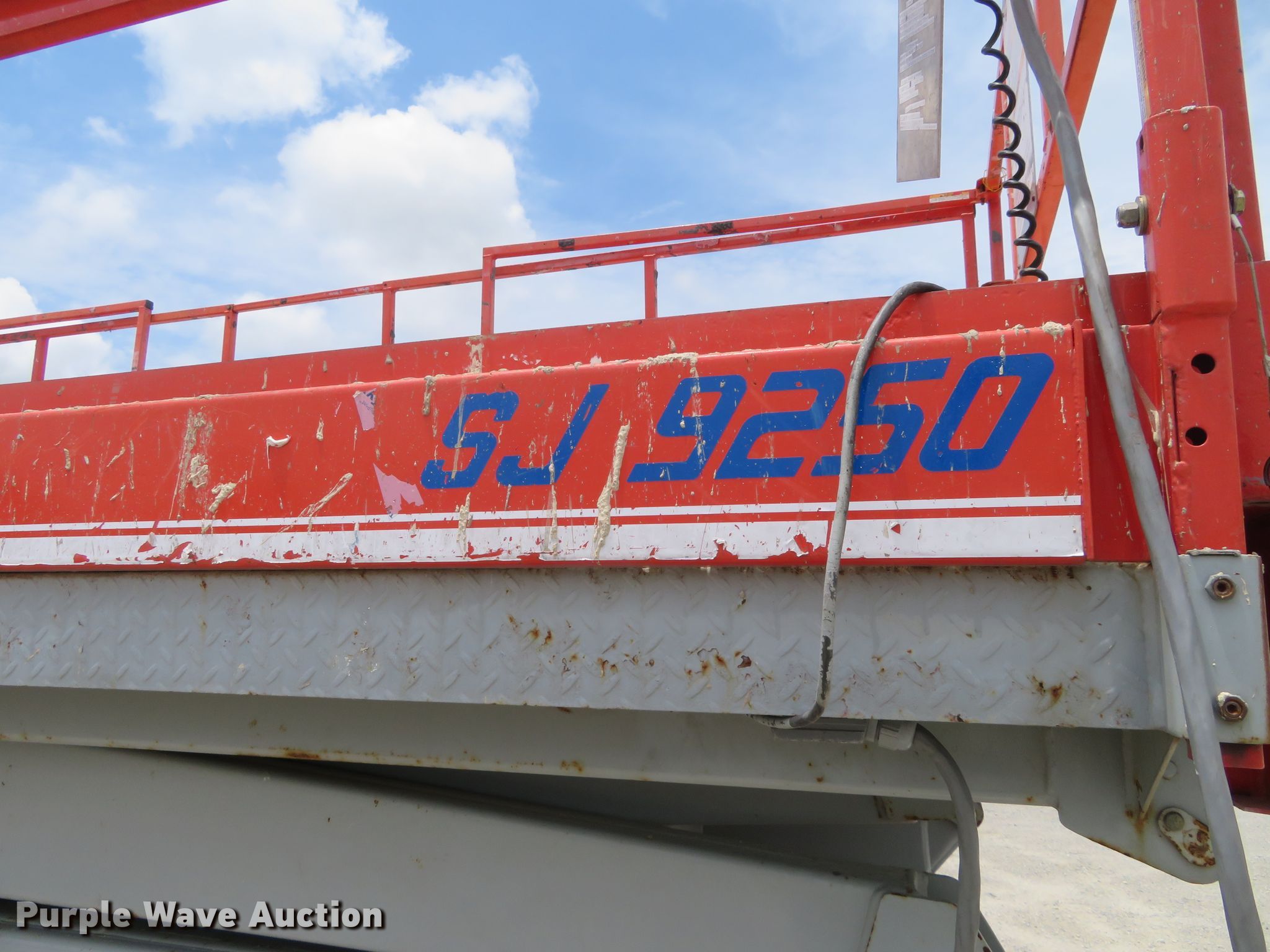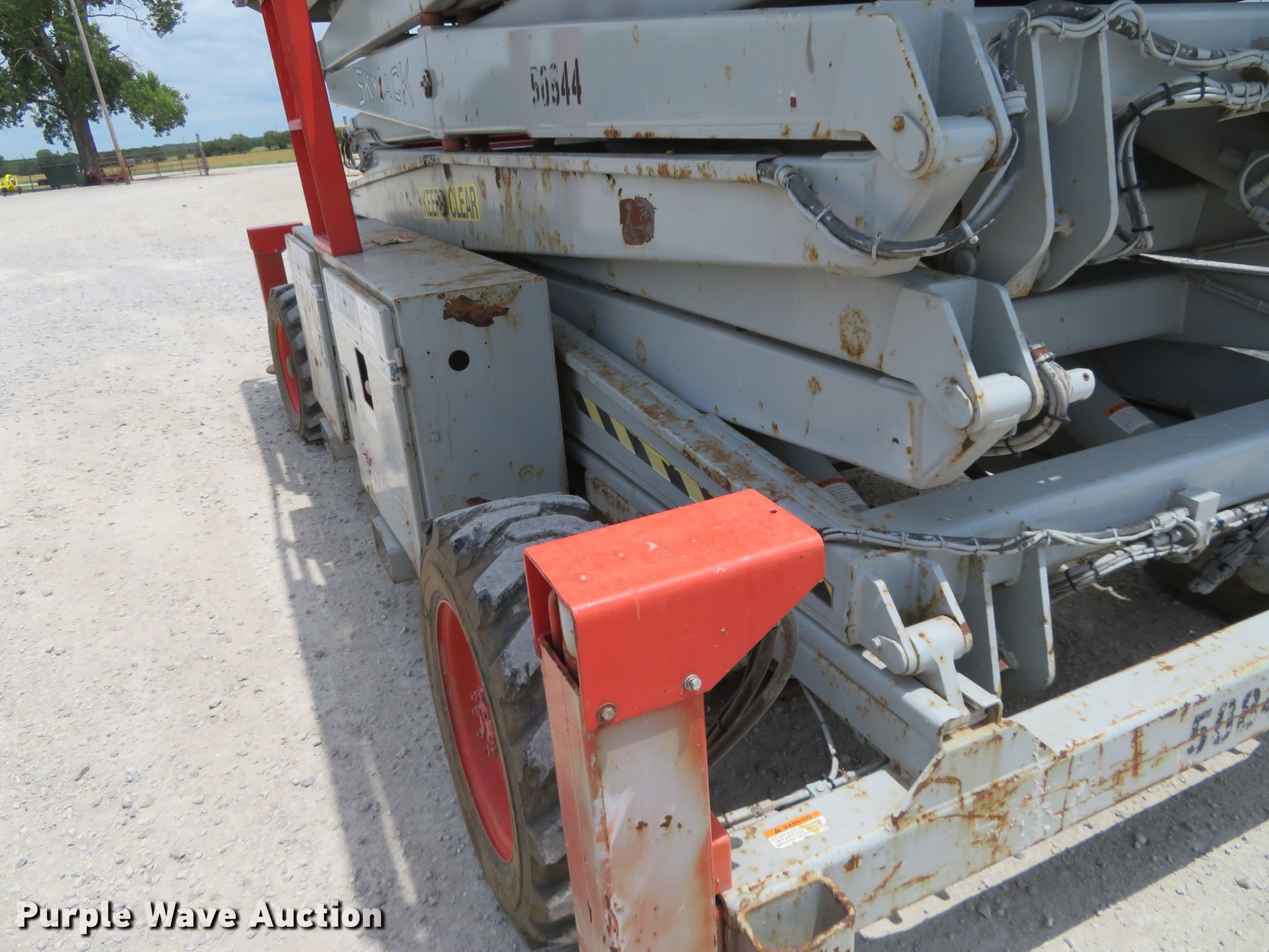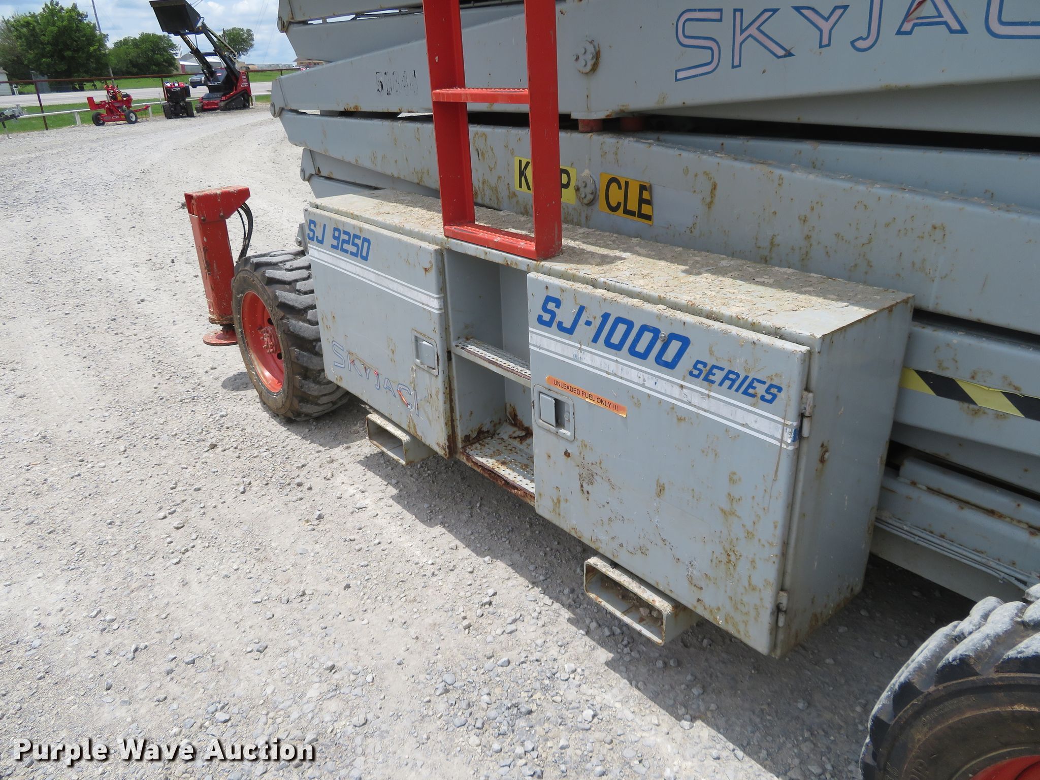 Purple Wave is selling a used Scissor or Vertical Lift in Kansas. This item is a 2000 Skyjack 9250 scissor lift with the following: 3,005 hours on meter, Four cylinder dual fuel engine, Gas or propane capable, Four wheel drive, 1,500 lbs max lift capacity, 50' max lift height, 26' max travel height, 23'L x 6'W platform, Ground and platform controls, Powered platform extensions, Hydraulic outriggers, 10-16.5 foam-filled tires, Serial 50844