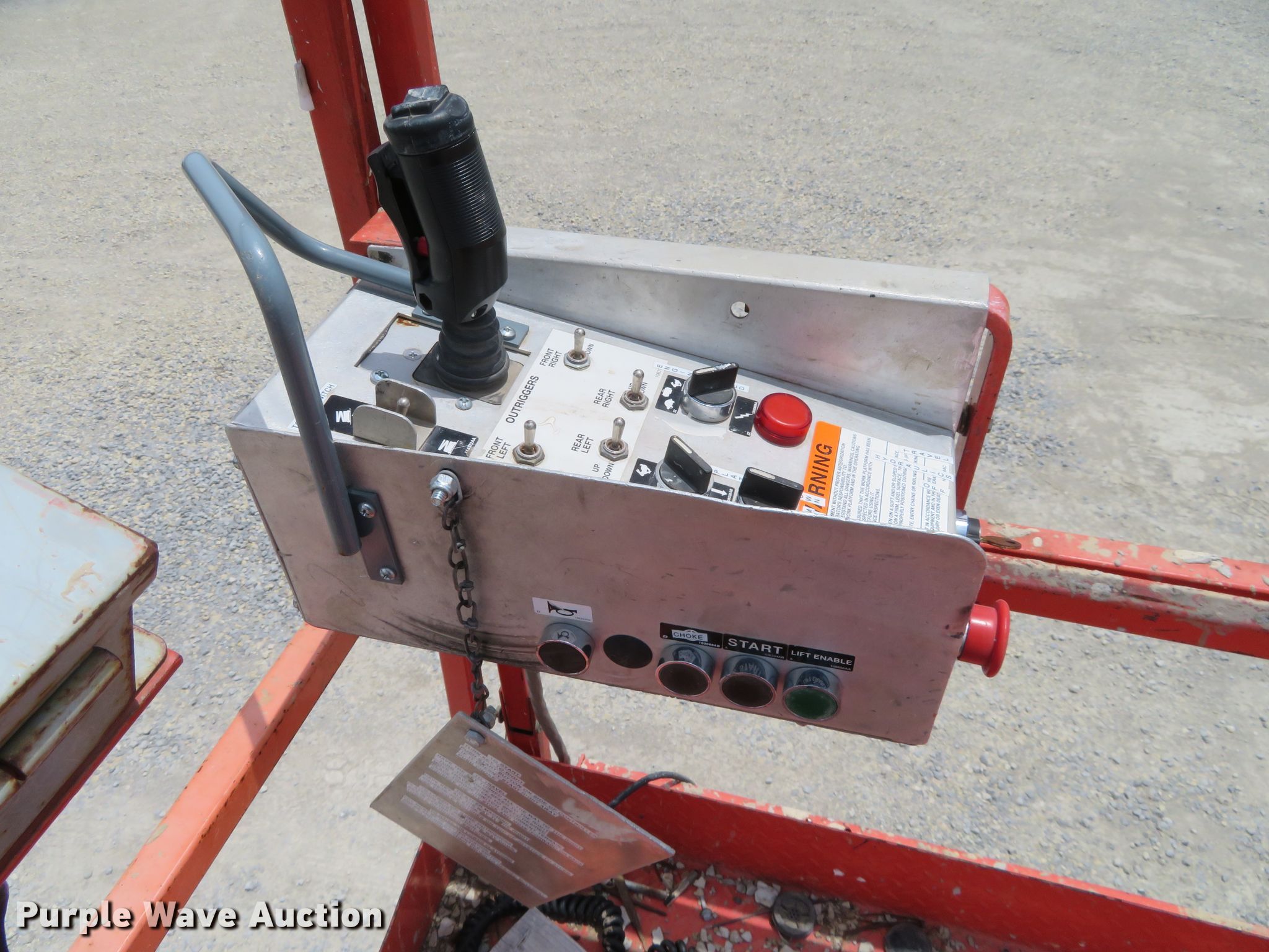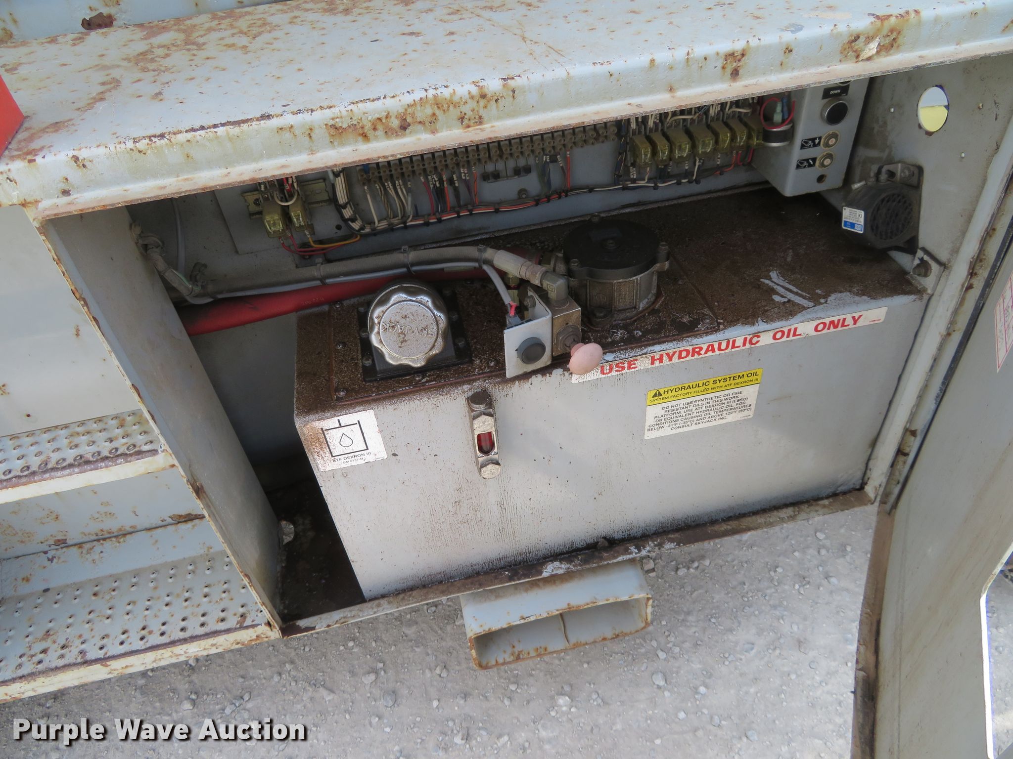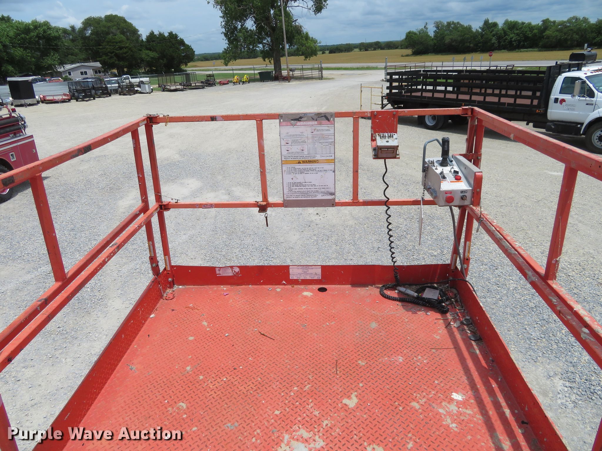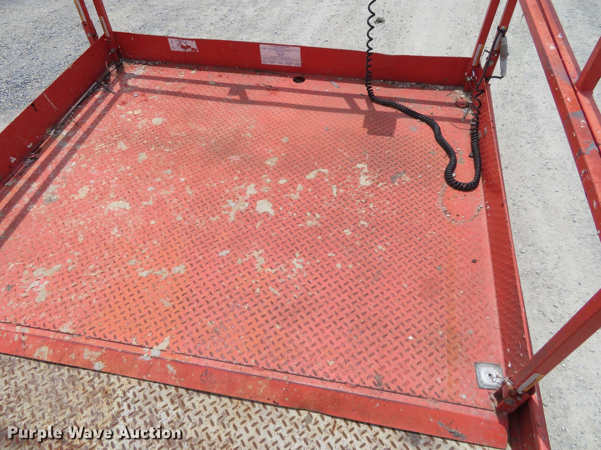 Purple Wave is selling a used Scissor or Vertical Lift in Kansas. This item is a 2000 Skyjack 9250 scissor lift with the following: 3,005 hours on meter, Four cylinder dual fuel engine, Gas or propane capable, Four wheel drive, 1,500 lbs max lift capacity, 50' max lift height, 26' max travel height, 23'L x 6'W platform, Ground and platform controls, Powered platform extensions, Hydraulic outriggers, 10-16.5 foam-filled tires, Serial 50844