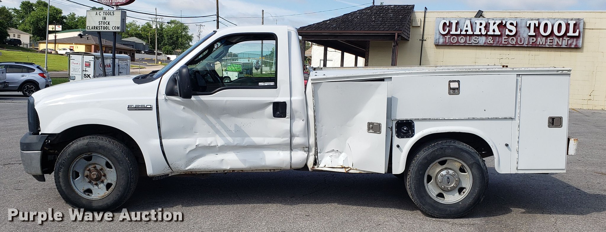 This 2006 Ford F250 Super Duty utility bed pickup truck will sell to the highest bidder regardless of price.