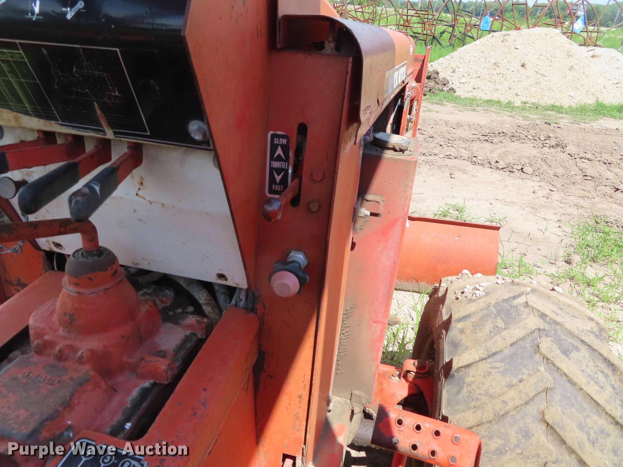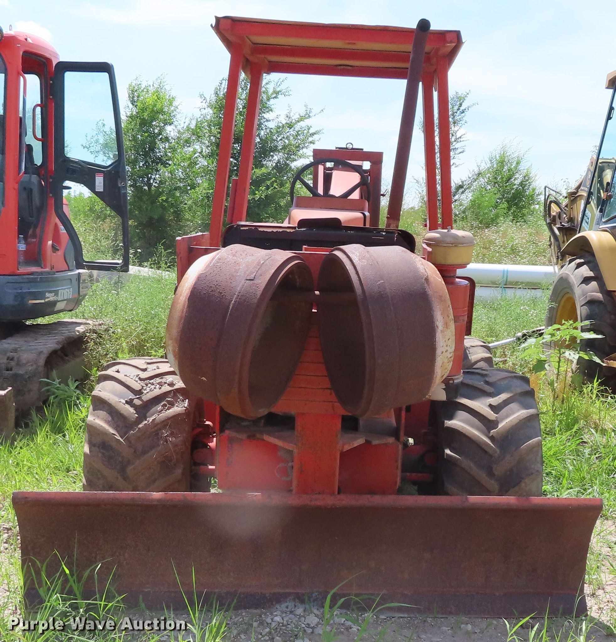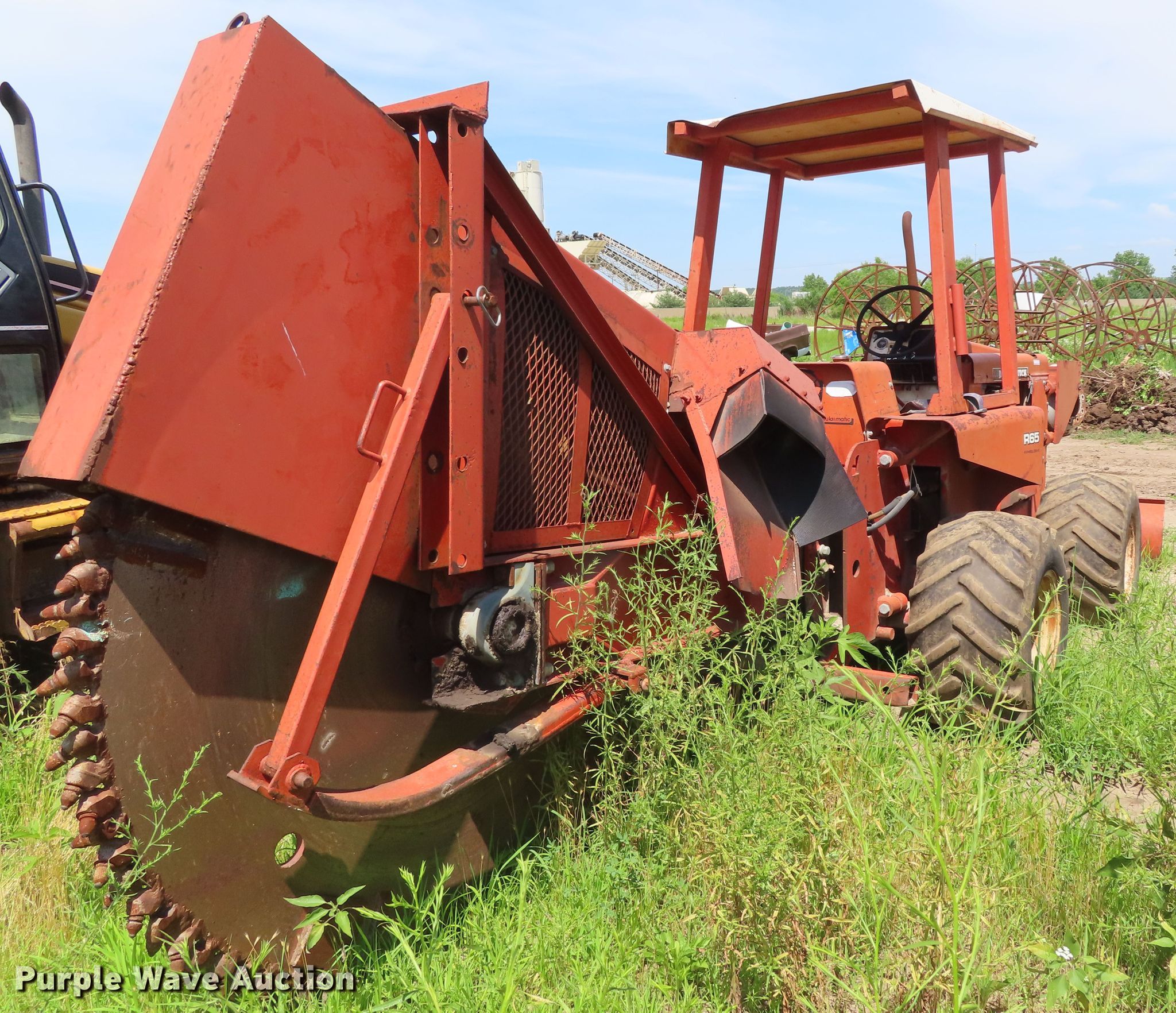 Purple Wave is selling a used Trencher or Rock Saw in Kansas. This item is a 1979 Ditch Witch R65 rock saw with the following: 572 hours on meter, Ford four cylinder gas engine, Manual transmission, 4F-1R gears, Four wheel drive, Canopy, Four-way backfill blade, Model R65ES24 rock saw, 3" cutting width, 64" diameter wheel, Rock teeth, 31x15.50-15 tires, Dead battery, Serial 651099