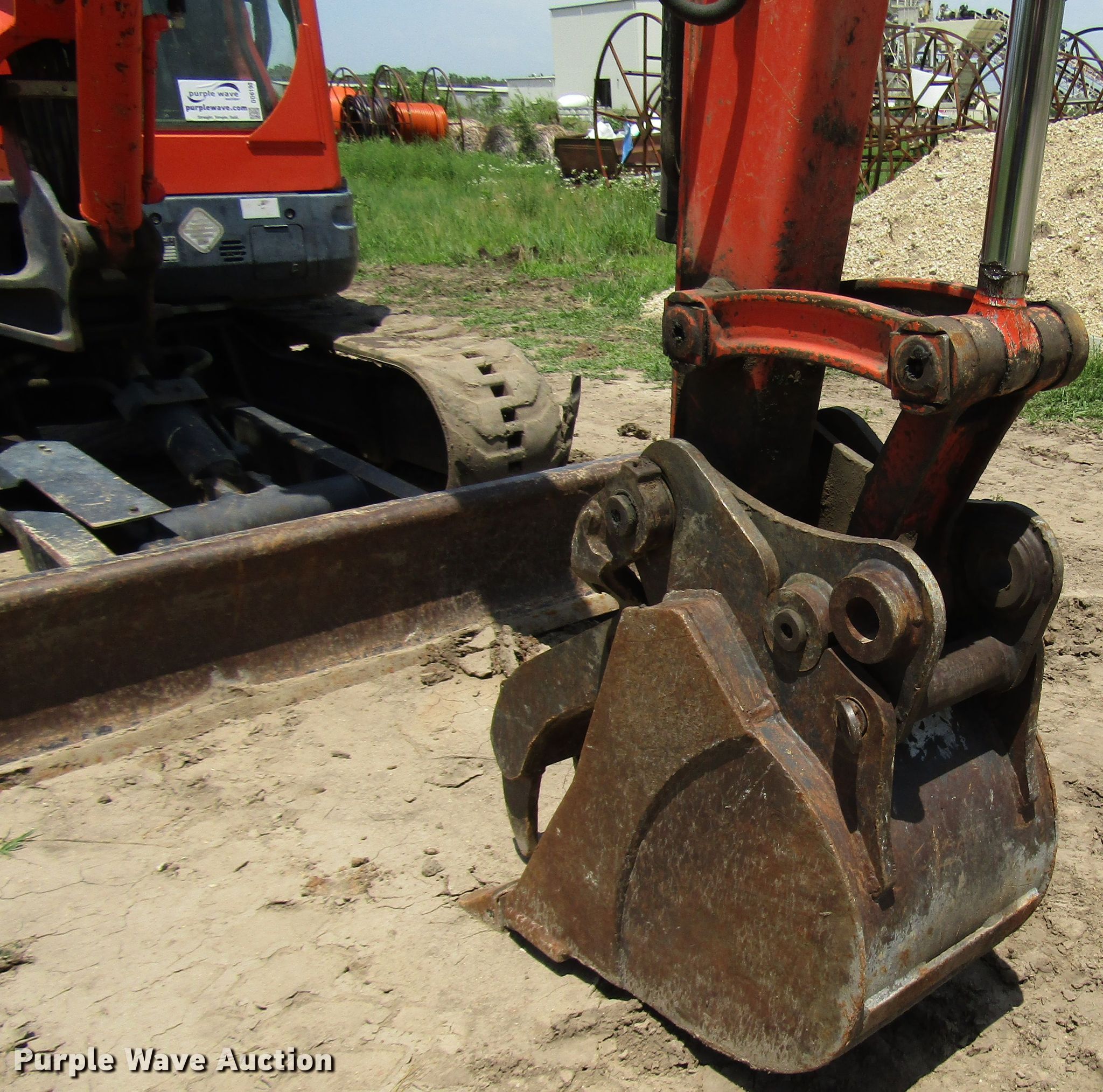 Purple Wave is selling a used Mini Excavator in Kansas. This item is a 2006 Kubota KX161-3SS mini excavator with the following: 3,840 hours on meter, Kubota 2.4L four cylinder diesel engine, 32.8 kW, Hydrostatic transmission, Enclosed cab, Heat, Two-way auxiliary hydraulics, 77"W backfill blade, Swing boom, 5'10" stick length, Kubota mechanical quick coupler, Kubota hydraulic thumb, Kubota 16"W bucket, Weld-on cutting edge, 16"W rubber tracks, Glass broken, Serial 31762