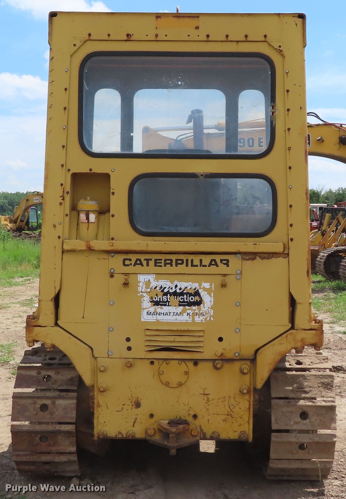 1979 Caterpillar D3 dozer. 3,893 hours on meter, Caterpillar 3204 four cylinder diesel engine, Powershift transmission 3F-1R gears, Enclosed cab Heat, Clutch brake steering, 95"W six-way straight dozer blade, Five bottom rollers, 14"W single grouser track pads, Dead battery, Glass cracked, Serial 79U6048. Larson Construction, Inc.. 2616 Eureka Terrace. Manhattan, KS 66503