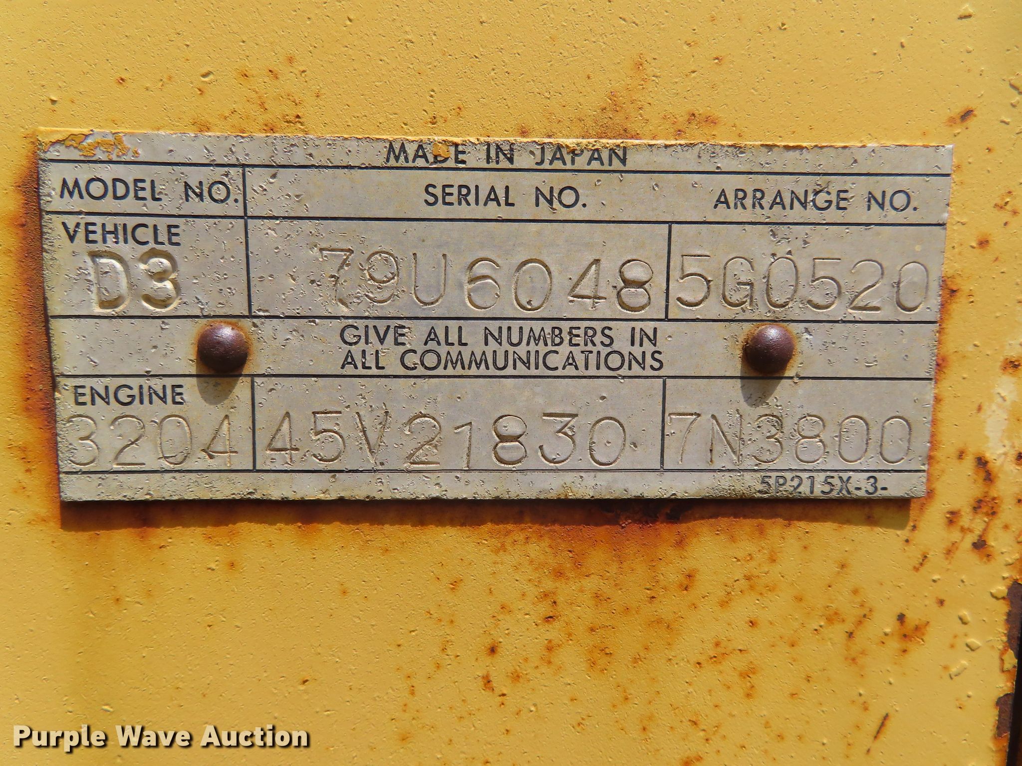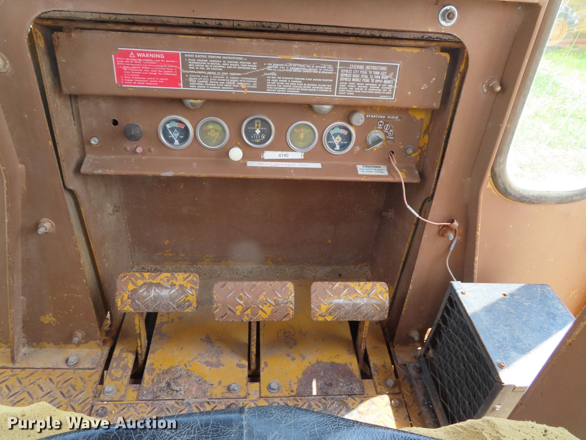 Purple Wave is selling a used Crawler Dozer in Kansas. This item is a 1979 Caterpillar D3 dozer with the following: 3,893 hours on meter, Caterpillar 3204 four cylinder diesel engine, Powershift transmission, 3F-1R gears, Enclosed cab, Heat, Clutch brake steering, 95"W six-way straight dozer blade, Five bottom rollers, 14"W single grouser track pads, Dead battery, Glass cracked, Serial 79U6048