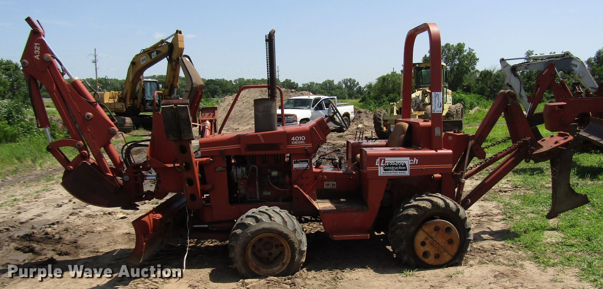 1981 Ditch Witch 4010DD cable plow. 2,201 hours on meter, Deutz three cylinder diesel engine 49 HP, Manual transmission 4F-1R gears, Four wheel drive, Six-way backfill blade, Model VP40 cable plow 24" depth, Serial 2774, A321 backhoe 18"W bucket, Serial 1E0442, 31x15.50-15 tires, No battery, Serial 408842. Larson Construction, Inc.. 2616 Eureka Terrace. Manhattan, KS 66503