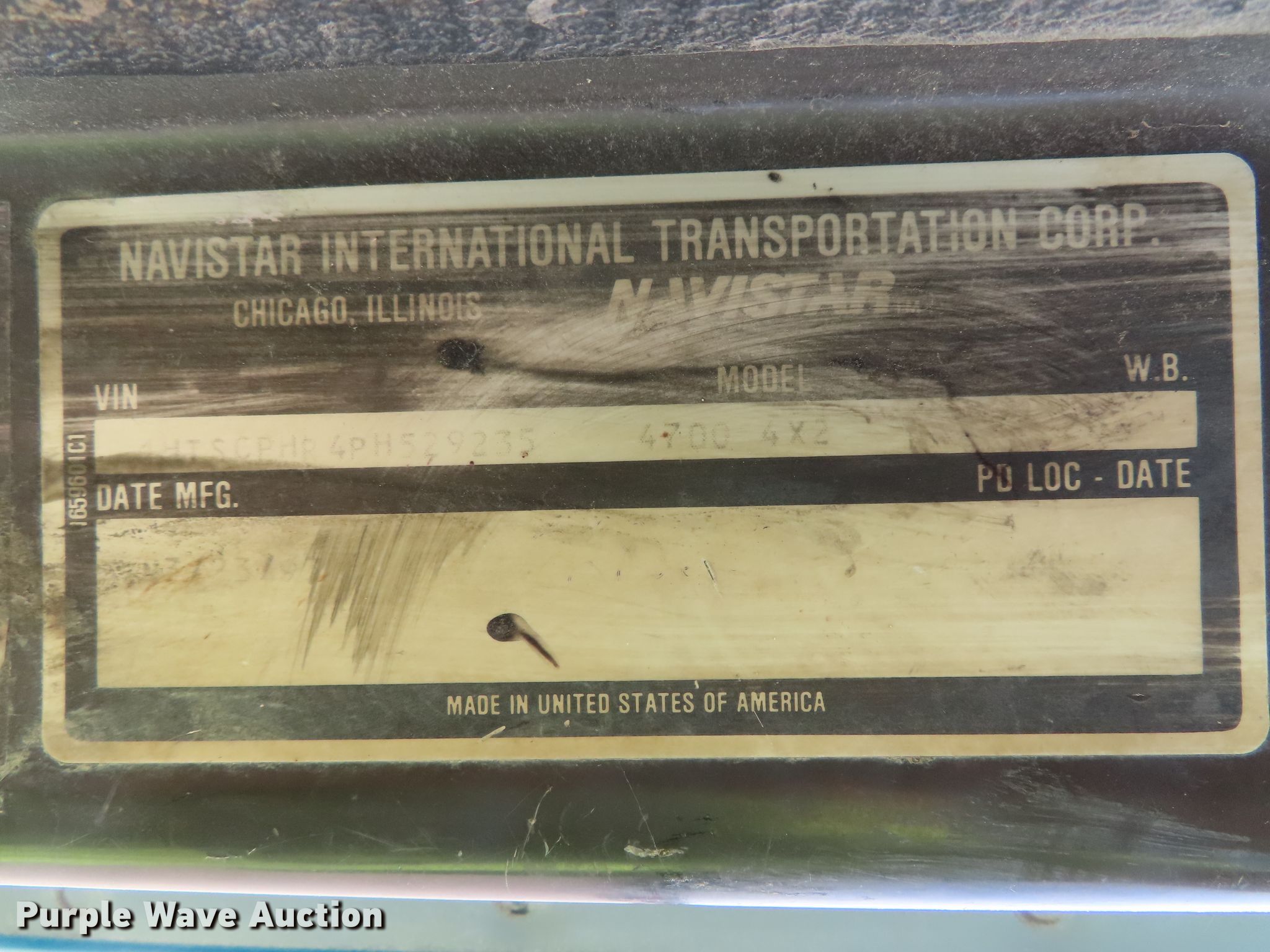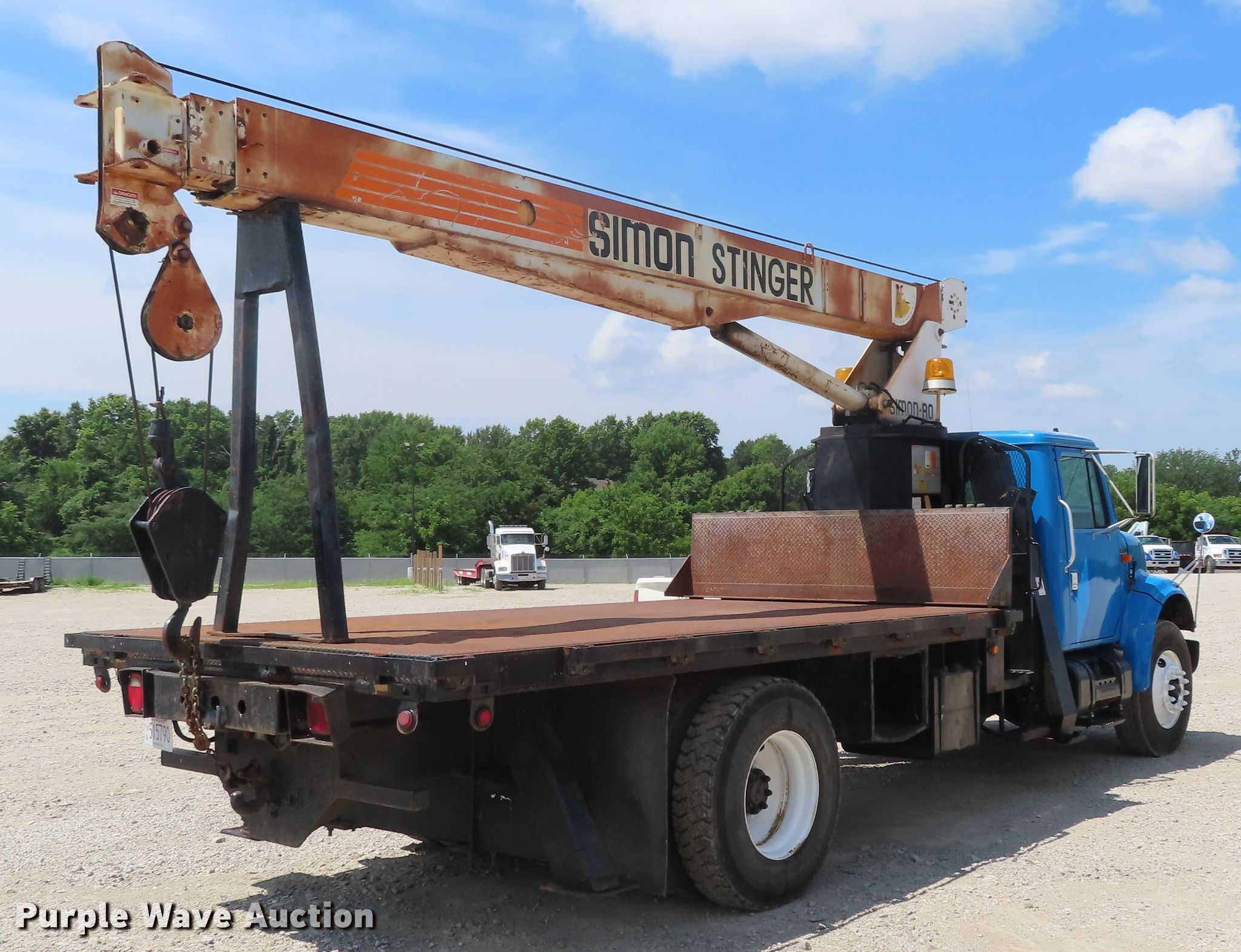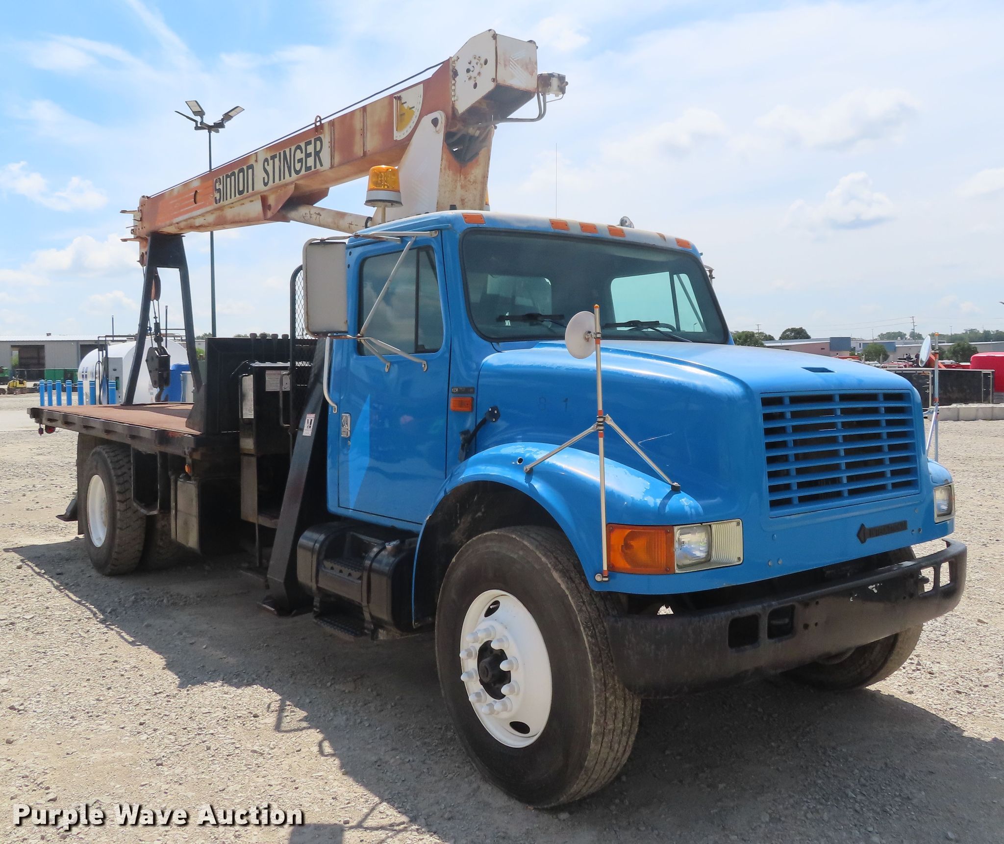 Purple Wave is selling a used Crane Truck in Kansas. This item is a 1993 International 4700 crane truck with the following: 98,197 miles on odometer, 13,669 hours on meter, International DT530 5.9L L6 diesel engine, Serial 1820808C2, Automatic transmission, Four wheel drive, Single axle, AC and heat, PTO, 15'L flatbed, Simon-Ro TC1647N crane, 47' boom length, Three boom sections, 16,000 lbs maximum lift capacity, 57' maximum lift height, Ground boom controls, 10 ton single sheave crane block, Lift chart, Air suspension, Air brakes, 11R22.5 tires, Boom cylinder leak