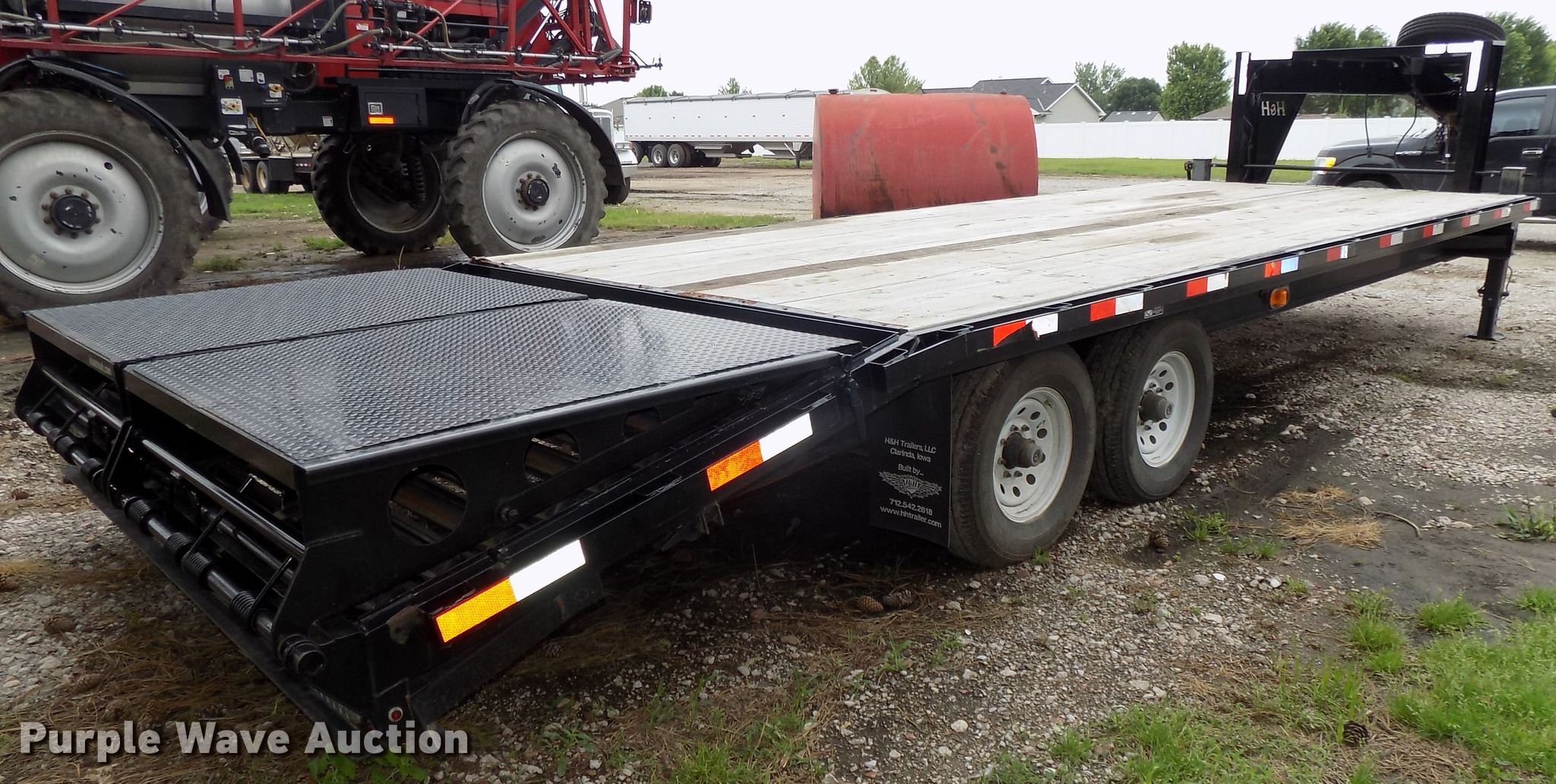 Purple Wave is selling a used Equip. Trailer in Nebraska. This item is a 2015 H&H equipment trailer with the following: 33' overall length, 20'L x 102"W wood deck, 5' tail length, 35" floor height, Ramps, Dual leg landing gear, Spring suspension, Electric brakes, Tandem axle, Steel wheels, Trailer King ST235/80R16 tires, GVWR 14,000 lbs, GAWR 7,000 lbs