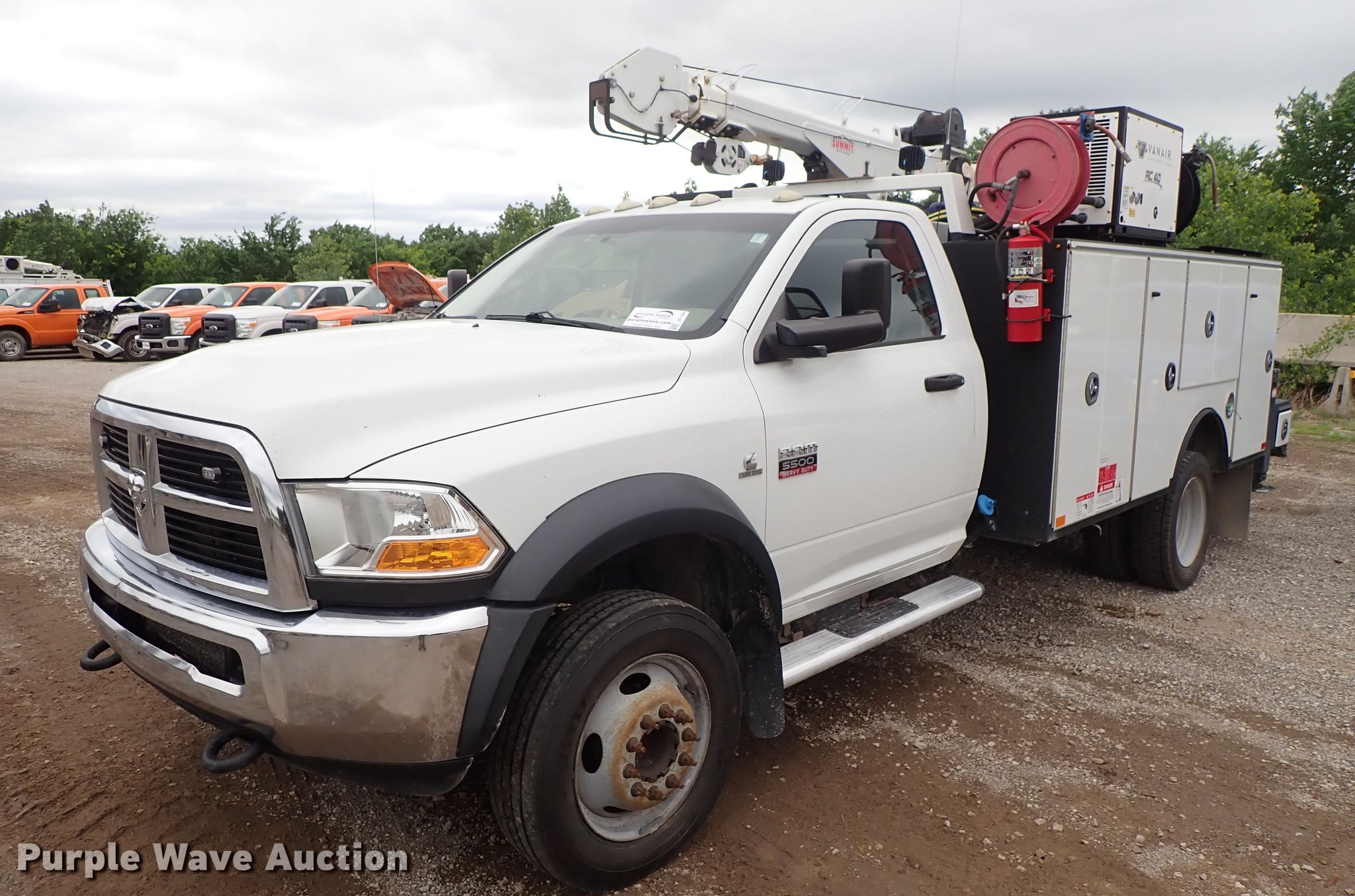 Purple Wave is selling a used Service Truck in Oklahoma. This item is a 2011 Dodge Ram 5500 service truck with crane with the following: 227,449 miles on odometer, 6.7L L6 OHV 24V diesel engine, Automatic transmission, Four wheel drive, AC and heat, Cruise, Power windows and locks, 11'L x 8'W utility bed, 50 gallon fluid transfer tank, Hydraulic oil tank, Vanair RC40 air compressor, (2) hose reels,, Summit 6620 crane, 6,000 lbs maximum lift capacity, 21' maximum reach, Five ton block, Three ton hook, Outriggers, 225/70R19.5 tires, Unit# 05.48