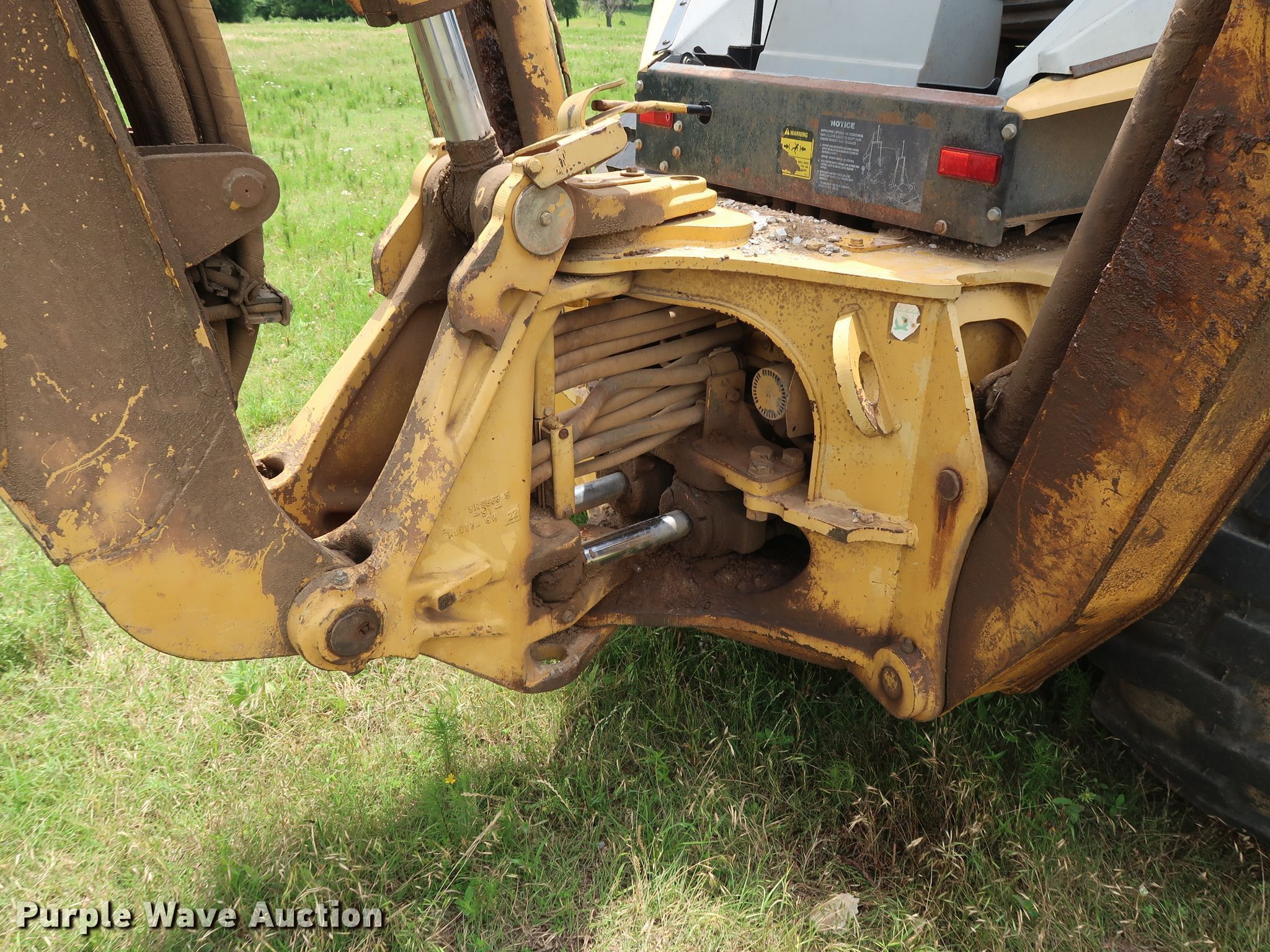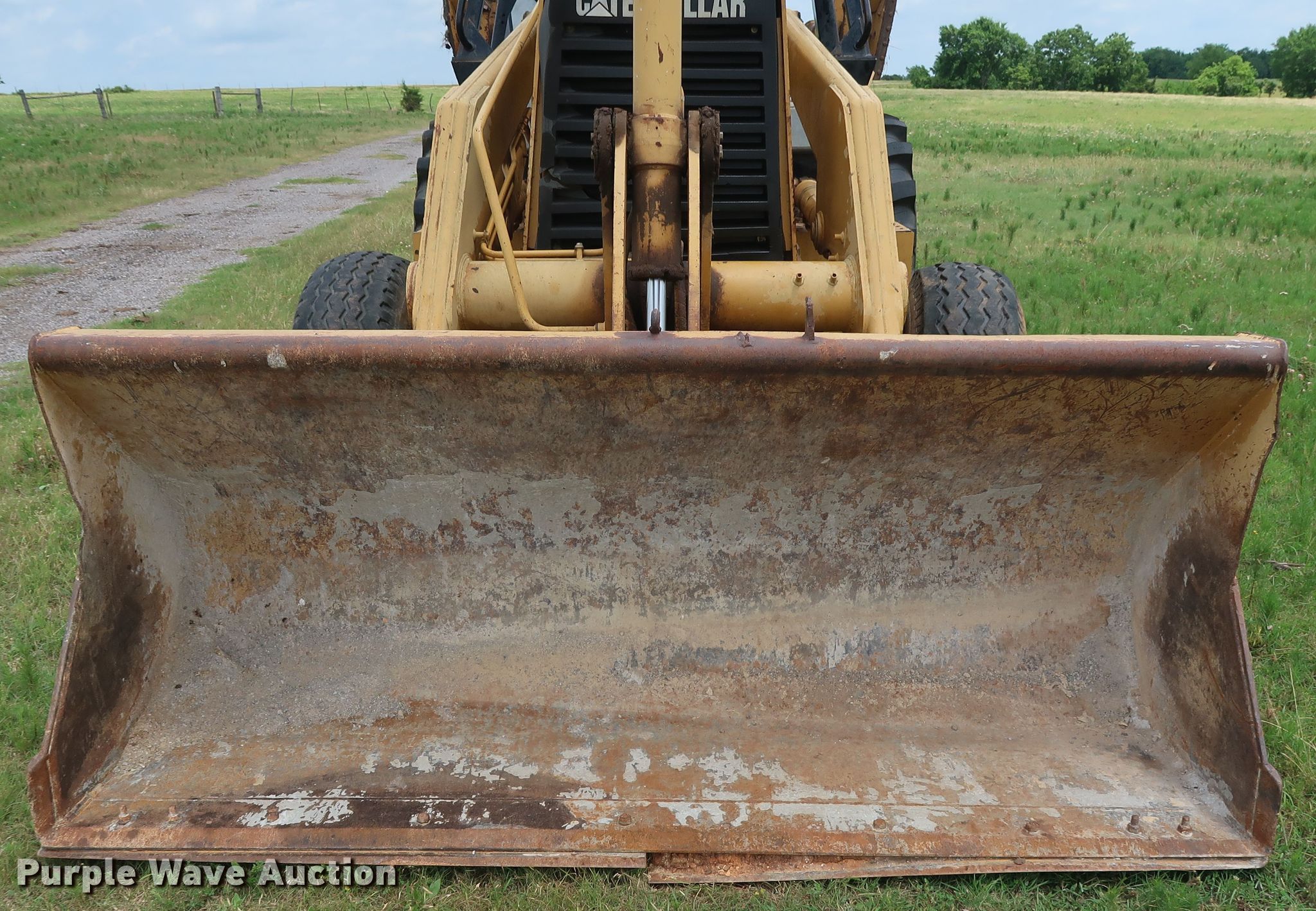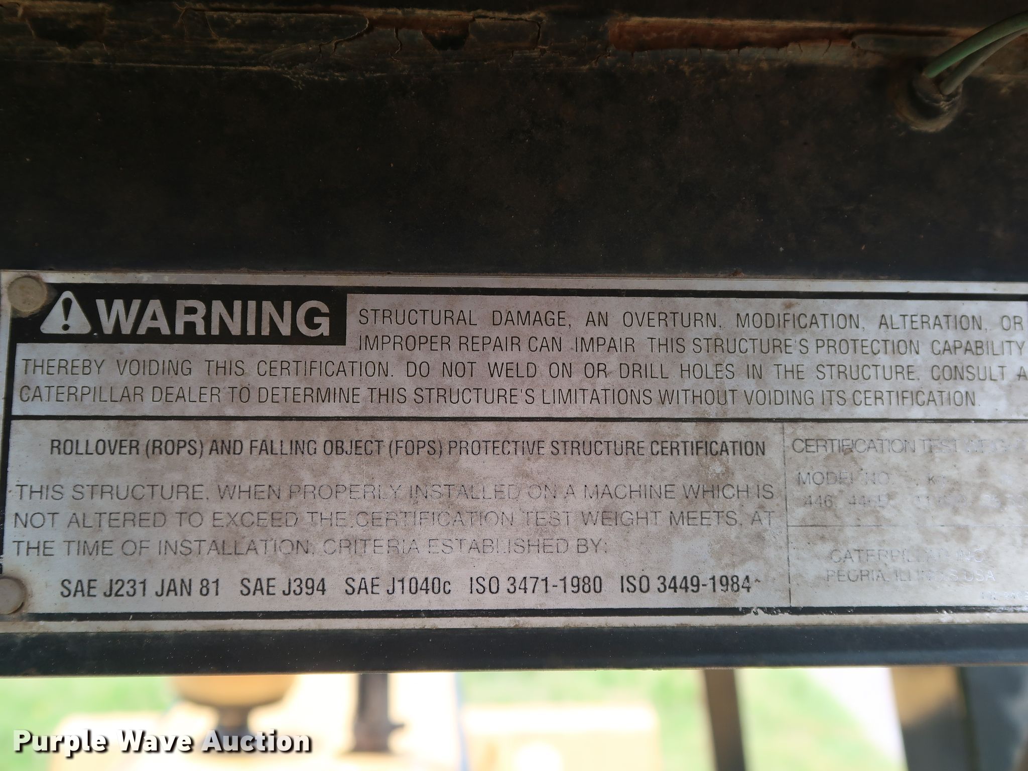 Purple Wave is selling a used Tractor Loader Backhoe in Oklahoma. This item is a 1995 Caterpillar 446B backhoe with the following: 3,056 hours on meter, Hours may vary, unit still in use, Caterpillar 3114 4.4L four cylinder diesel engine, 110 HP, Serial 4RR00296, Powershift transmission, 4F-3R gears, Differential lock, OROPS, Four stick backhoe controls, Caterpillar 96"W loader bucket, 1.75 cu. yd. capacity, Bolt-on cutting edge, Extendable stick, Caterpillar 36"W backhoe bucket, (6) teeth, 14.5/75-16.1 front tires, 21L-24 rear tires, Serial 5BL00853