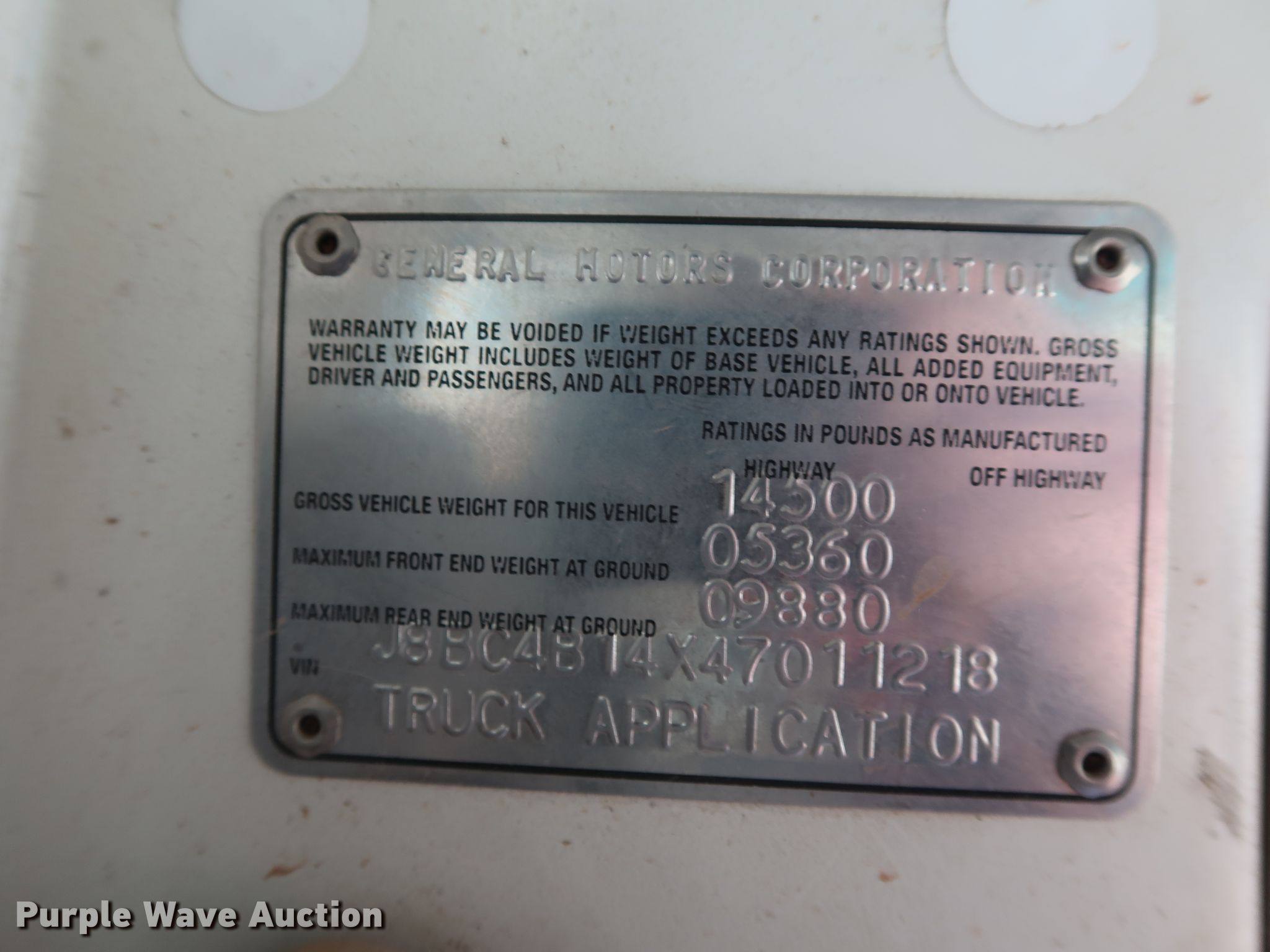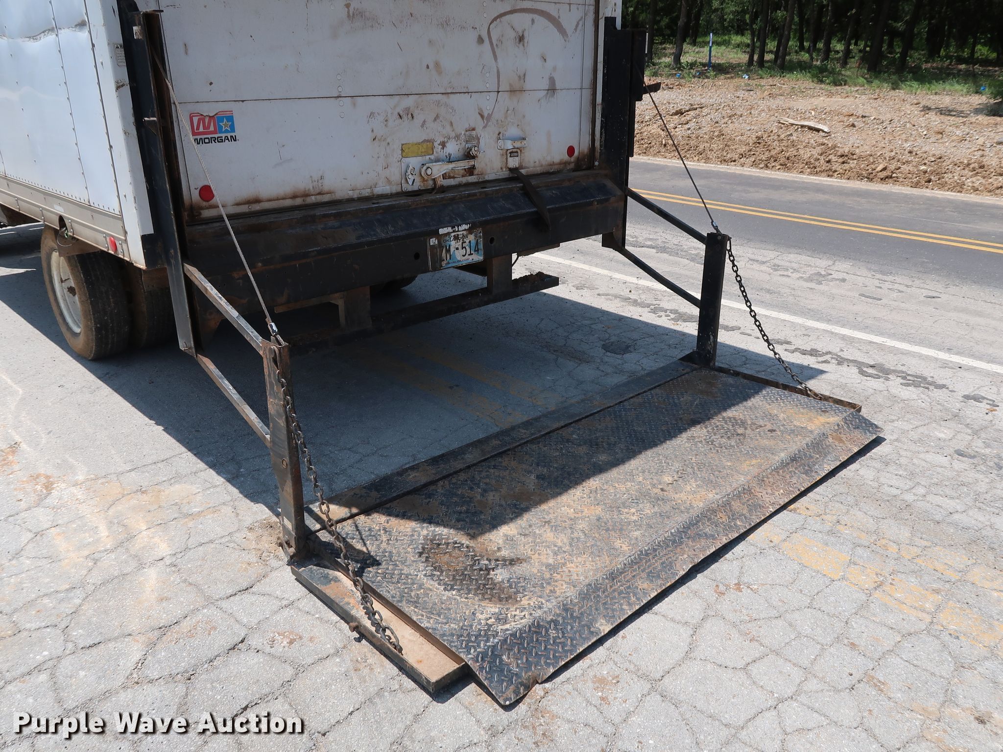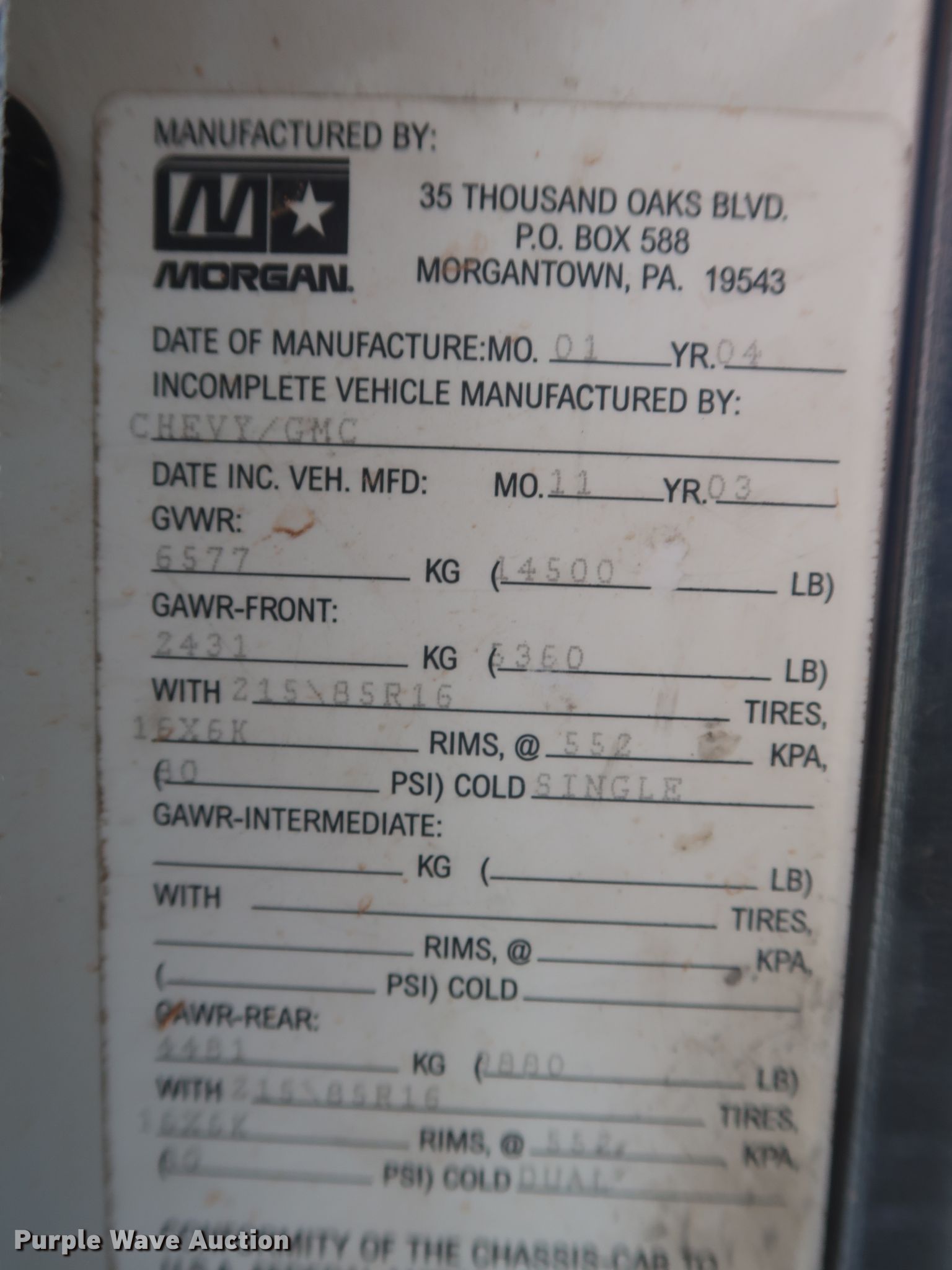 Purple Wave is selling a used Box Truck in Oklahoma. This item is a 2004 Chevrolet W4500 box truck with the following: 64,509 miles on odometer, Miles may vary, unit still in use, 4.8L L6 diesel engine, Automatic transmission, Single axle, AC and heat, Morgasn GVSD08514FT box bed, 14'L x 90"W, Wood floor, Serial MAZ04VB22953001, Tommy Gate end gate lift, Spring suspension, Hydraulic brakes, LT215/85R16 tires, GVWR 14,500 lbs, Windshield cracked, Contents not included