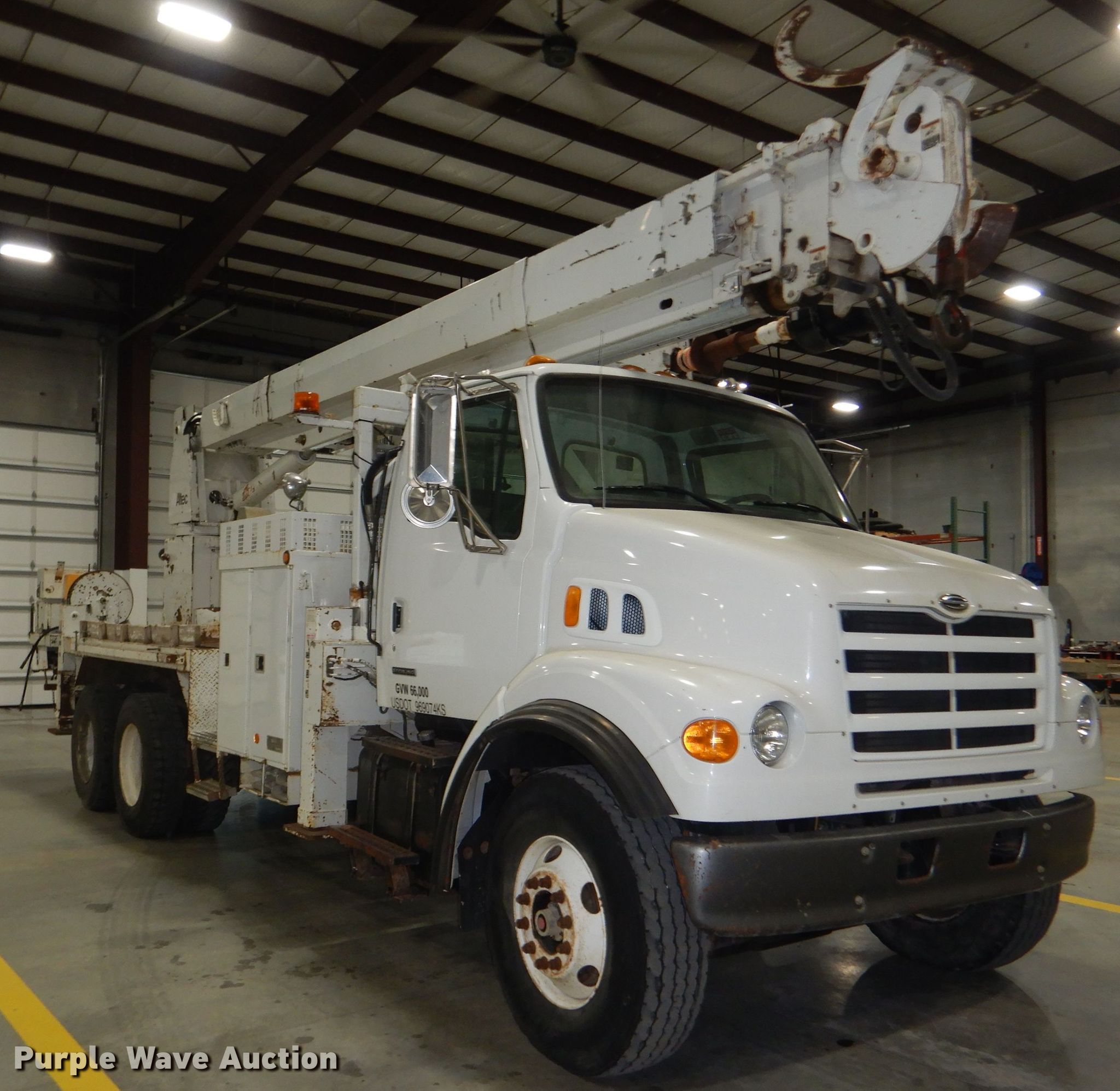 Purple Wave is selling a used Digger Derrick Truck in Kansas. This item is a 2000 Sterling LT7500 digger derrick truck with the following: 169,415 miles on odometer, 17,866 hours on meter, Caterpillar 3126 7.2L L6 diesel engine, 275 HP, Allison automatic transmission, Tandem axle, AC and heat, PTO, Altec 15'L utility bed, Altec D3060TR digger derrick, 60' boom length, Ground controls, Remote control, Insulated, telescopic boom, Pole guide, Rope winch, 15,000 lbs capacity,, 20" diameter auger, Spring over walking beam suspension, Air brakes, 19' wheelbase, 315/80R22.5 front tires, 11R22.5 rear tires, GVWR 53,220 lbs