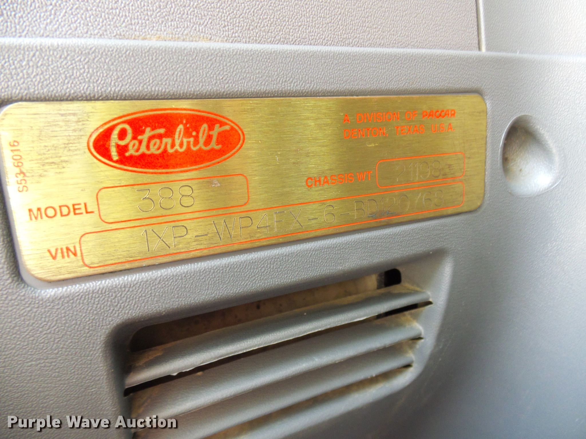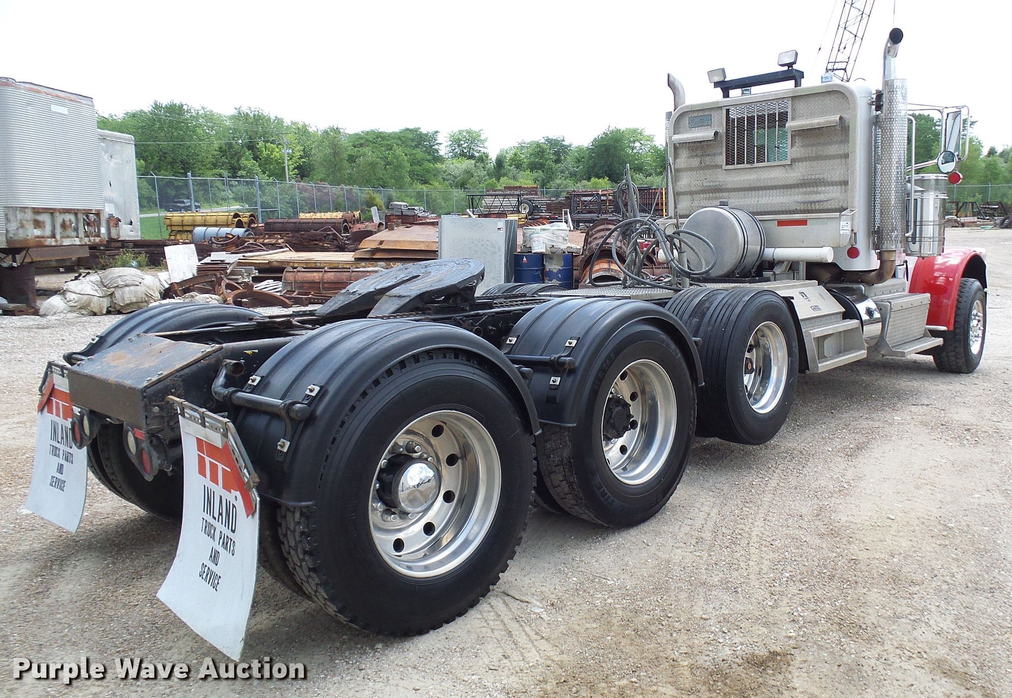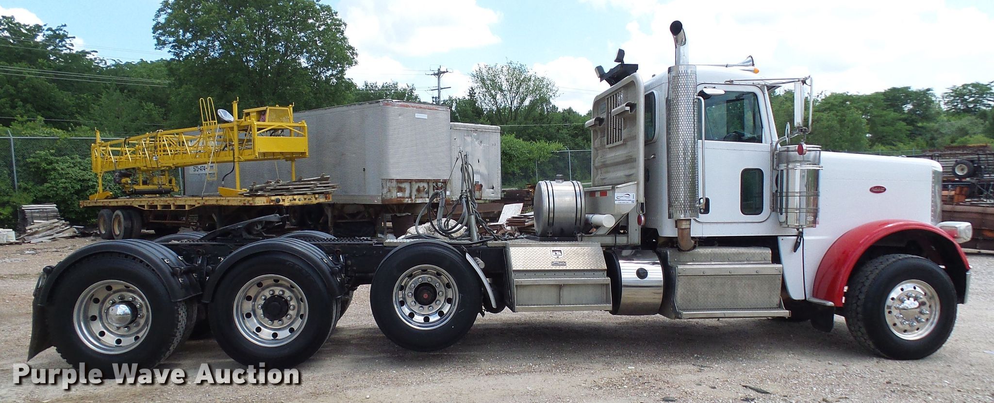 Purple Wave is selling a used Truck Tractor in Missouri. This item is a 2011 Peterbilt 388 semi truck with the following: 429,913 miles on odometer, 13,963 hours on meter, Cummins ISX15 14.9L six cylinder diesel, Manual tranmission, Inter-axle differential lock, Triple axle, AC and heat, Cruise, Power windows and locks, PTO, Wet kit, Aluminum deck plate, Sliding fifth wheel plate, Single fuel tank, Air suspension, Air brakes, Aluminum wheels, 385/65R22.5 front tires, 11R24.5 tag axle tires, 295/75R22.5 rear tires, GVWR 74,600 lbs, Engine overhauled at 282,848 miles on 03/2017, Bearing in back of transmission replaced at 392,292 miles on 10/2018, Remanufactured DPF installed at 405,871 miles on 01/2019, Charge air cooler replaced at 418,401 miles on 04/2019