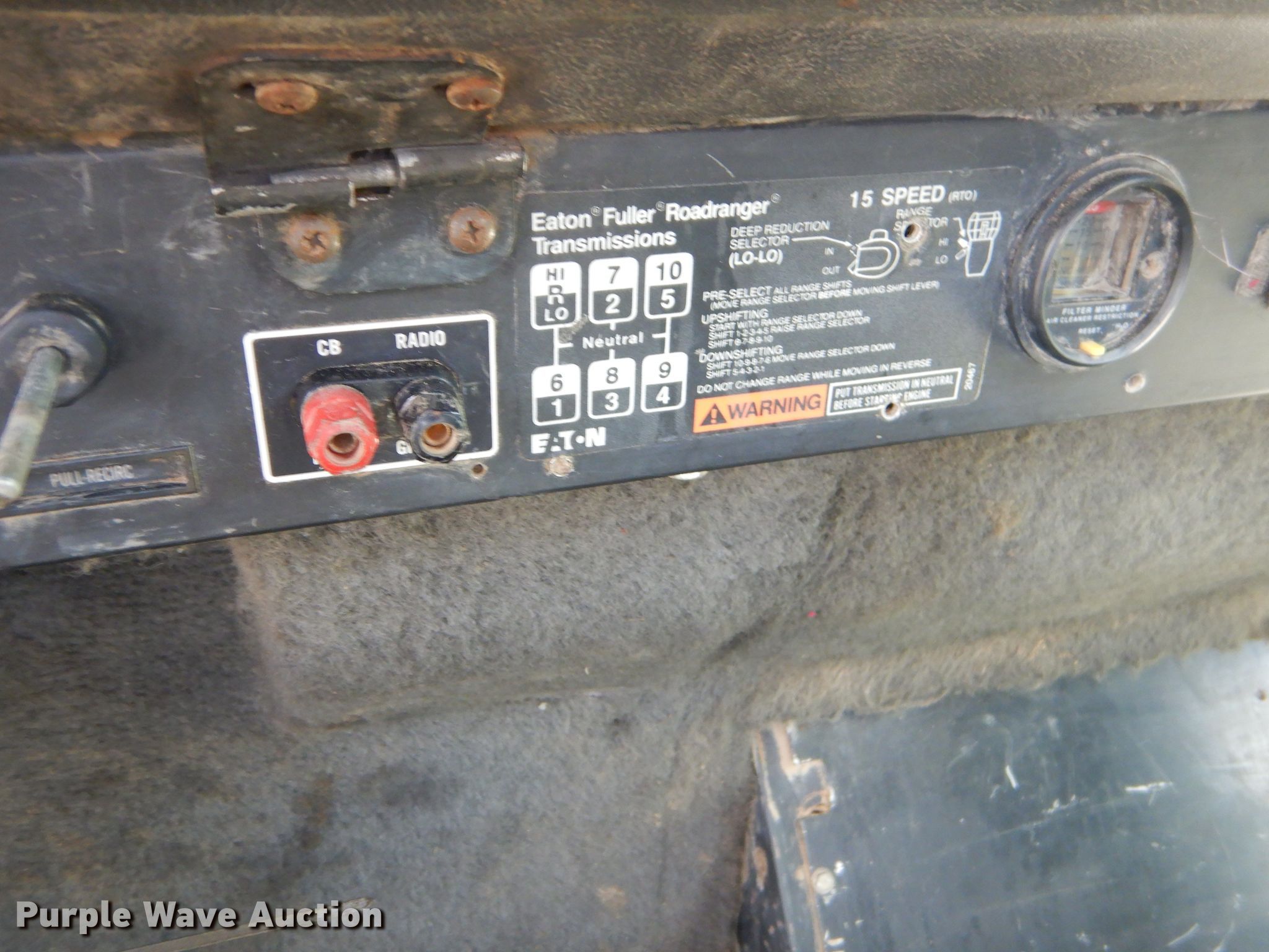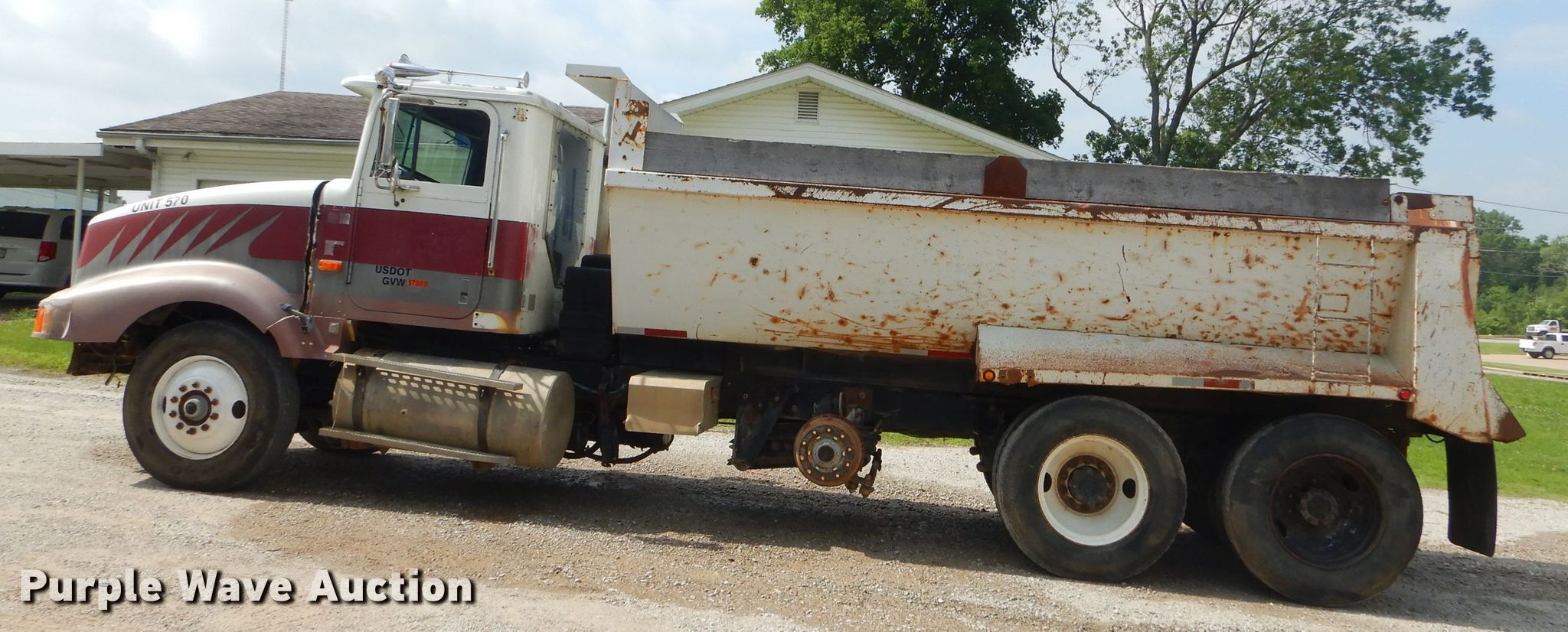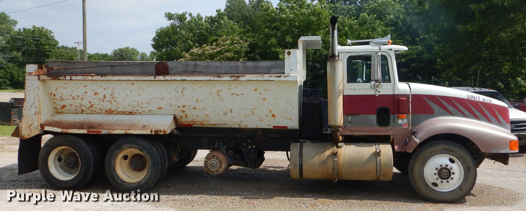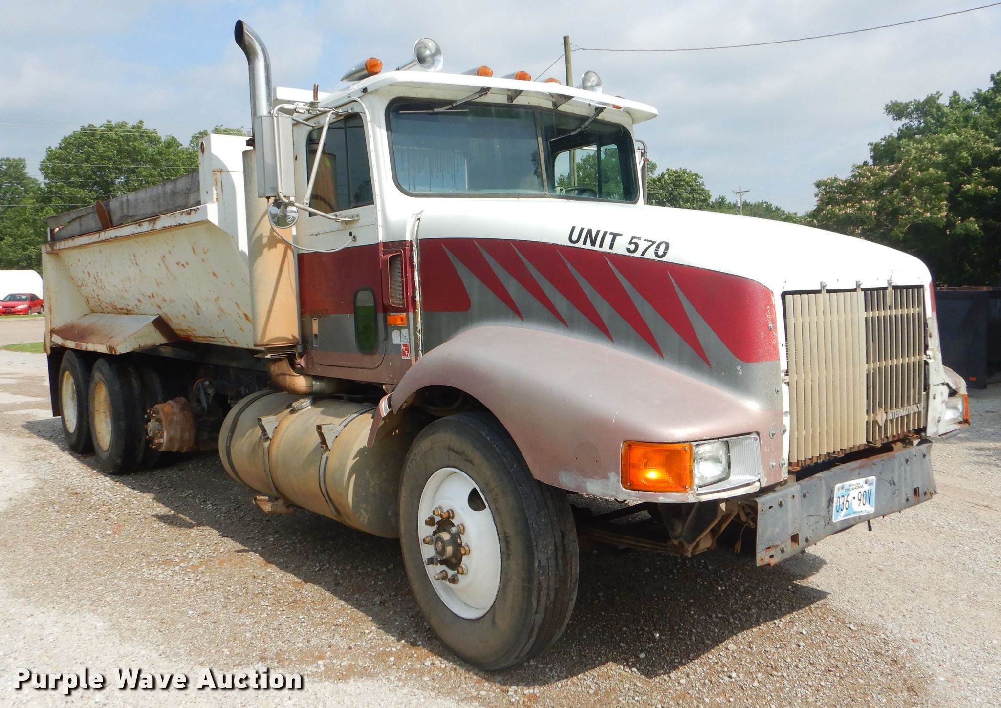 Purple Wave is selling a used Construction Dump Truck in Oklahoma. This item is a 1990 International 9400 dump truck with the following: 252,629 miles on odometer, Cummins 12.0L L6 diesel engine, 10 speed manual transmission, Tandem axle, AC and heat, Power windows, Heated mirrors, Telescoping steering wheel, PTO, 17'L x 96"W steel dump bed, 36" side height, 10" side board height, Single ram hoist, Air operated end gate, 244" wheelbase, Air brakes, 11R24.5 tires, GVWR 57,000 lbs, Windshield chipped, One fuel cell inoperable
