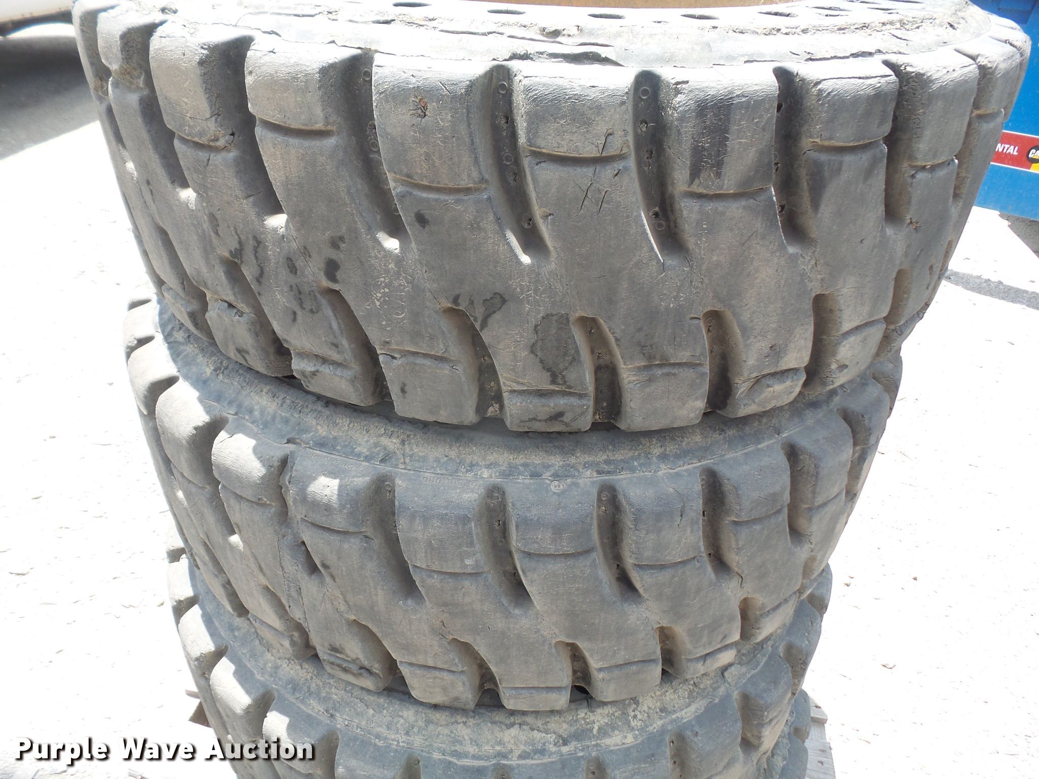 (4) 12-16.5 solid skid steer tires and wheels | SOLD! July 25 Construction Equipment Auction