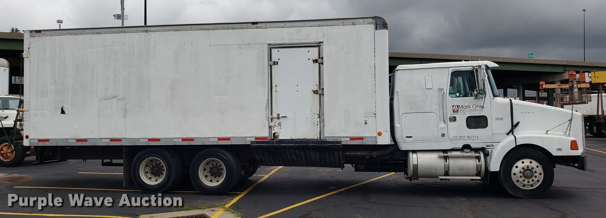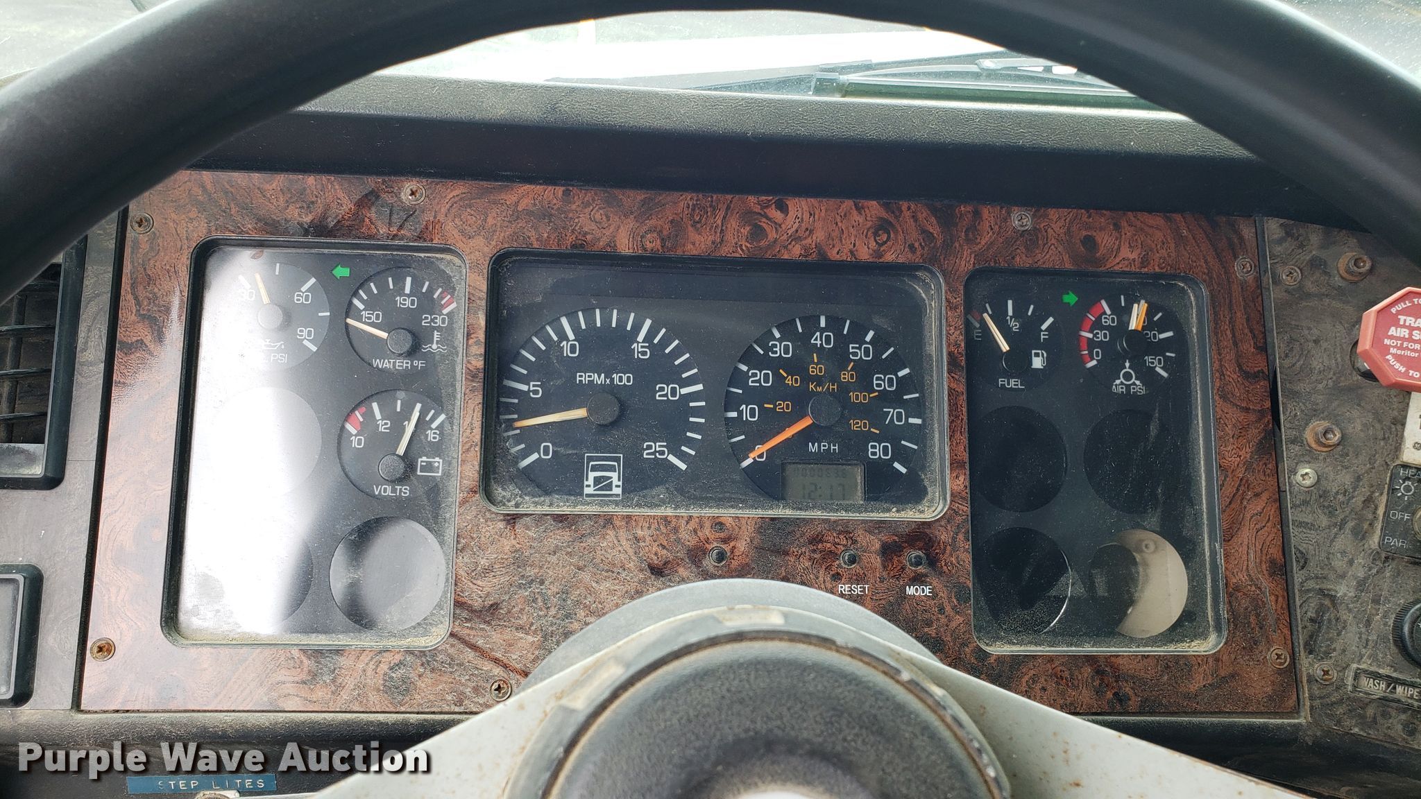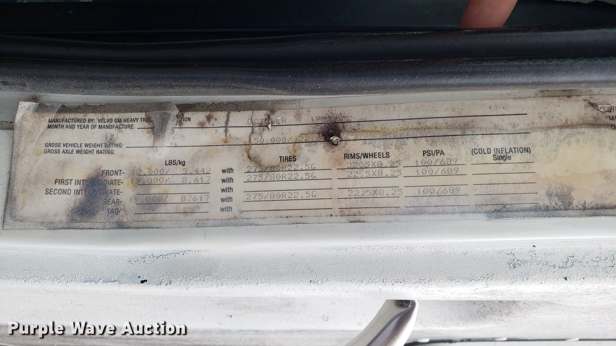 Purple Wave is selling a used Box Truck in Missouri. This item is a 1993 White GMC WCM box truck with the following: 64 miles on odometer, Actual mileage unknown, Caterpillar 3176 10.3L L6 diesel engine, Eaton Fuller manual transmission, Tandem axle, Heat, Sleeper, 32"L, 26.5'L x 100"W box bed, 97"H, Wood floor, Air brakes, Air suspension, 295/75R22.5 front tires, 275/80R22.5 rear tires, GVWR 50,000 lbs, Contents not included, Unit# 9306