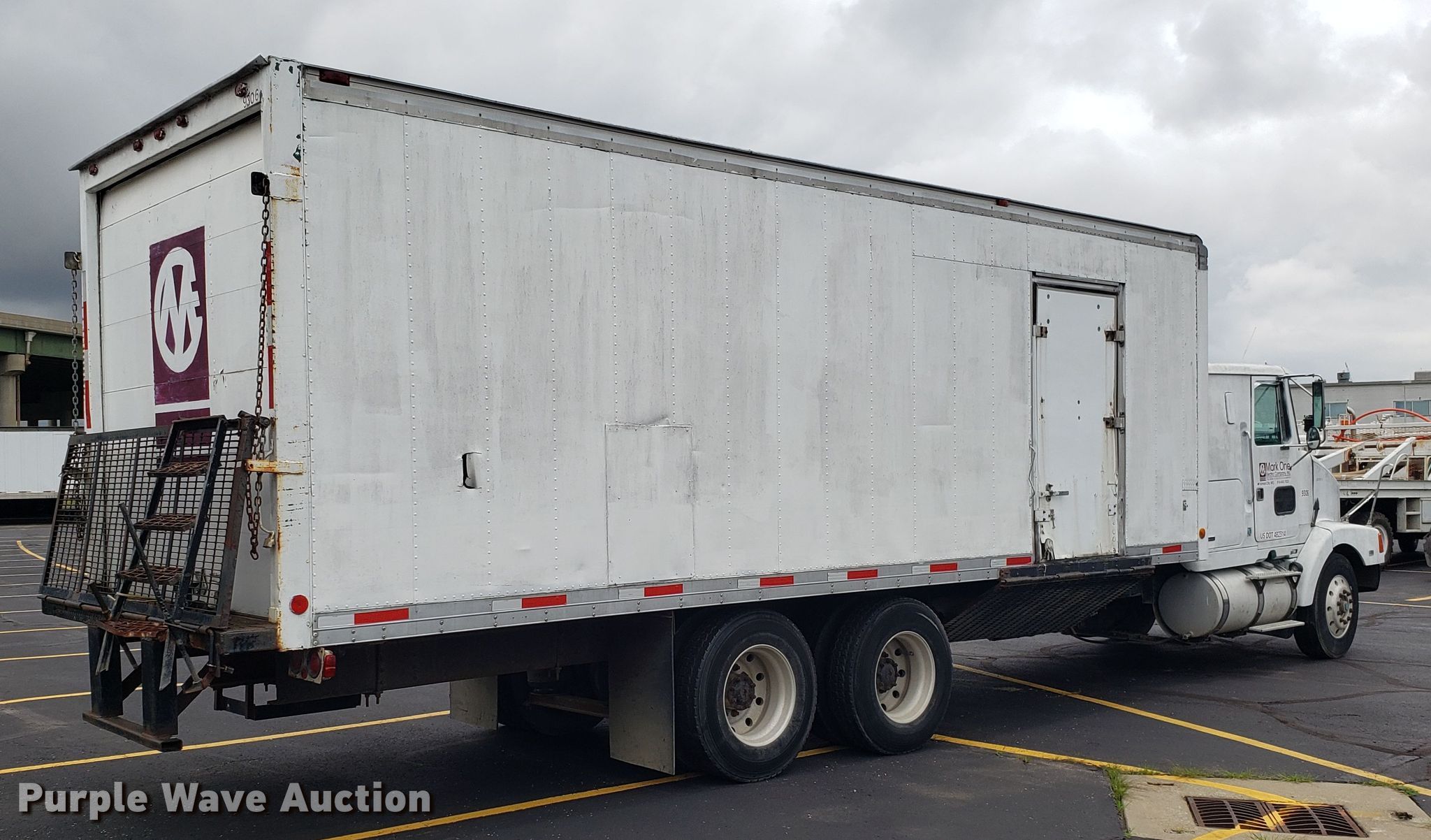 1993 White GMC WCM box truck. 64 miles on odometer Actual mileage unknown, Caterpillar 3176 10.3L L6 diesel engine, Eaton Fuller manual transmission, Tandem axle, Heat, Sleeper 32"L, 26.5'L x 100"W box bed 97"H, Wood floor, Air brakes, Air suspension , 295/75R22.5 front tires, 275/80R22.5 rear tires, GVWR 50,000 lbs, Contents not included, Unit# 9306. Missouri title. 4V1WDBDFXPN659565. Mark One Electric Co Inc.. 1414 Genessee St. Kansas City, MO 64102