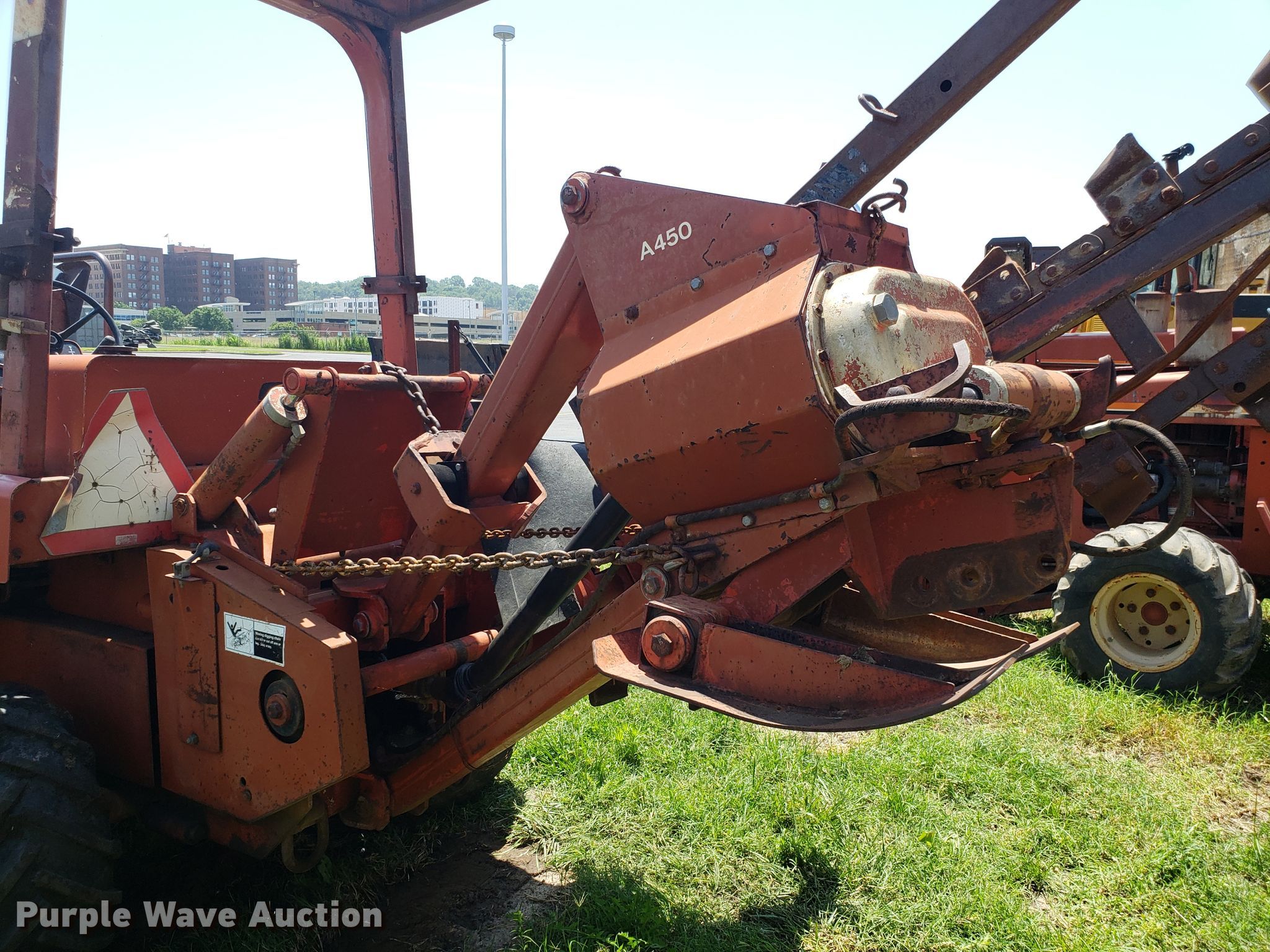 Purple Wave is selling a used Trencher or Rock Saw in Missouri. This item is a 1988 Ditch Witch 4010 trencher with the following: 4,578 hours on meter, Three cylinder diesel engine, Four speed manual transmission, Four wheel drive, OROPS, Trencher model A450, 72" boom length, 6" cutting width, Dirt teeth, Serial 430757, Vibratory plow, Backhoe model A420, 18"W bucket, Serial 1G0124, Four-way backfill blade, 13 x 15.50 x 15 tires, Starter solenoid must be crossed to start, Serial 6E0608
