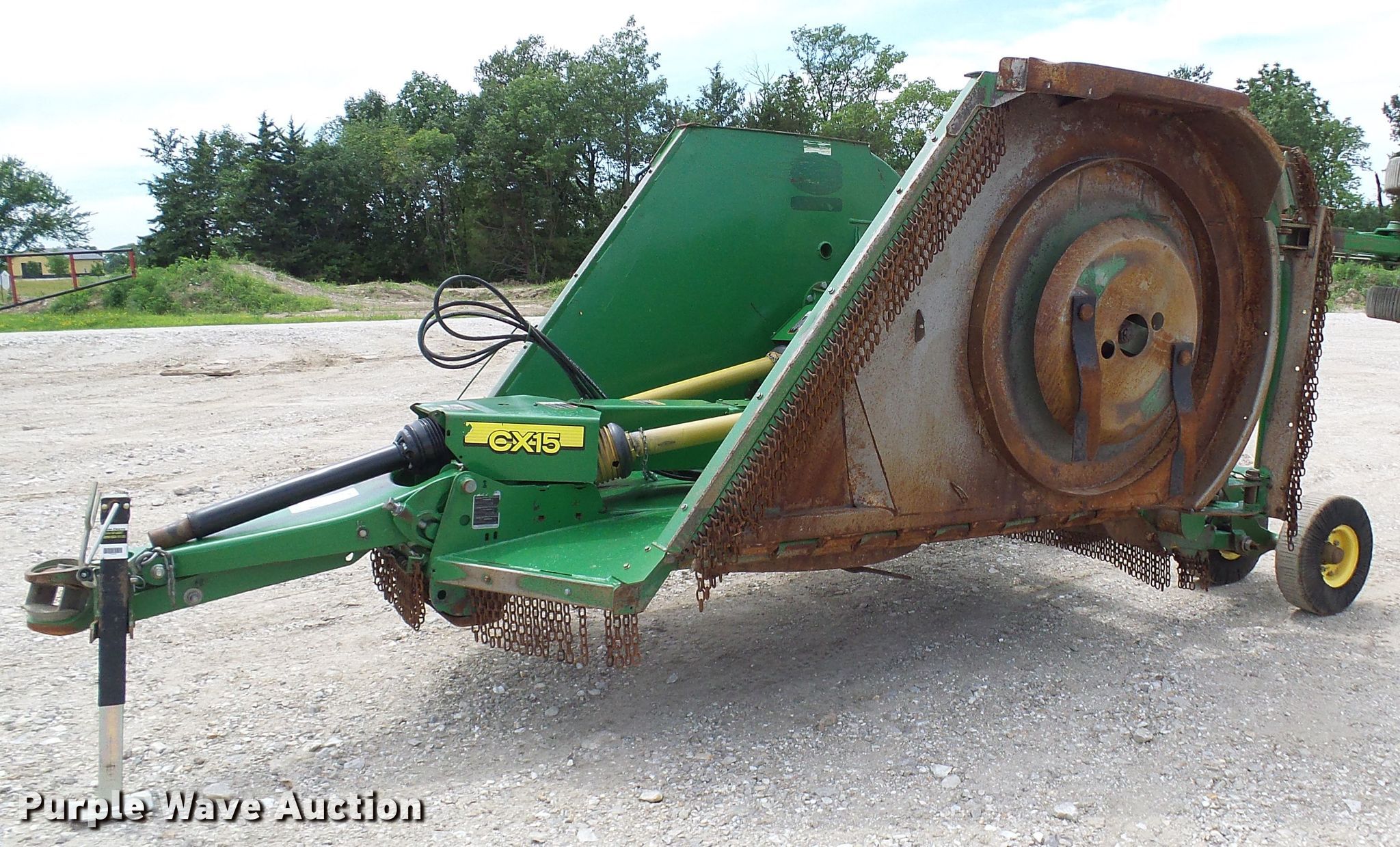 John Deere CX15 batwing rotary mower. 15'W, Hydraulic lift and fold, 1000 PTO, No PTO shaft end, Serial 1P0CX15FKET044107. Mid-Mo Equipment. 5551 E Missouri 163. Columbia, MO 65201