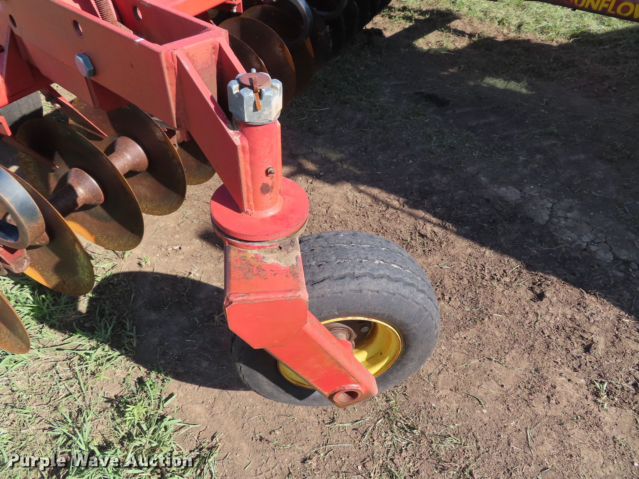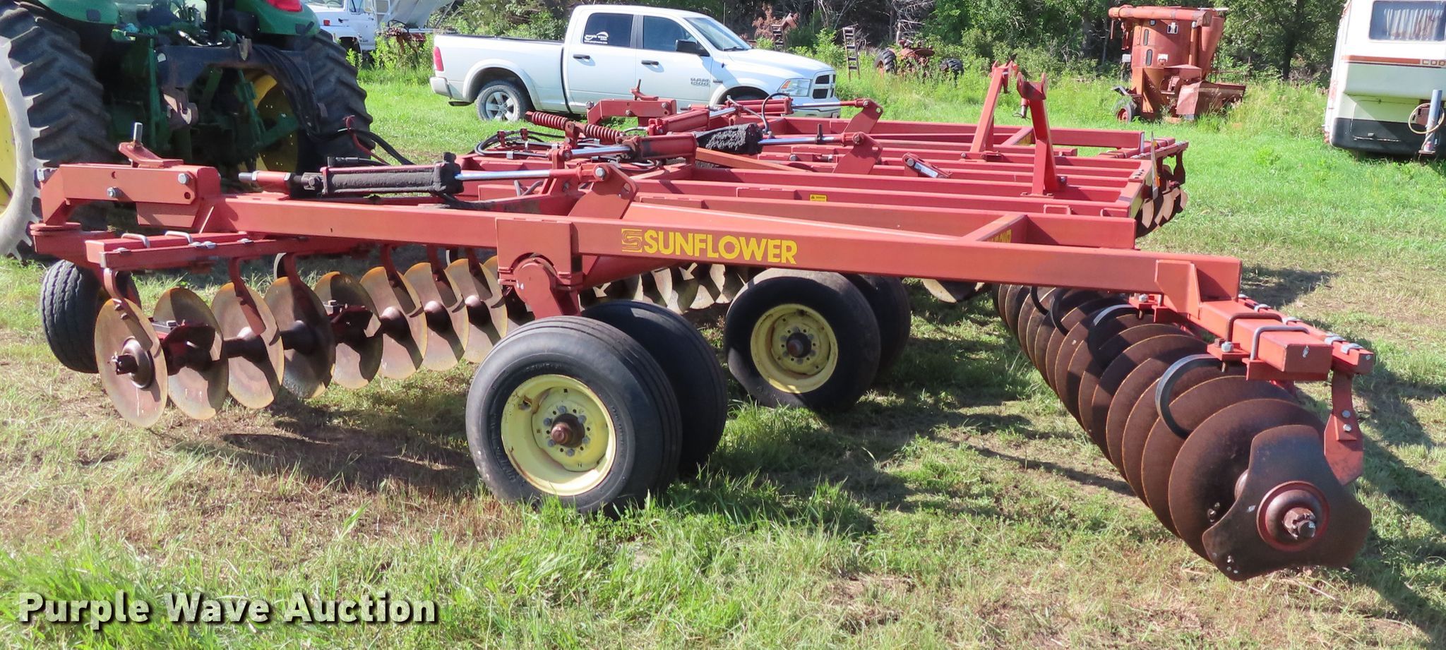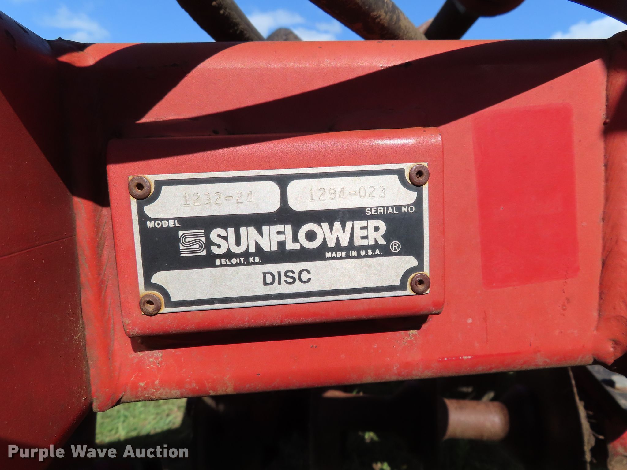 Purple Wave is selling a used Disk in Kansas. This item is a Sunflower 1232 tandem disk with the following: 24'W, (21) diameter disks, 9" spacing, Disk scrapers, Manual leveler, Hydraulic lift and fold, Gauge wheels, 9.5L-15 tires, Serial 1294-023