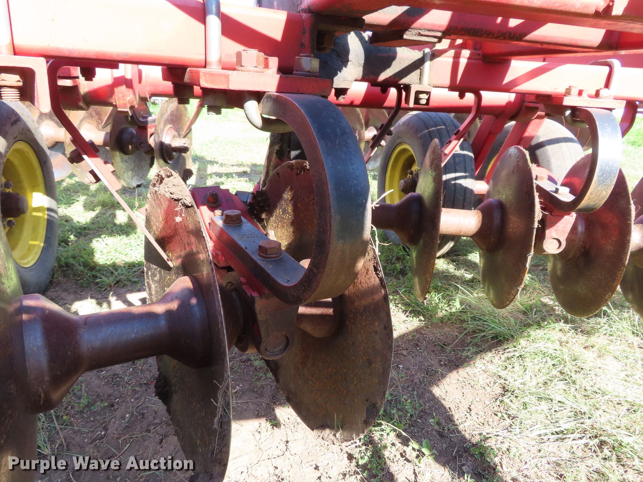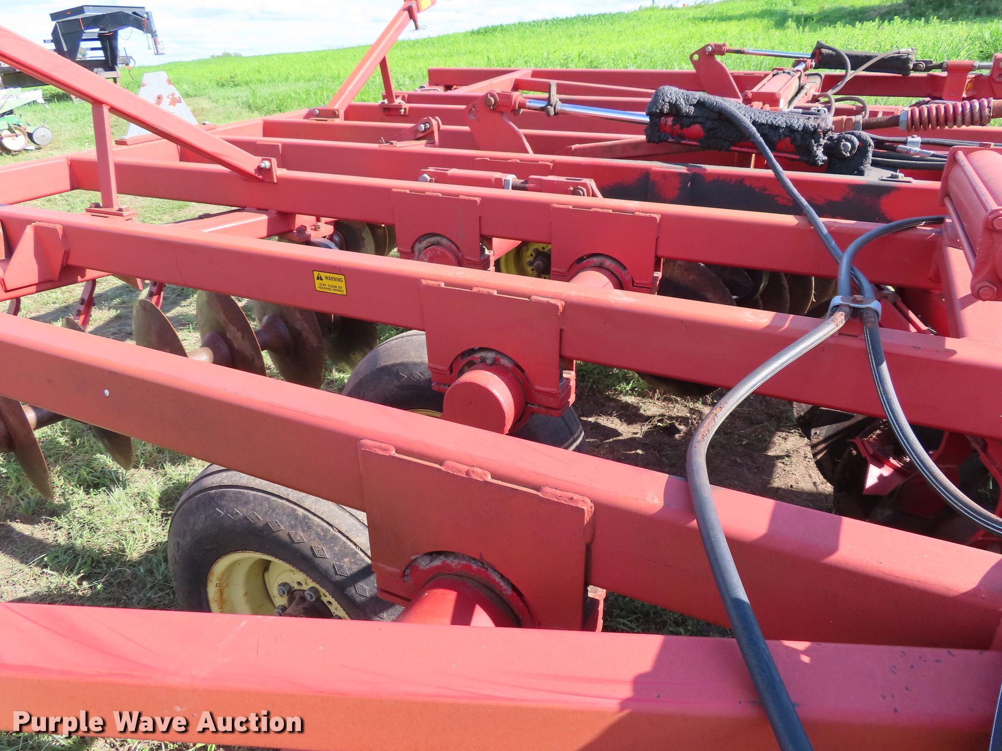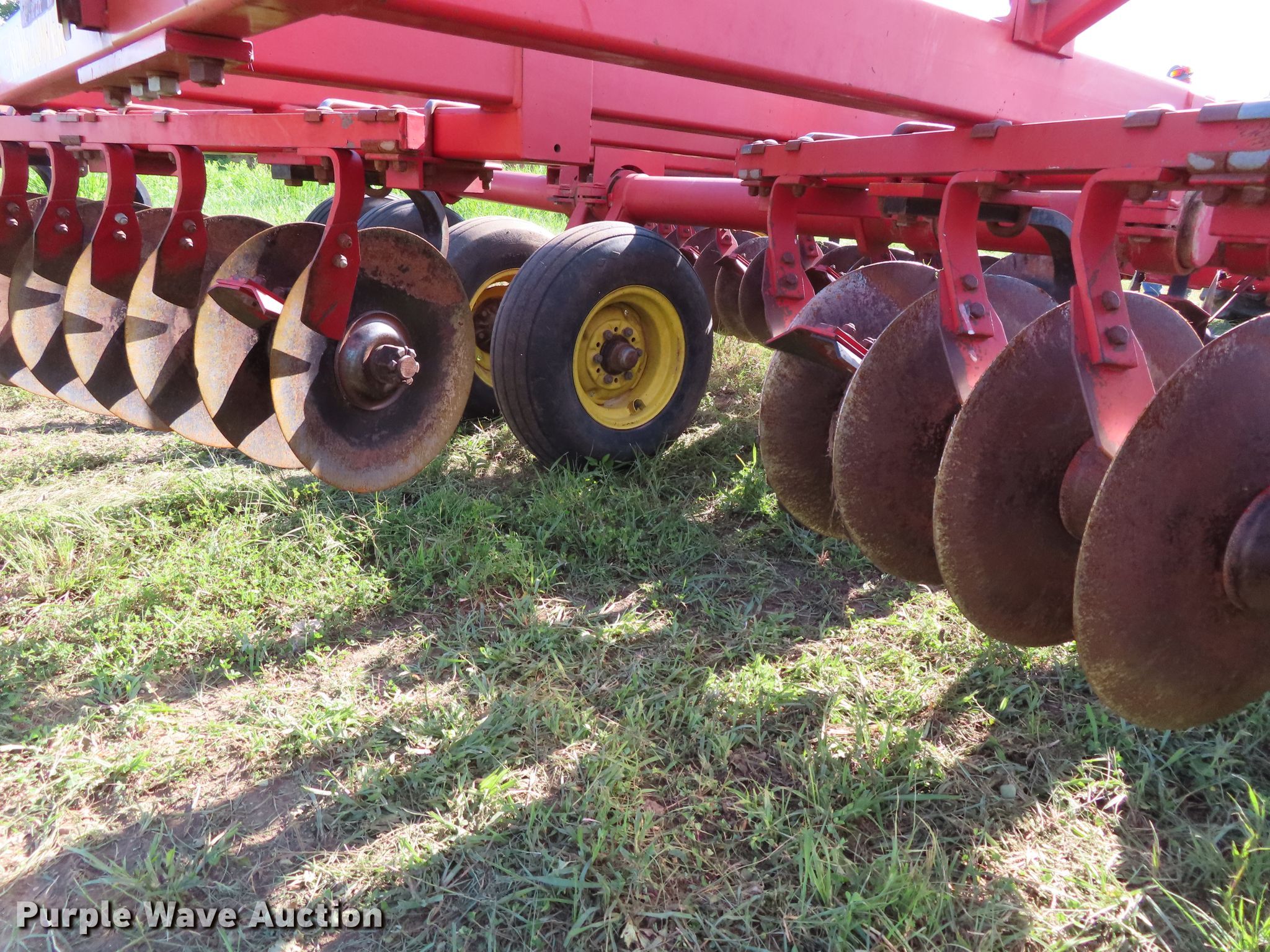 Purple Wave is selling a used Disk in Kansas. This item is a Sunflower 1232 tandem disk with the following: 24'W, (21) diameter disks, 9" spacing, Disk scrapers, Manual leveler, Hydraulic lift and fold, Gauge wheels, 9.5L-15 tires, Serial 1294-023
