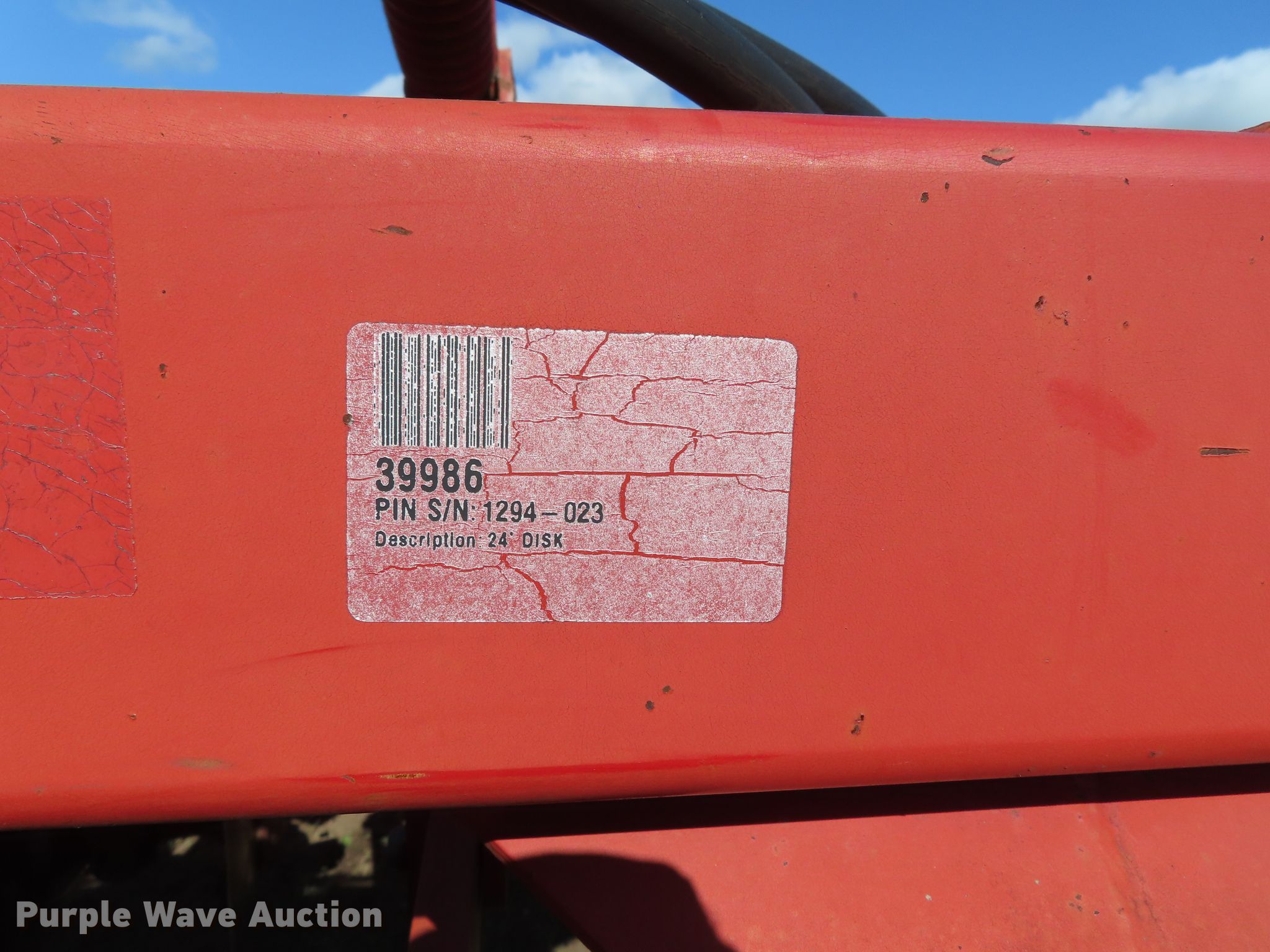 Sunflower 1232 tandem disk. 24'W, (21) diameter disks, 9" spacing, Disk scrapers, Manual leveler, Hydraulic lift and fold, Gauge wheels, 9.5L-15 tires, Serial 1294-023. Alma, KS 66401