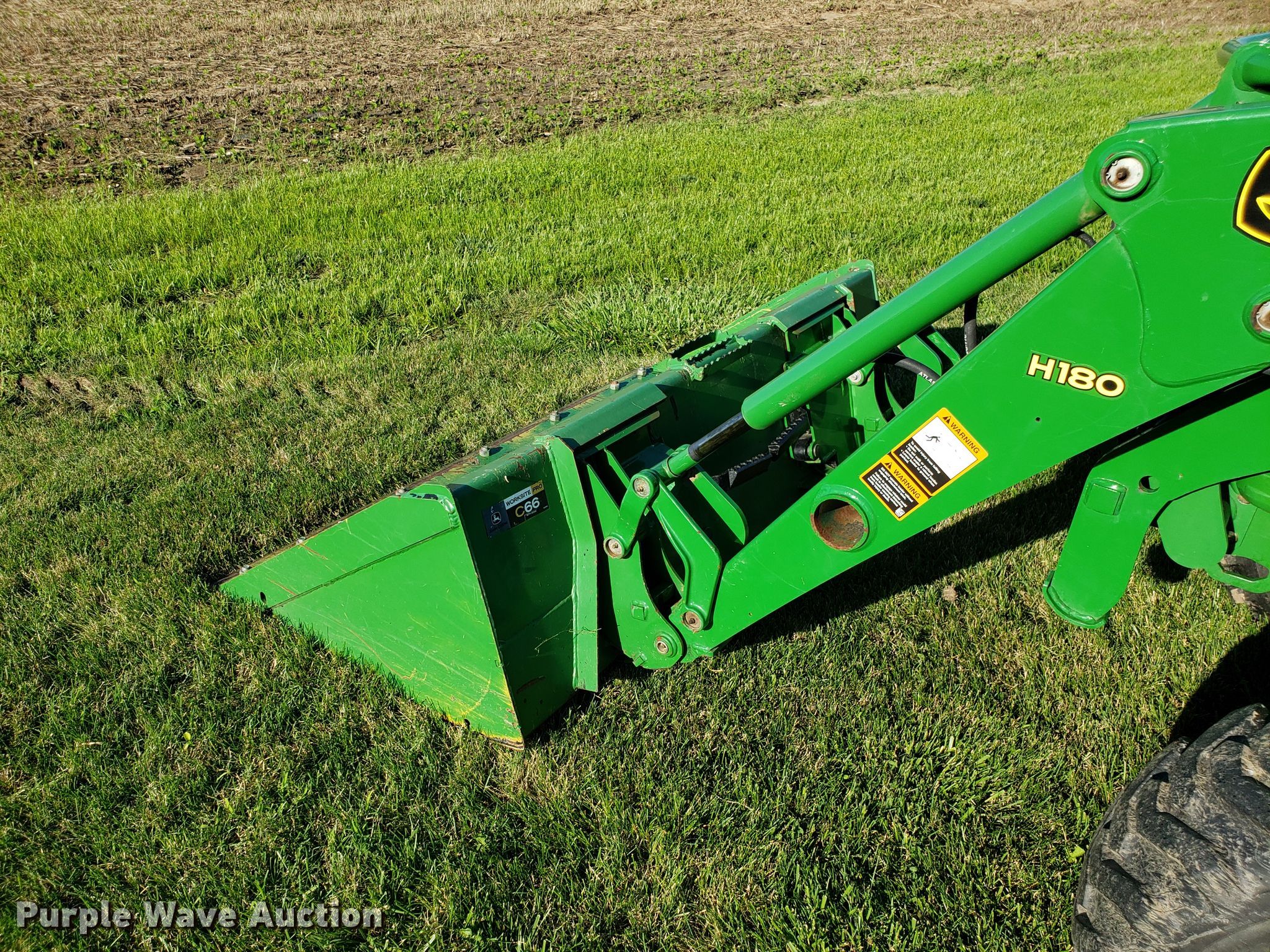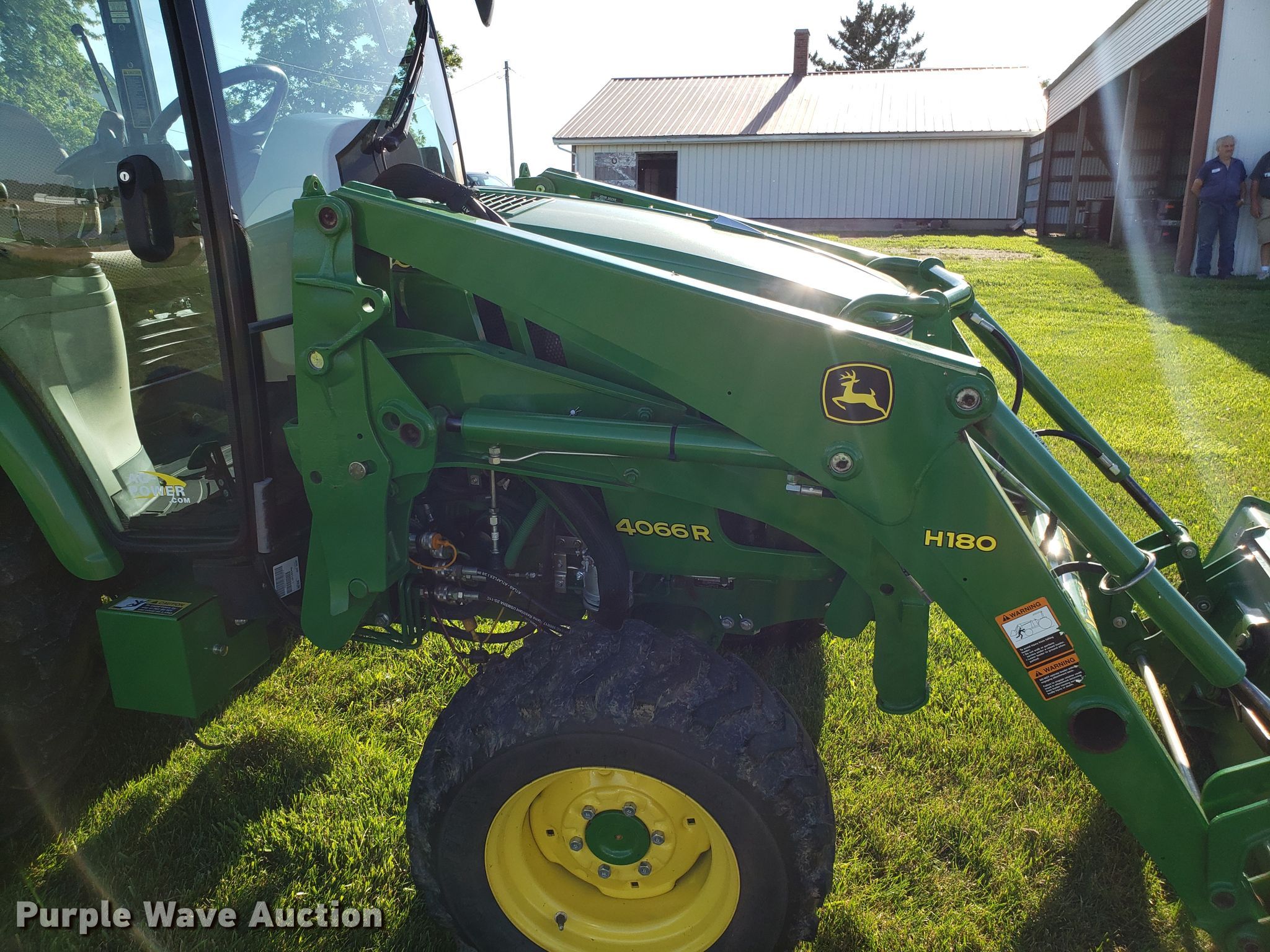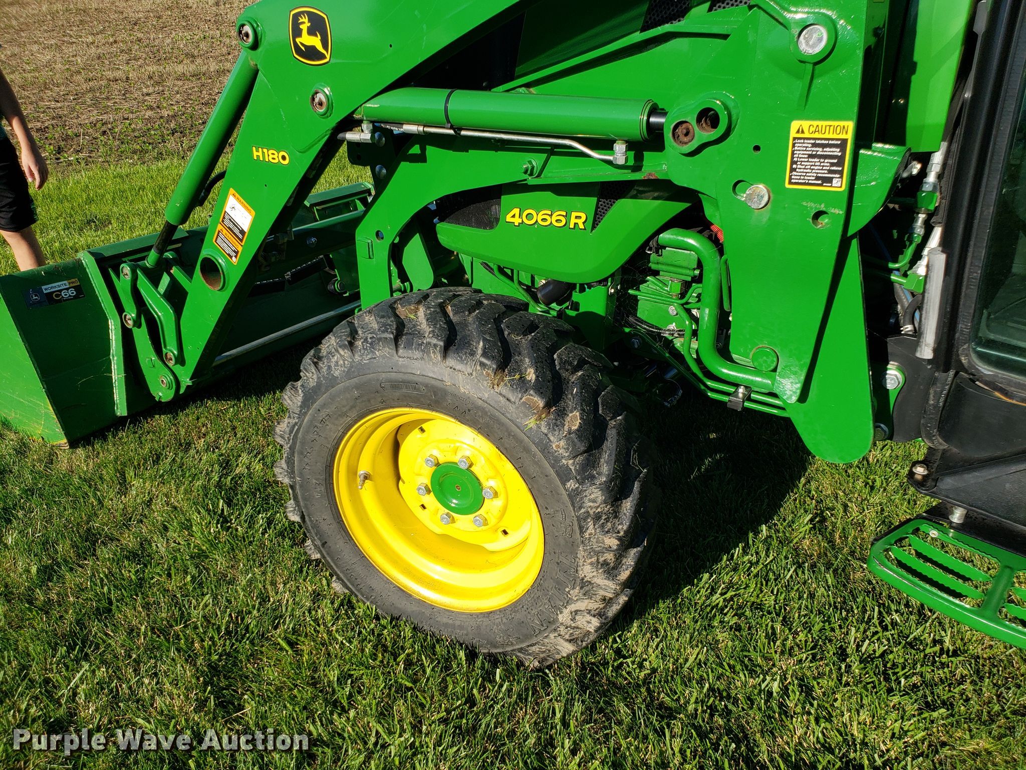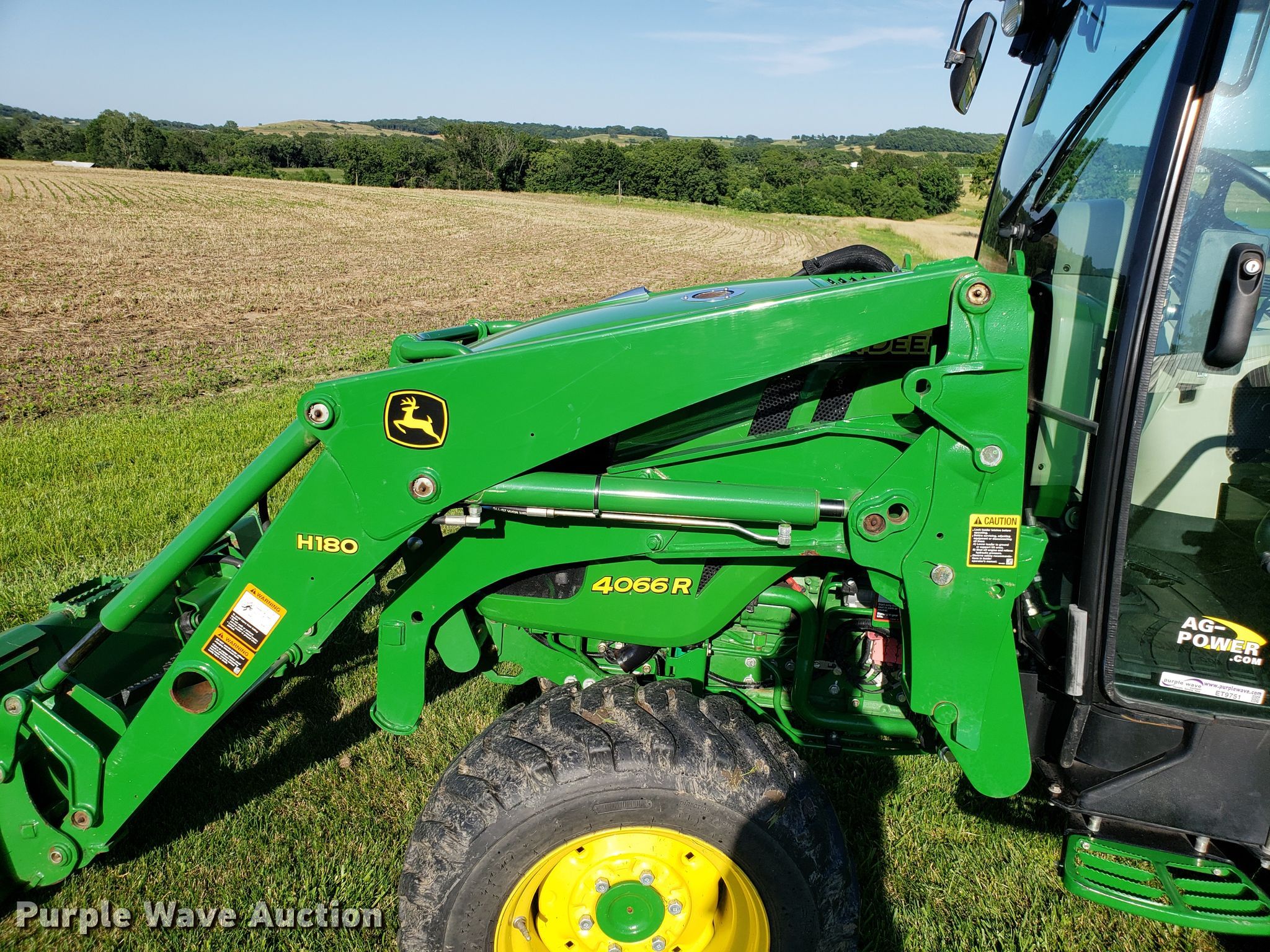 Purple Wave is selling a used Tractor in Missouri. This item is a 2015 John Deere 4066R MFWD tractor with the following: 547 hours on meter, John Deere three cylinder diesel engine, Hydrostatic transmission, Differential lock, AC and heat, AM/FM, John Deere H180 loader, 66"W bucket, Quick attach, Skid steer quick attach, Joystick controls, Serial 1P0H180XEED002038, Three point, Top link, 540 PTO, (3) front hydraulic remote sets, Rear hydraulic remote set, Hitch assist, Auxiliary hitch control, 10x16.5 front tires, 16.9x24 rear tires, Tires have liquid ballast weight, Serial 1LV4066RAEH140003