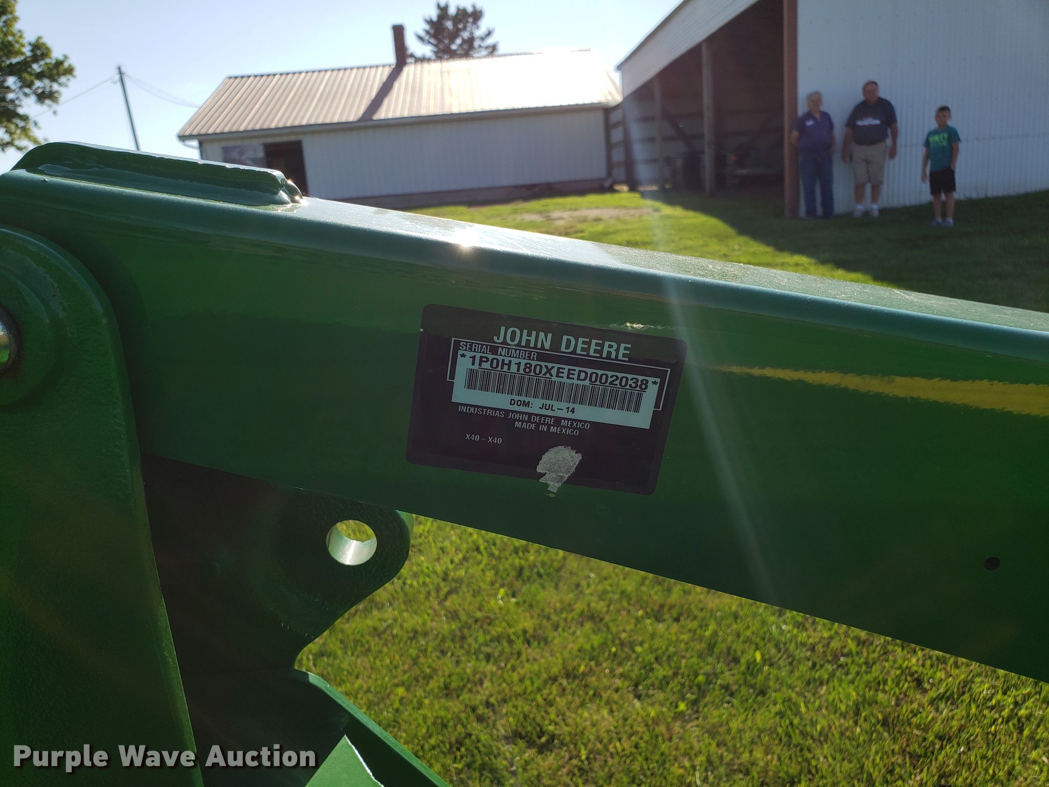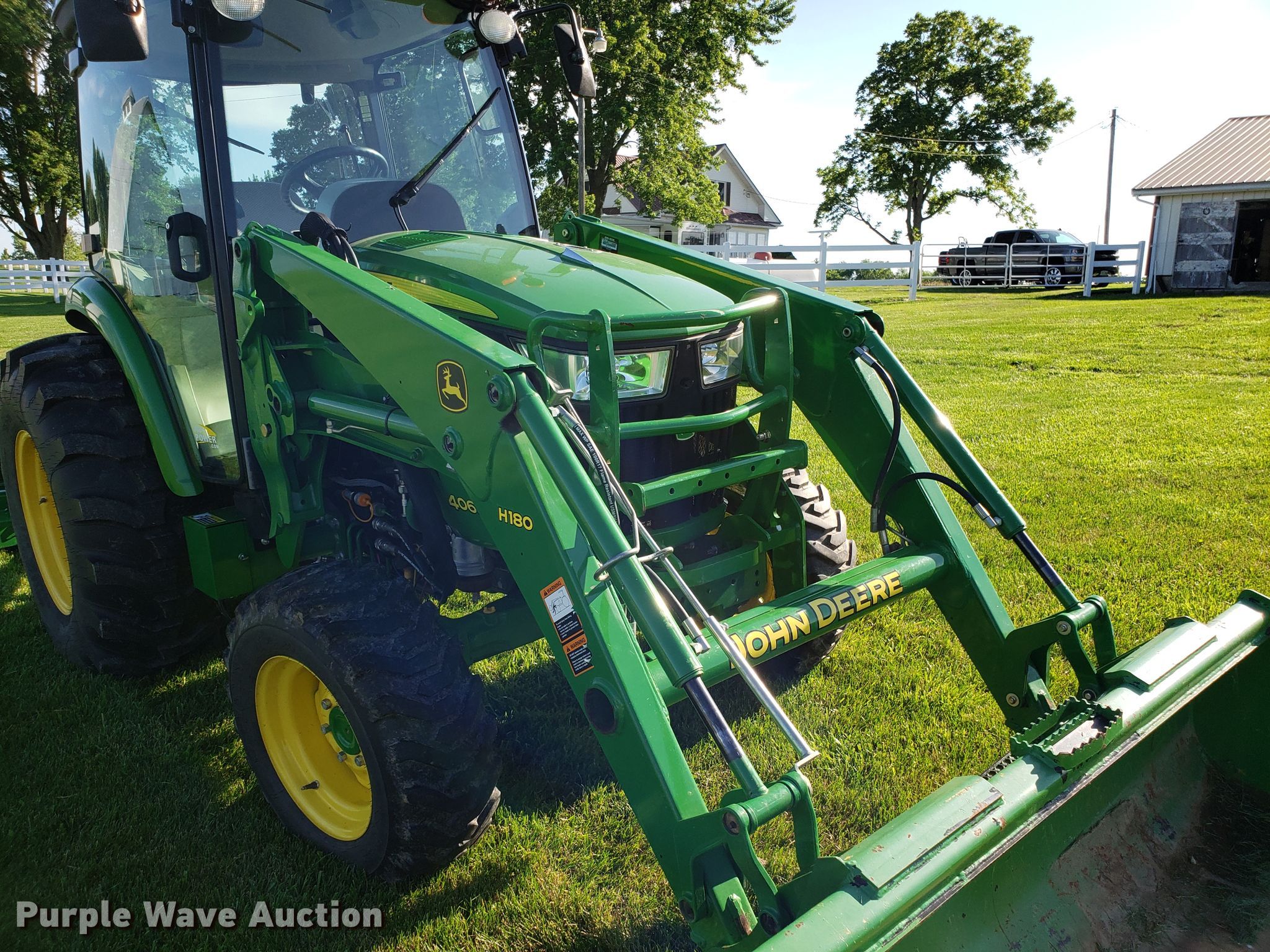 2015 John Deere 4066R MFWD tractor. 547 hours on meter, John Deere three cylinder diesel engine, Hydrostatic transmission, Differential lock, AC and heat, AM/FM, John Deere H180 loader 66"W bucket, Quick attach, Skid steer quick attach, Joystick controls, Serial 1P0H180XEED002038, Three point Top link, 540 PTO, (3) front hydraulic remote sets, Rear hydraulic remote set, Hitch assist, Auxiliary hitch control, 10x16.5 front tires, 16.9x24 rear tires, Tires have liquid ballast weight, Serial 1LV4066RAEH140003. Odessa, MO 64076