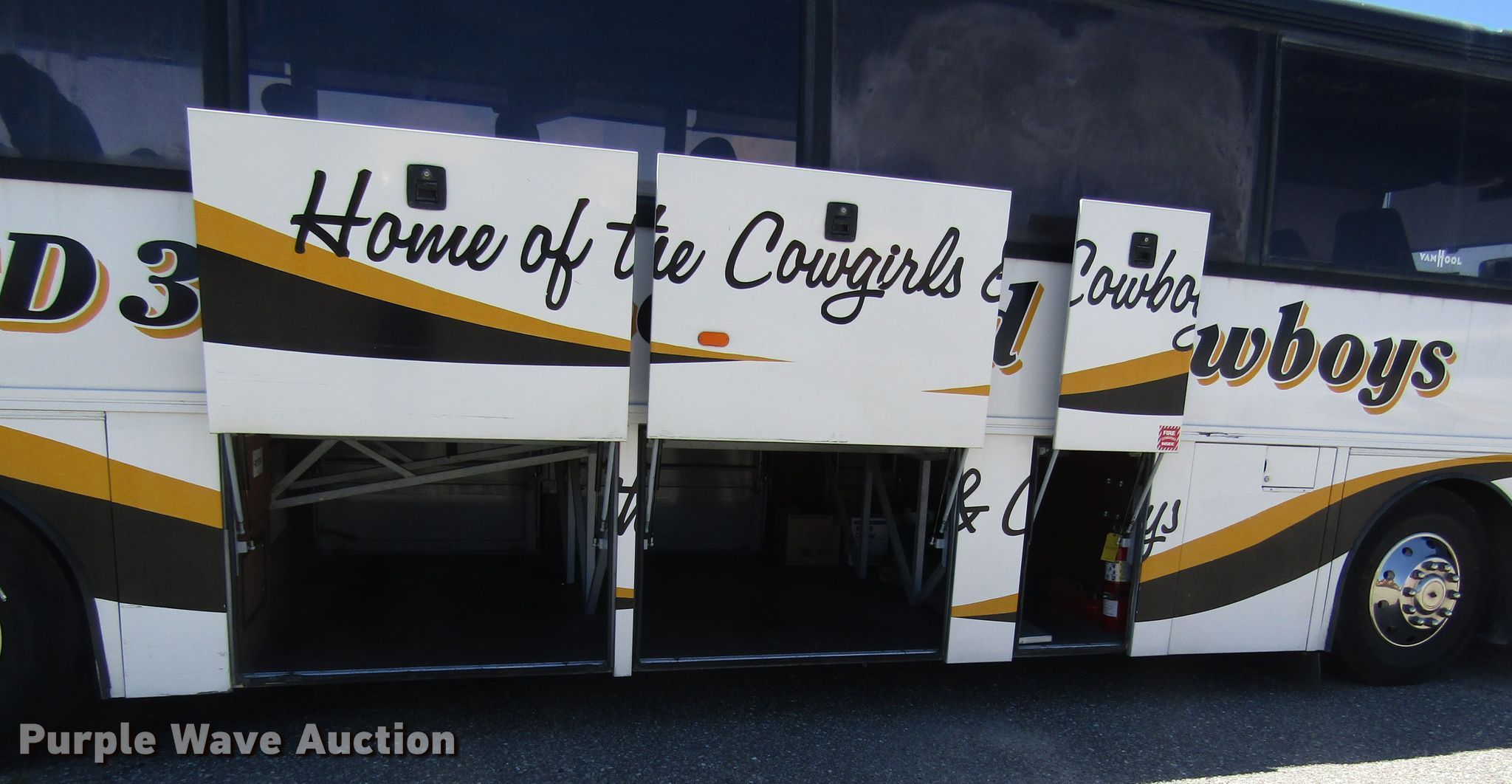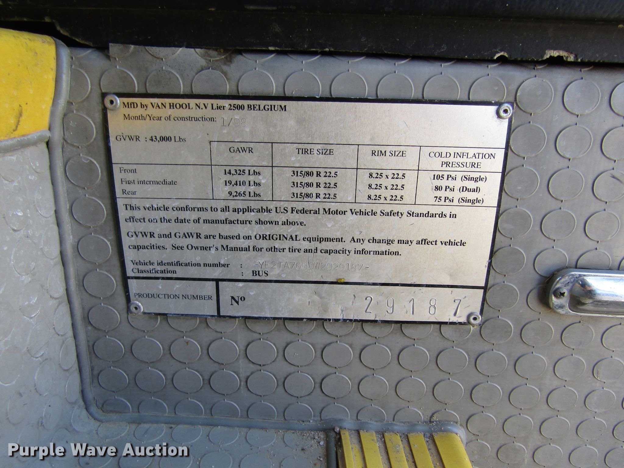 Purple Wave is selling a used Bus in Kansas. This item is a 1998 Van Hool T940 coach bus with the following: 447,159 miles on odometer, Cummins M11 Plus 10.8L L6 diesel engine, 425 HP, Automatic transmission, Single axle, Tag lift axle, AC and heat, Air passenger sliding door, On-board restroom, 48 passenger capacity, Air suspension, Air brakes, 315/80R22.5 tires, GVWR 43,000 lbs, Decals will be painted over prior to auction