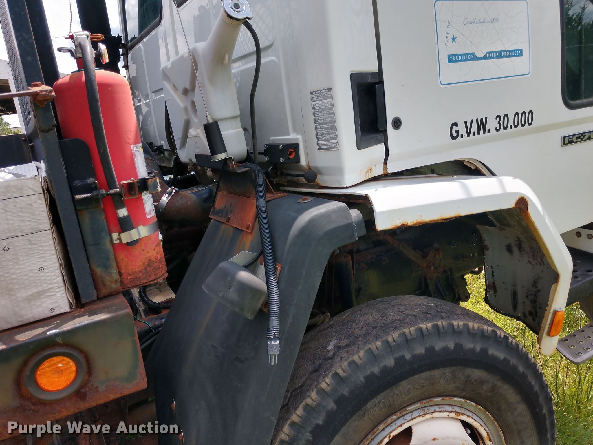 2000 Freightliner FC70 flatbed truck. 36,407 miles on odometer, Cummins ISB 5.9L L6 diesel engine, Automatic transmission, Heat, 171"L x 94.5"W flatbed, 10.00R20 tires, Non-operational unit. Kansas title. 1FV67FAA6YHF84540. City of Augusta. Augusta, KS 67010