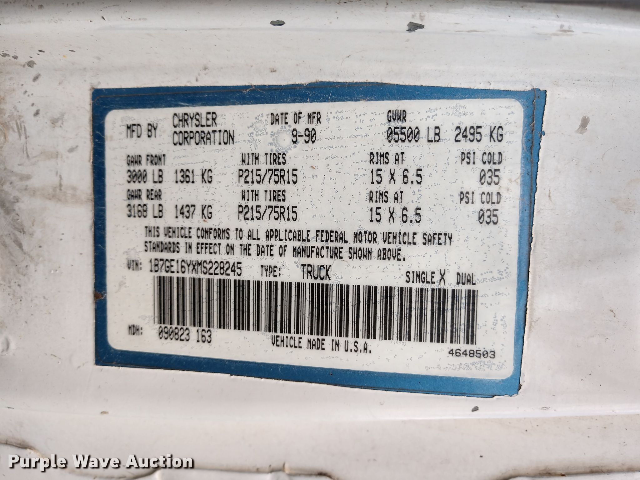 Purple Wave is selling a used 1/2 Ton Pickup or Van in Kansas. This item is a 1991 Dodge D150 pickup truck with the following: 218,753 miles on odometer, 5.2L V8 OHV 16V gas engine, Automatic transmission, 235/75R15 tires, Dash controls missing, Non-operational unit