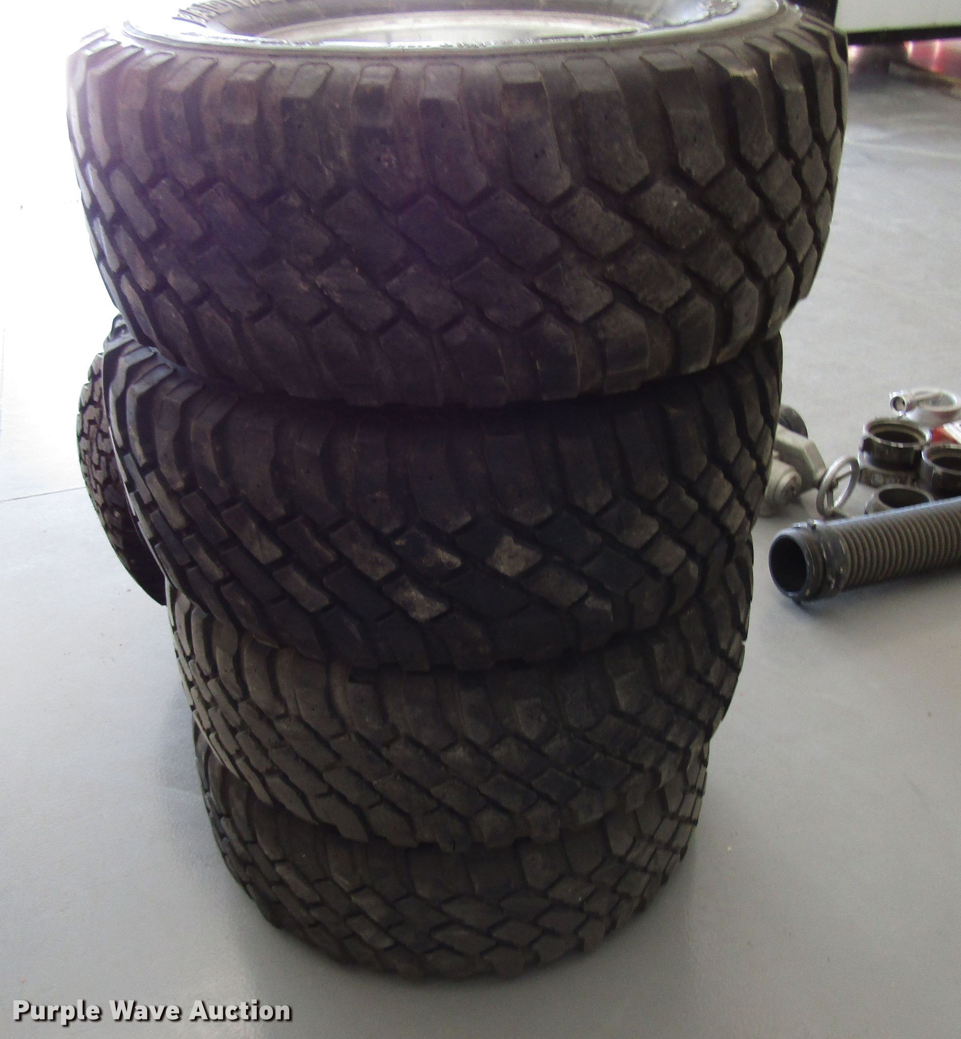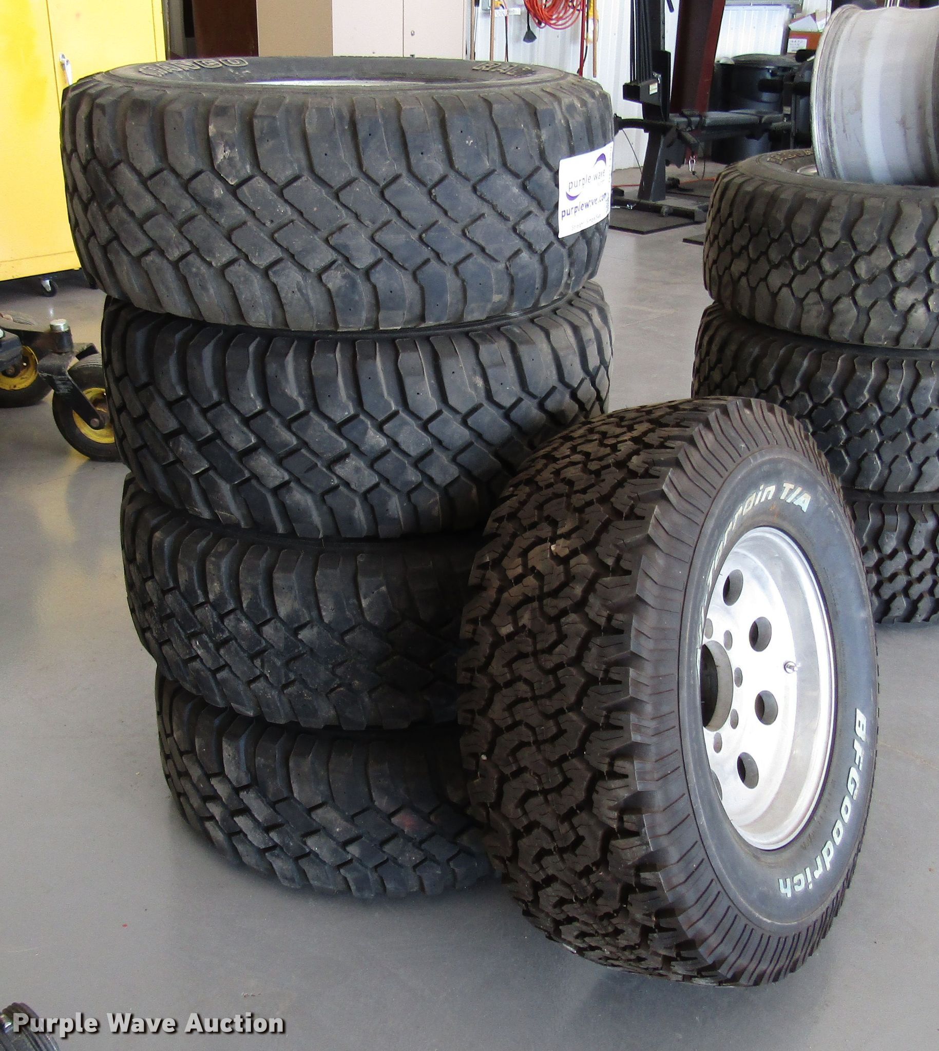 Purple Wave is selling a used Fleet Tires in Kansas. This item is a (5) 33x12.50x16.5 tires and wheels with the following: Dodge eight lug wheels