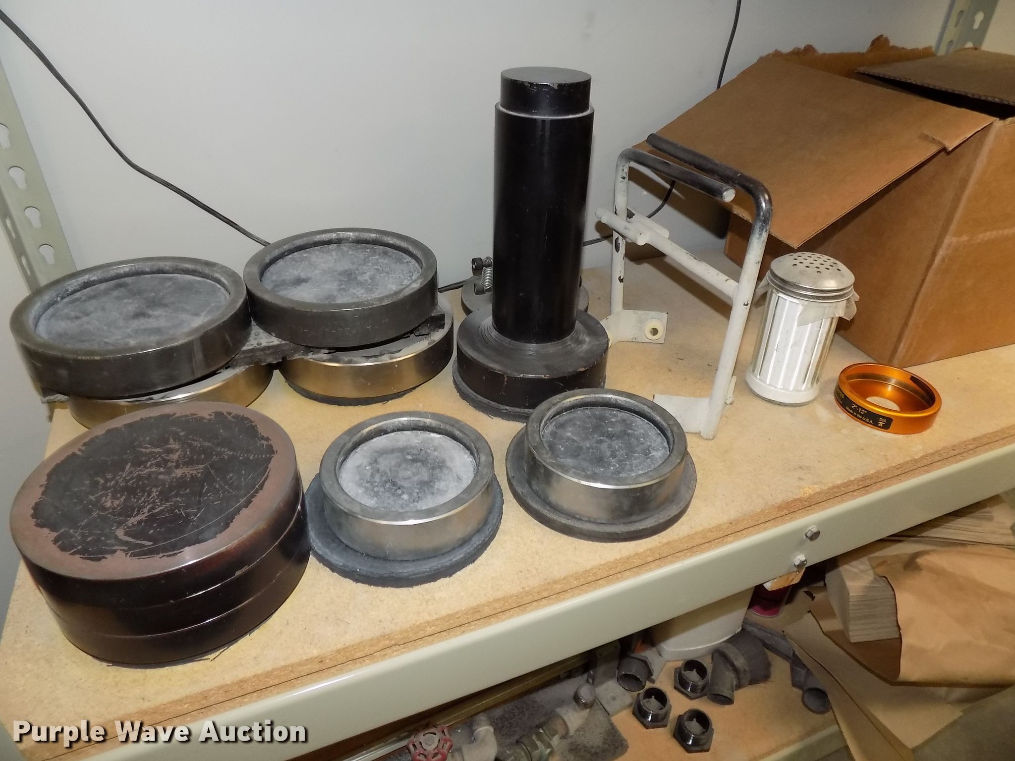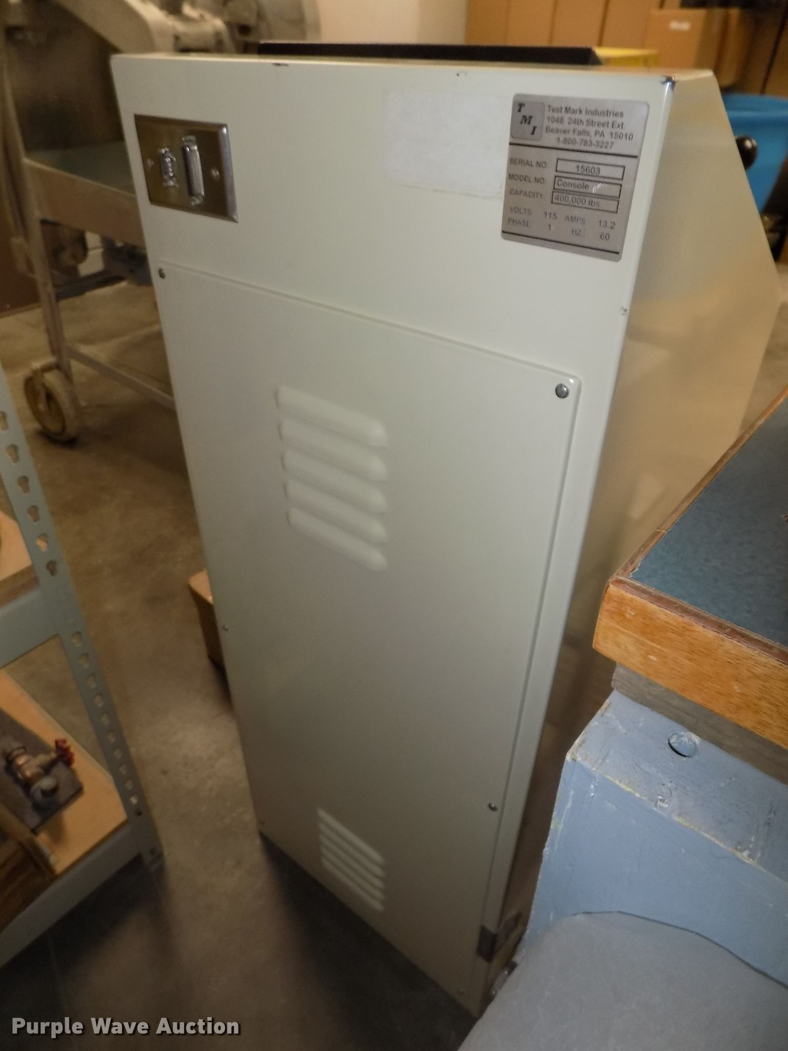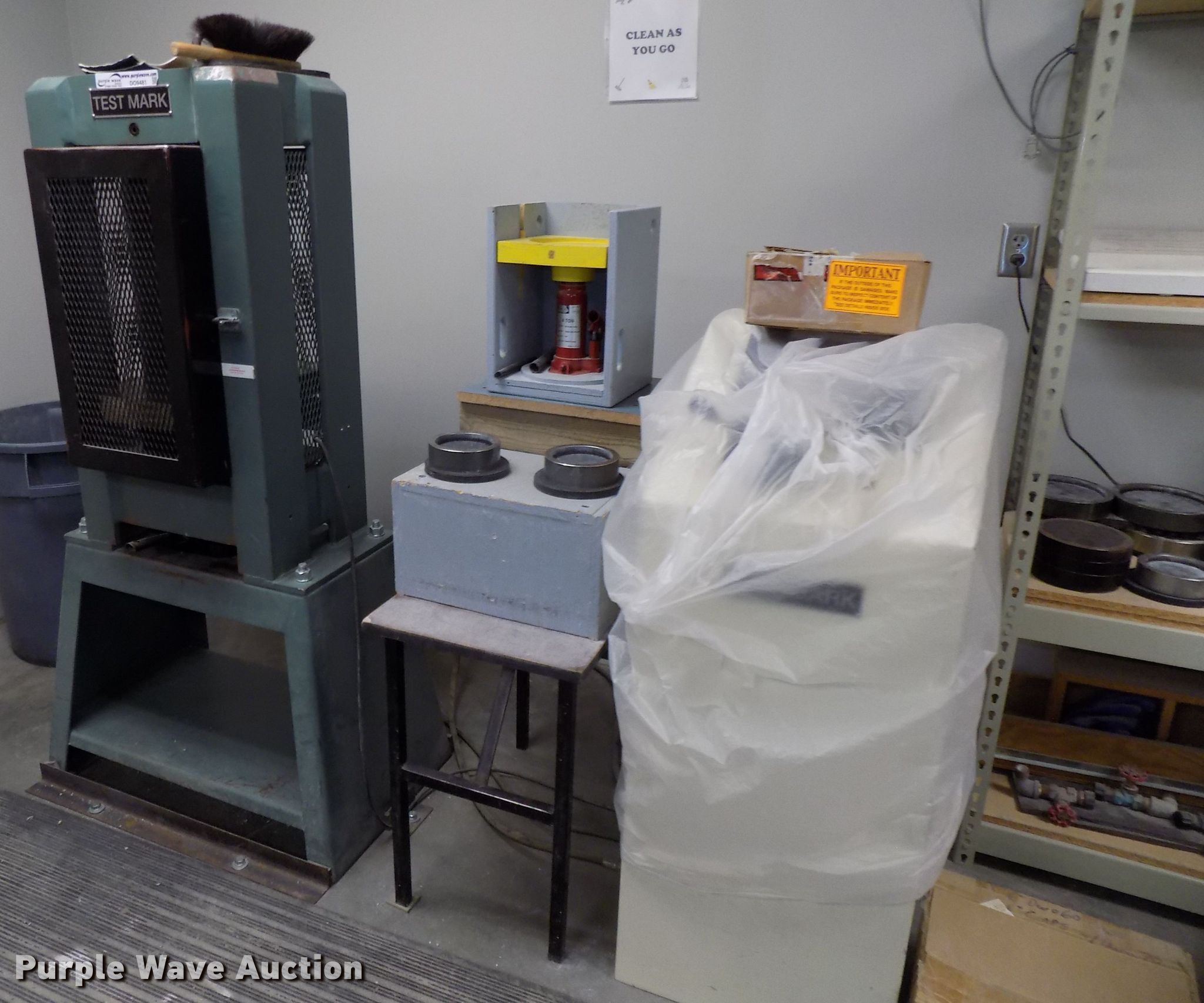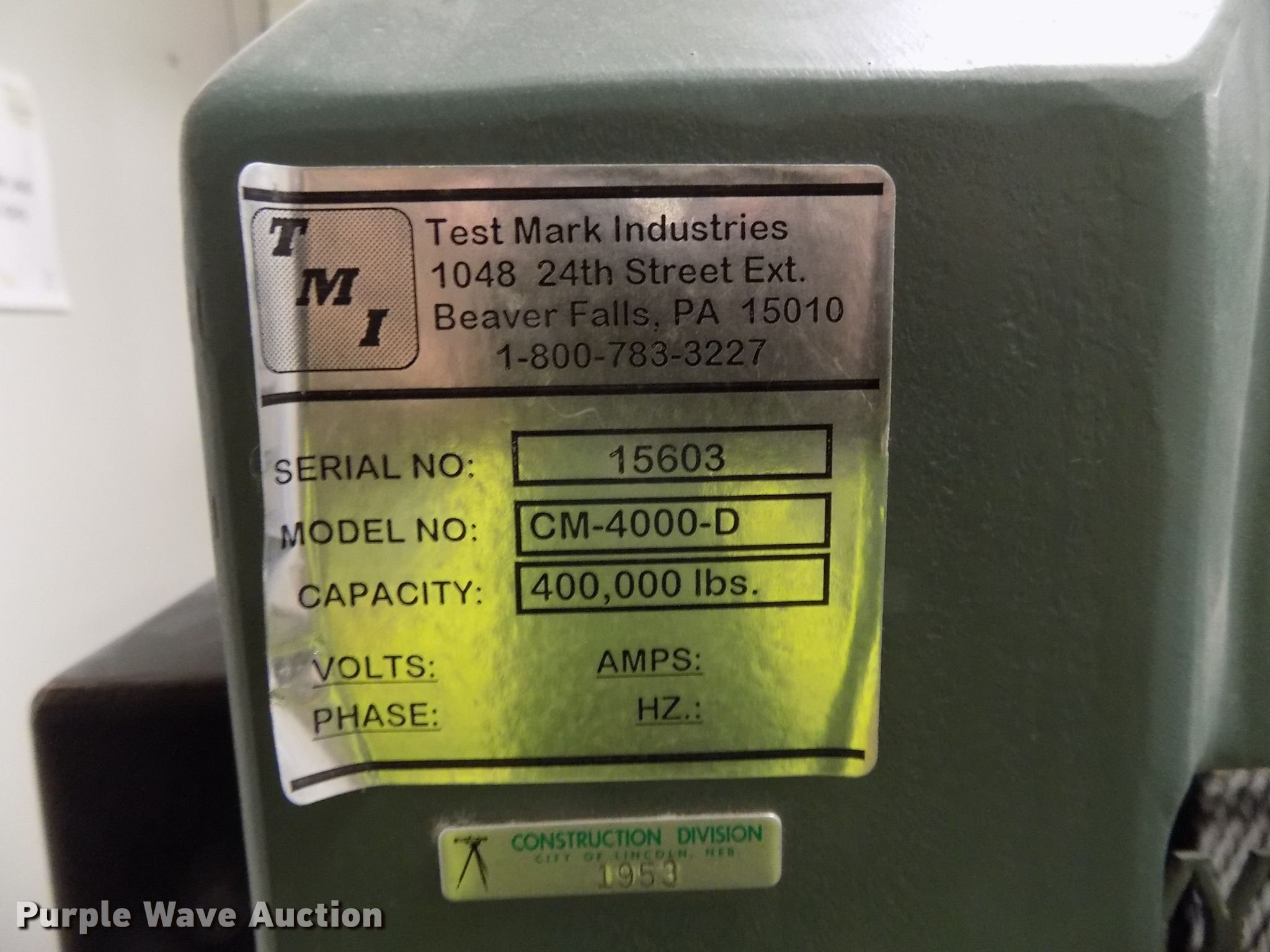 Purple Wave is selling a used Tools in Nebraska. This item is a Test Mark CM-4000-D concrete compression testing machine with the following: 400,000 lbs maximum capacity, 115/230V single phase, Serial 15603, 1,620 lbs shipping weight, Unit# 1953, Four ton hydraulic jack, Gilson HM179 cylinder wraps, Mold accessories, Test Mark console, 400,000 lbs maximum capacity, 115V single phase, Serial 15603, (2) sets of 4" retainer rings with pads, (2) sets of 6" retainer rings with pads, 2" cube platen test set, Spacers, Cylinder canvas wraps for 4" and 6", Two Pi-tapes for diameter determination