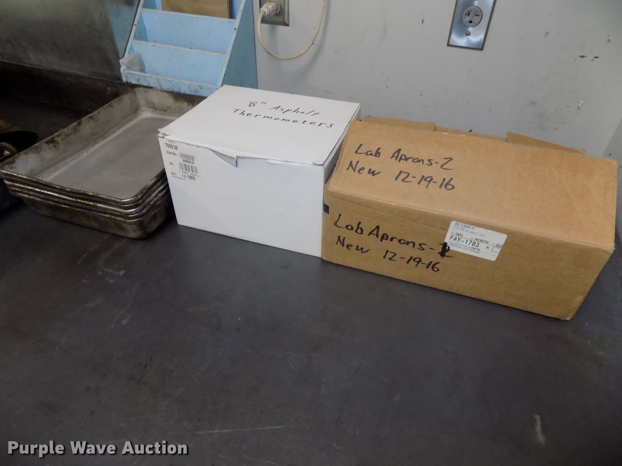 Ohaus Explorer digital scale. 32,000 gram capacity, 0.1 gram readability , Internal calibration, Assorted asphalt thermometers, Assorted trays and tools, Lab apron, Fluke 8" digital thermometers 50 to 550 degrees, Manual. City of Lincoln Engineering Services Materials Lab. 949 W Bond St, Suite 200. Lincoln, NE 68521