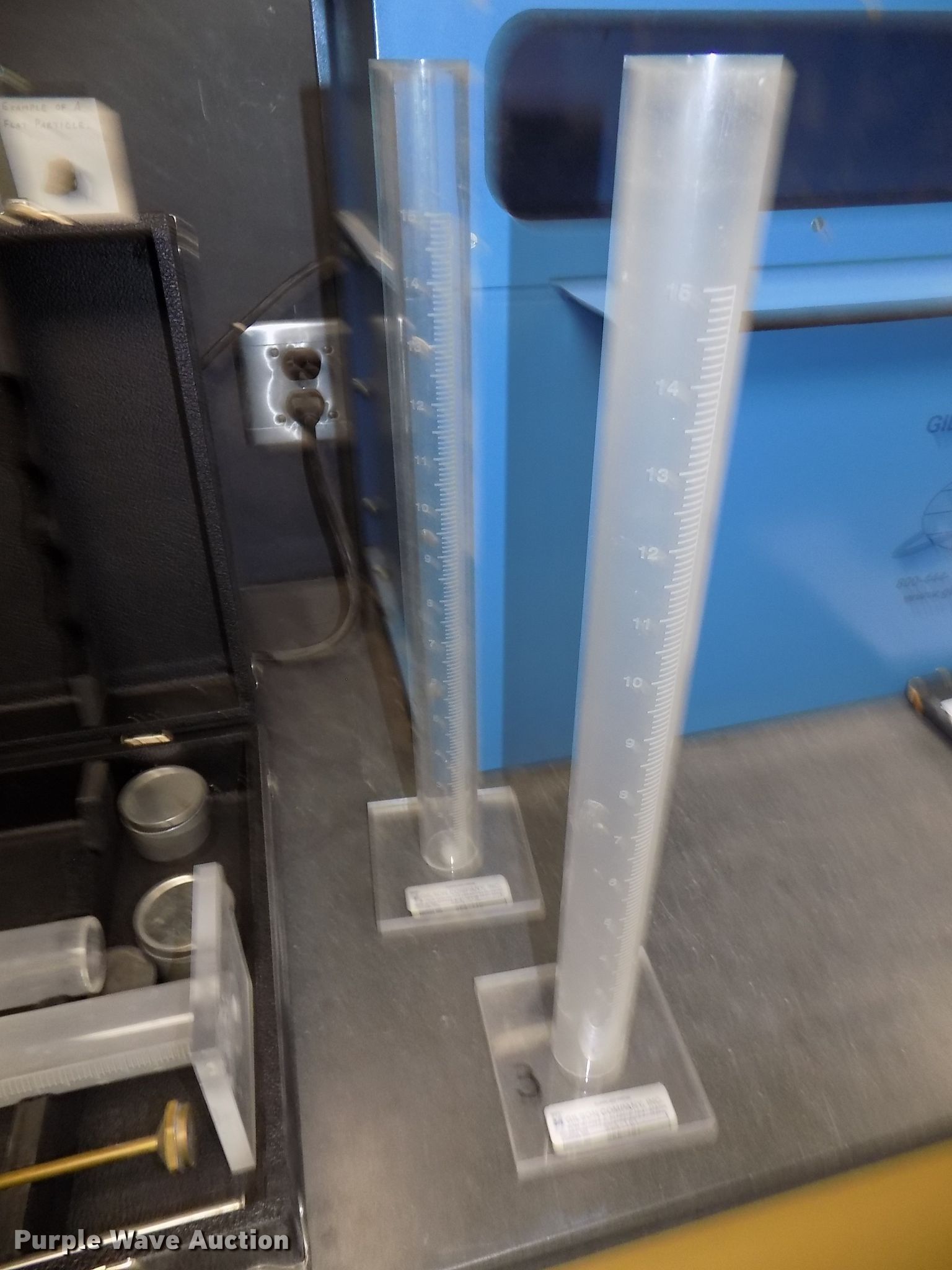 Gilson sand content shaker and test set. Approx. 35"W x 12"D x 20"H O.D., Sand equivalent test set Plastic tubes and accessories, Carrying case, Wood stand, Unit# 1952. City of Lincoln Engineering Services Materials Lab. 949 W Bond St, Suite 200. Lincoln, NE 68521