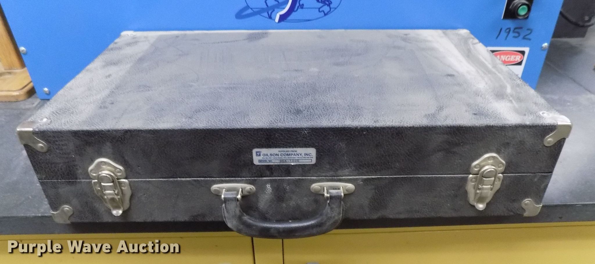 Purple Wave is selling a used Tools in Nebraska. This item is a Gilson sand content shaker and test set with the following: Approx. 35"W x 12"D x 20"H O.D., Sand equivalent test set, Plastic tubes and accessories, Carrying case, Wood stand, Unit# 1952