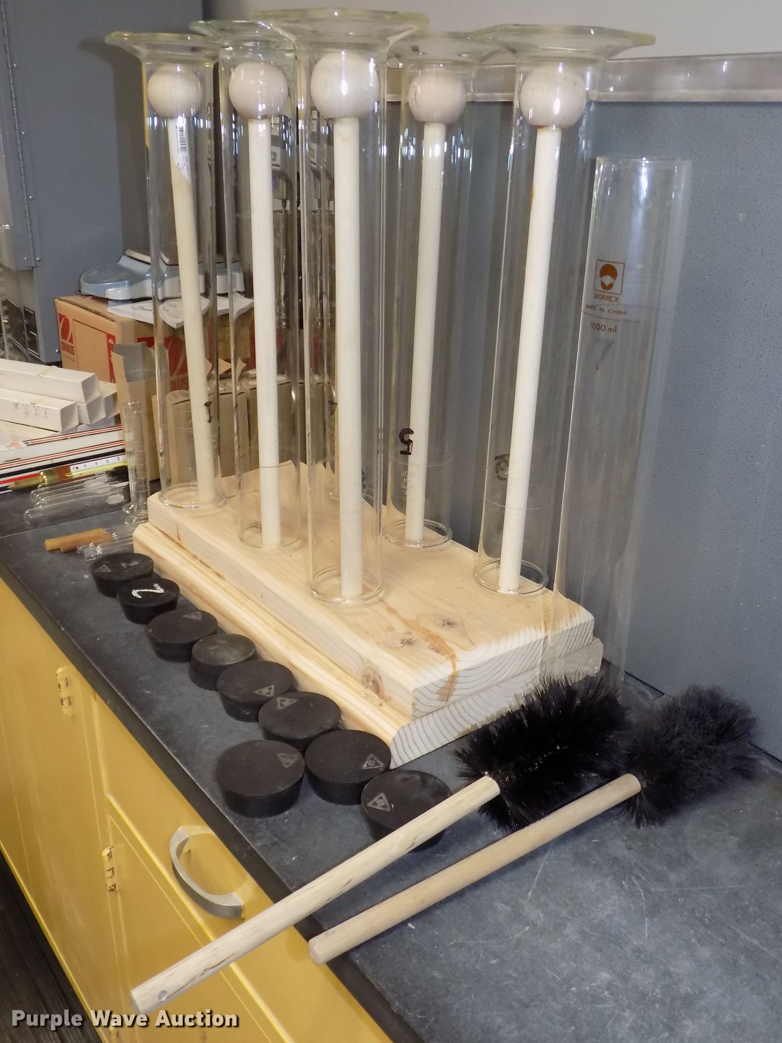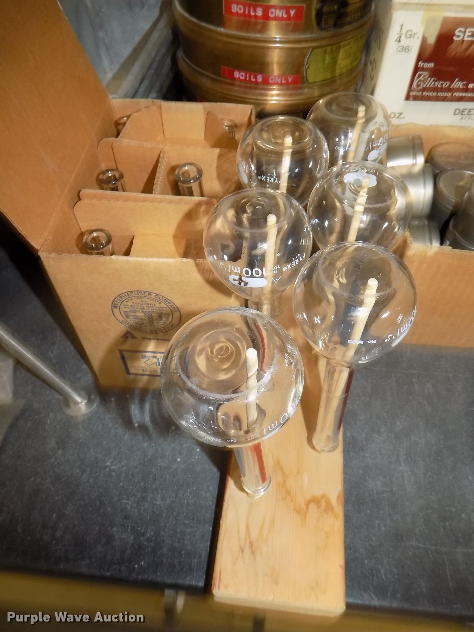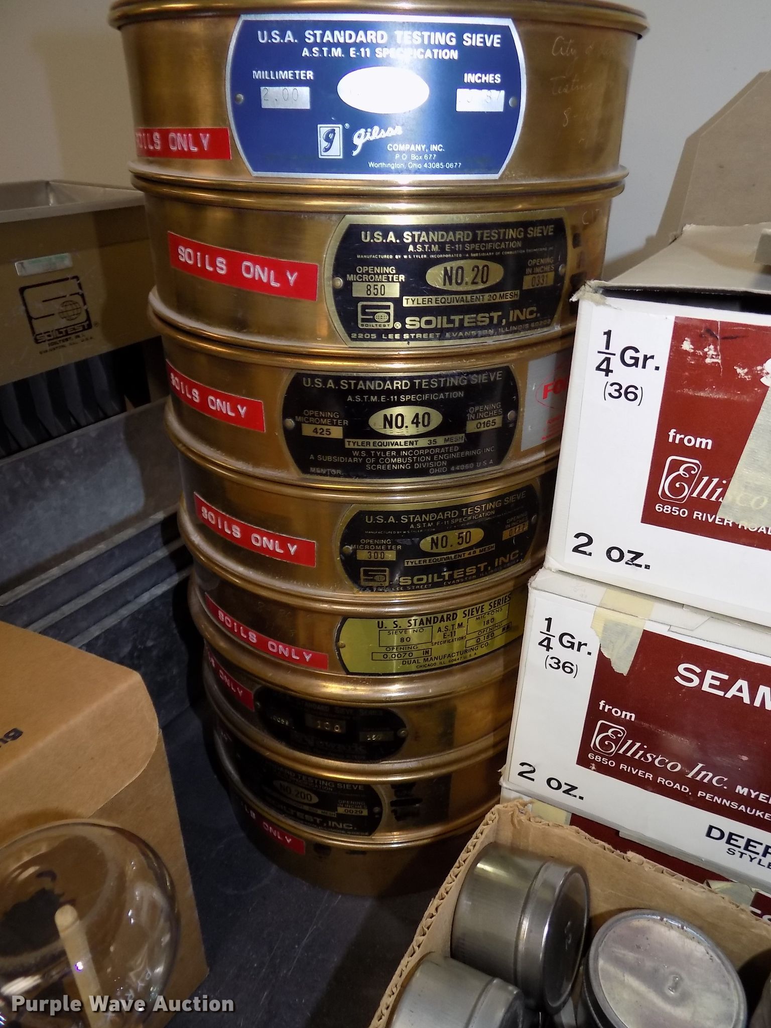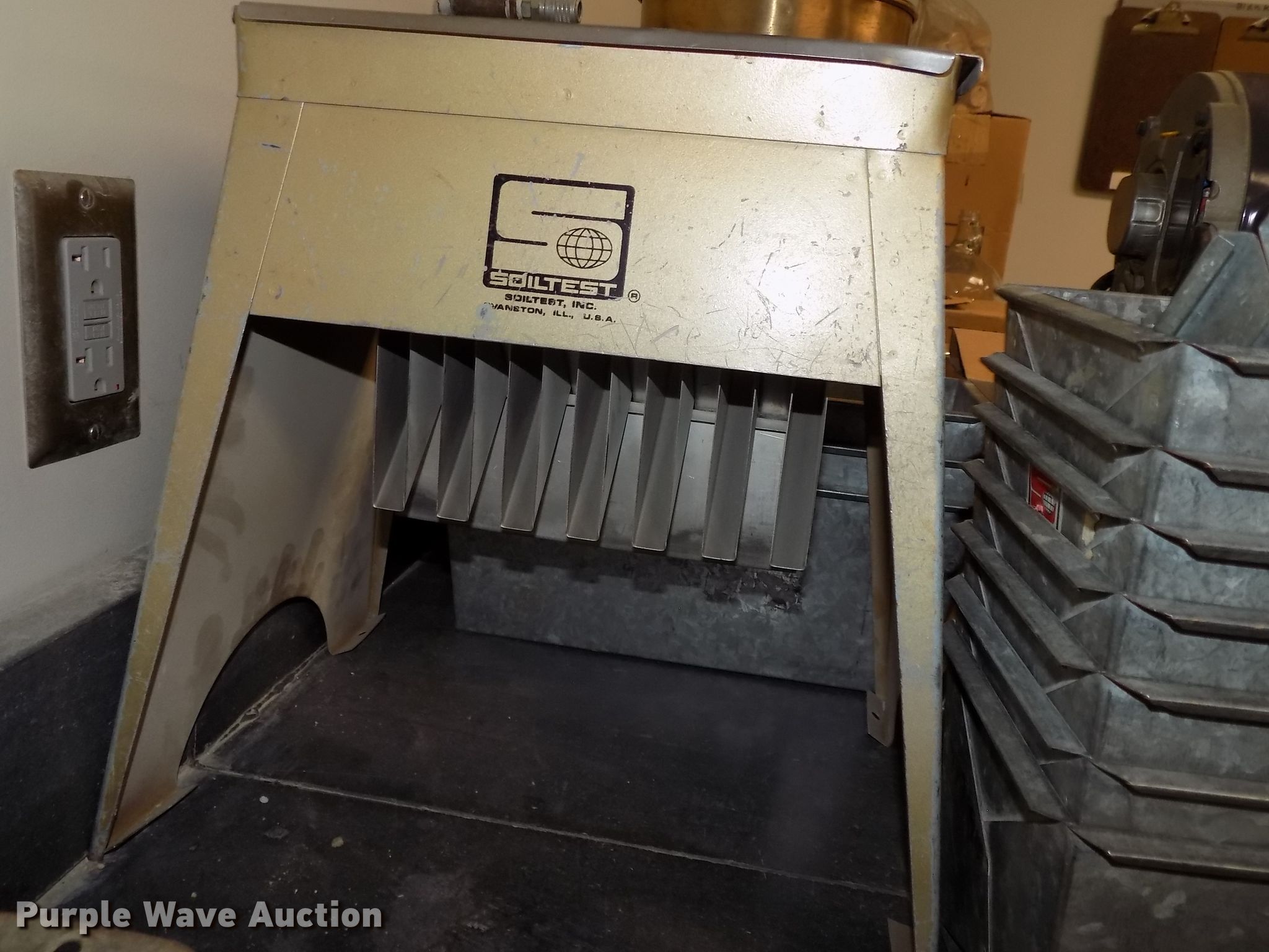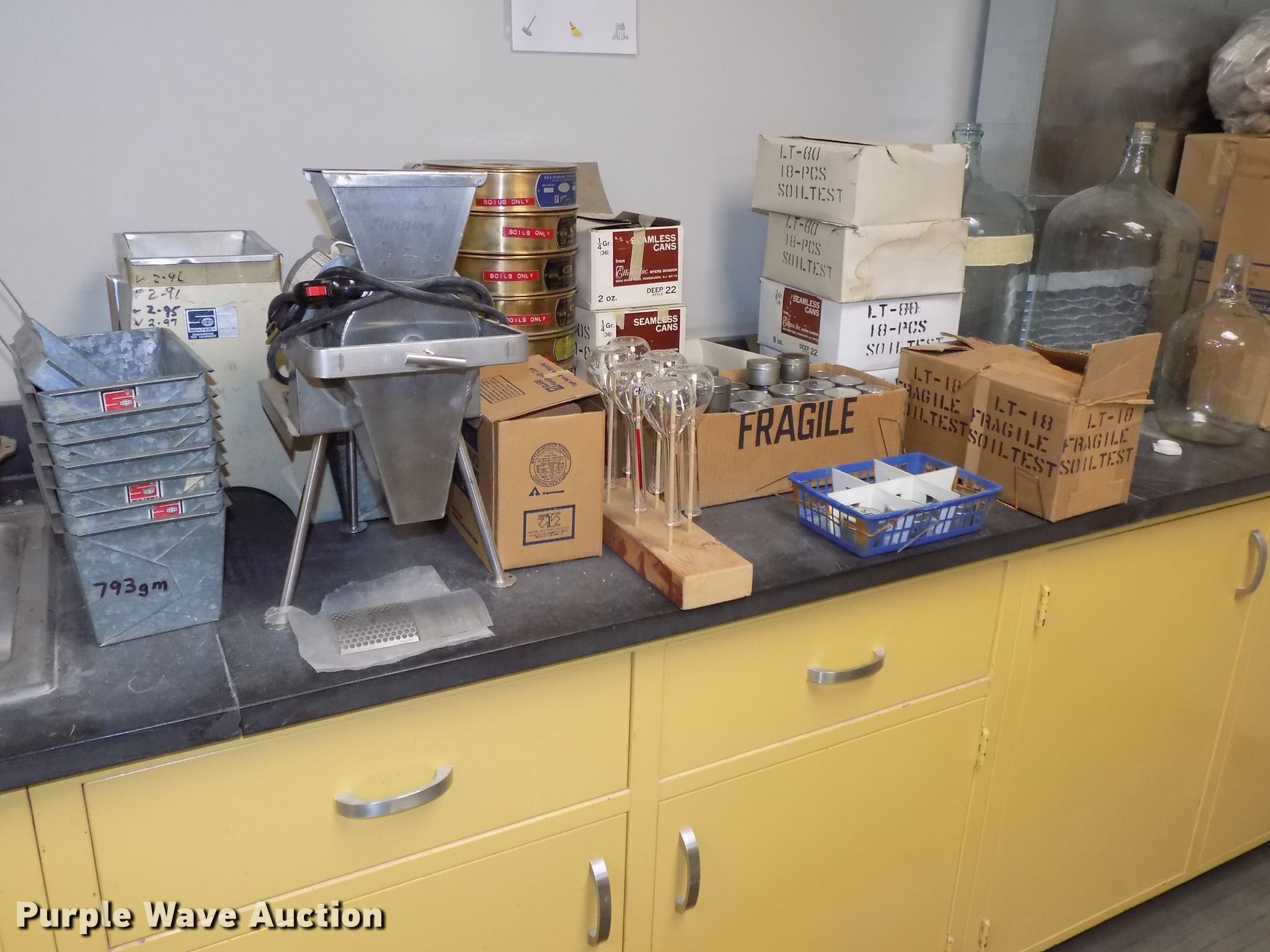 Purple Wave is selling a used Tools in Nebraska. This item is a Atterberg Limits soils particle analysis testing equipment with the following: Gilson SA-25 Geotest constant temperature bath, Hamilton Beach mixer, Unit# 1887, Adventurer SLAS612, 600 gram digital scale, .01 gram readability, Quincy QL 40GC lab oven, 450 degree capacity, Amana RC17S commercial oven, Cart, Pans, Glassware, Beakers, Test tubes, Soil thermometers, Graduated cylinders, Hydrometers, Soil test sample splitter, Model CL280A, Pans, Humboldt HH99 mini grinder, Emerson single phase electric motor, Additional screens, Serial 06114199, 8" diameter soil testing sieves, Sample seamless cans, Glass solution jars, One to five gallon capacities, Ceramic dishes, Flasks, In-line glass valves, Clamps and beakers, Timers, Corks, Grinder accessories, PrRex unused glassware, Plastic graduated cylinders, Round/flat bottom beakers, Petrie dishes, Square glass trays, Specialized thermometers, Sedimentation cylinders, (3) 6" x 18" glass asphalt reflux extractor jars