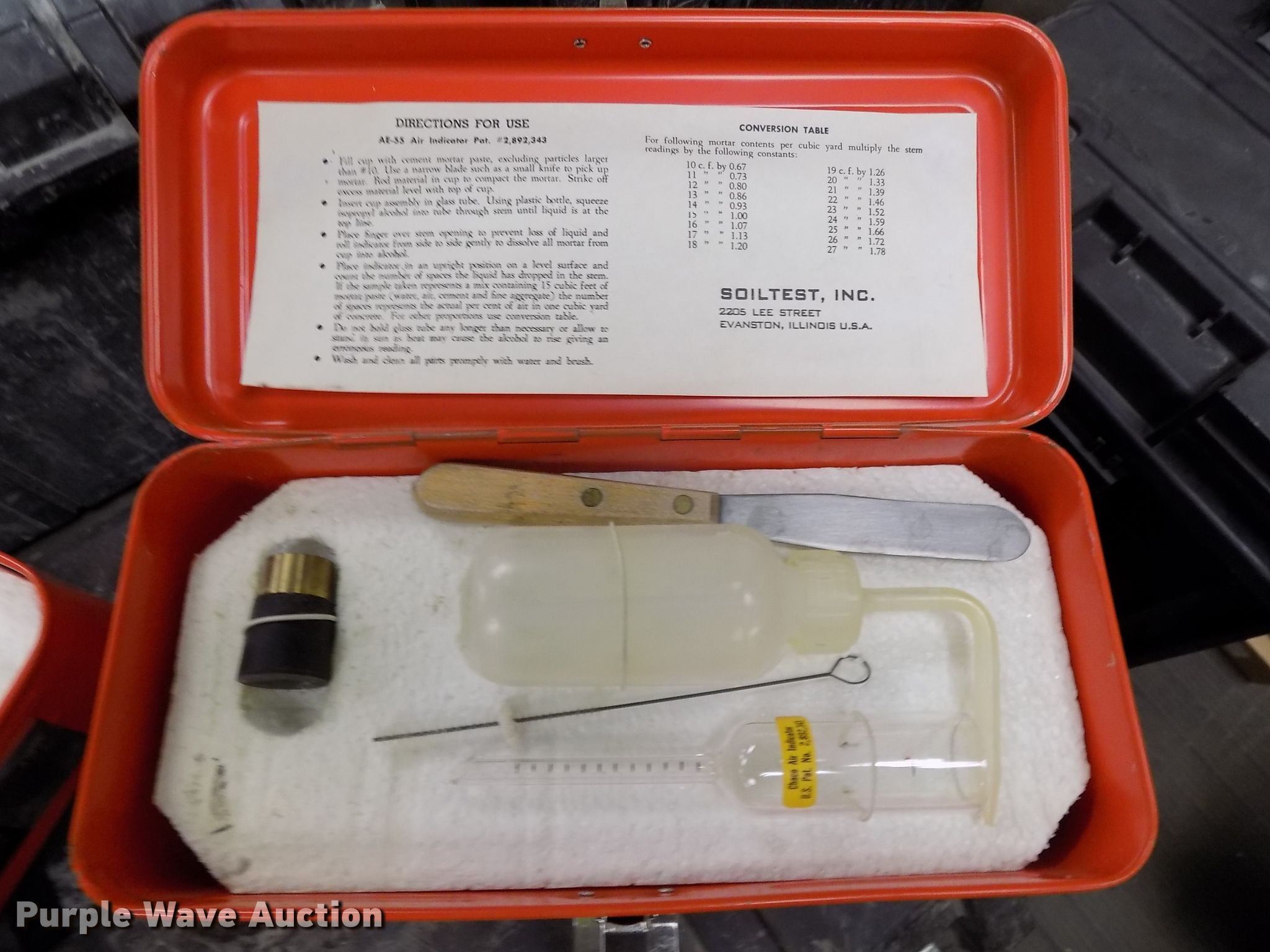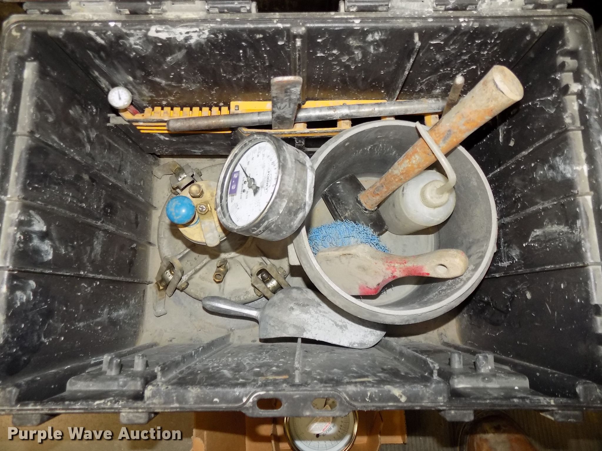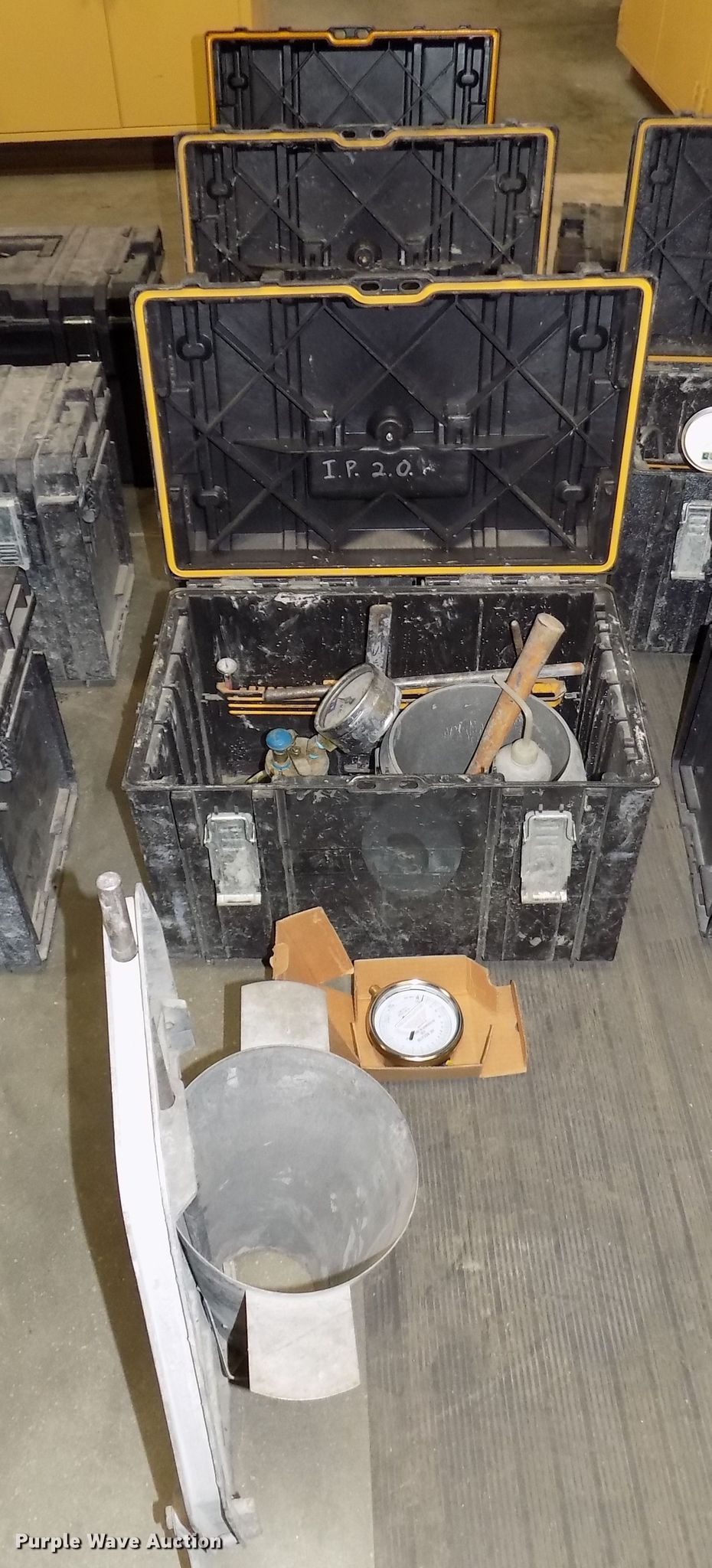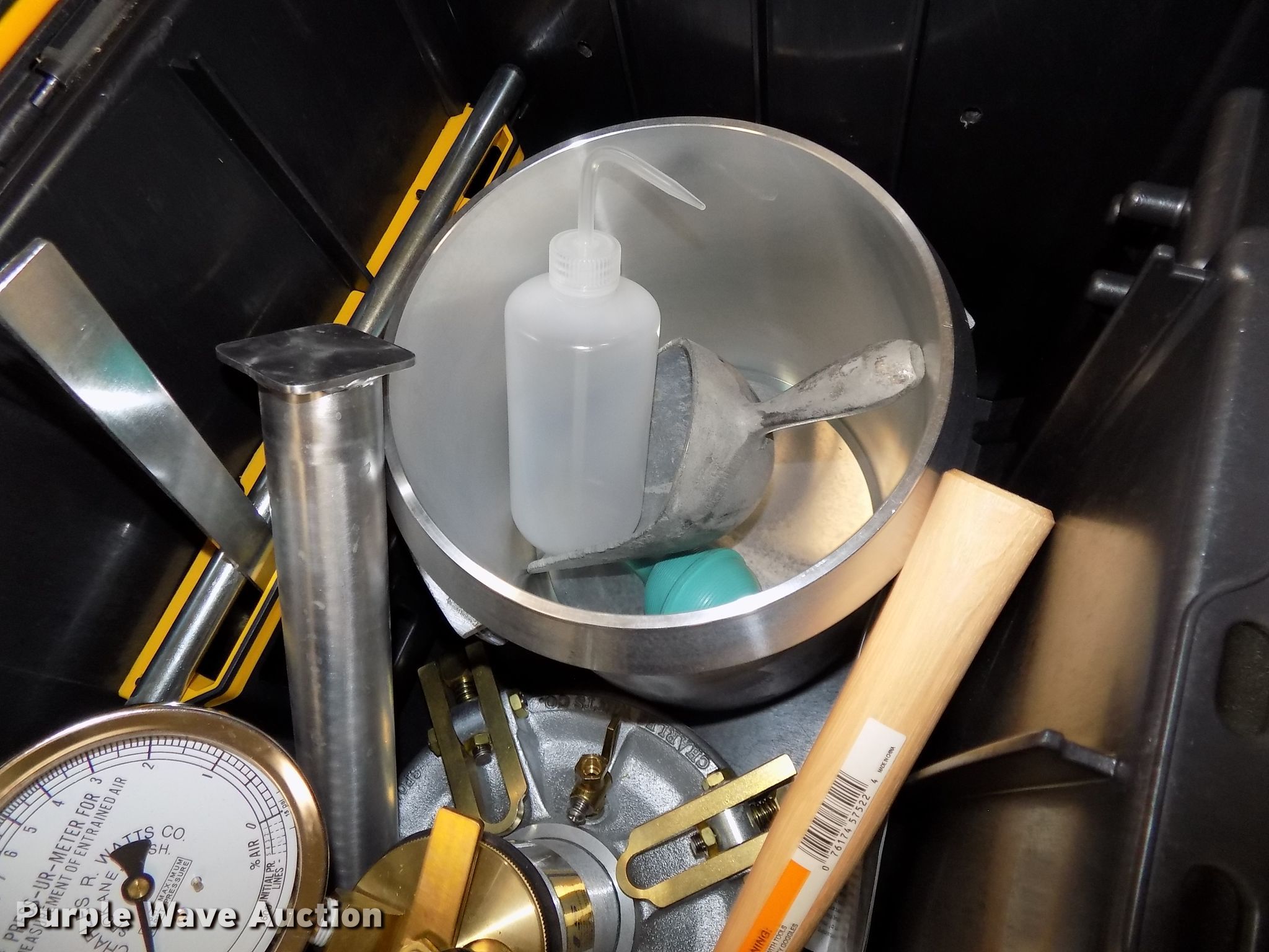 Purple Wave is selling a used Tools in Nebraska. This item is a (3) Watts concrete air meters with the following: 2011 Watts concrete air meter, Gauge, Tools, Case, Unit# Z779, 2011 Watts concrete air meter, Gauge, Tools, Case, Unit# Z880, 2017 Watts concrete air meter, Gauge, Tools, Case, Unit# B2231, Unused, Soil test slump cone and base, Unit# SC-4, (2) Chace air indicators test kit