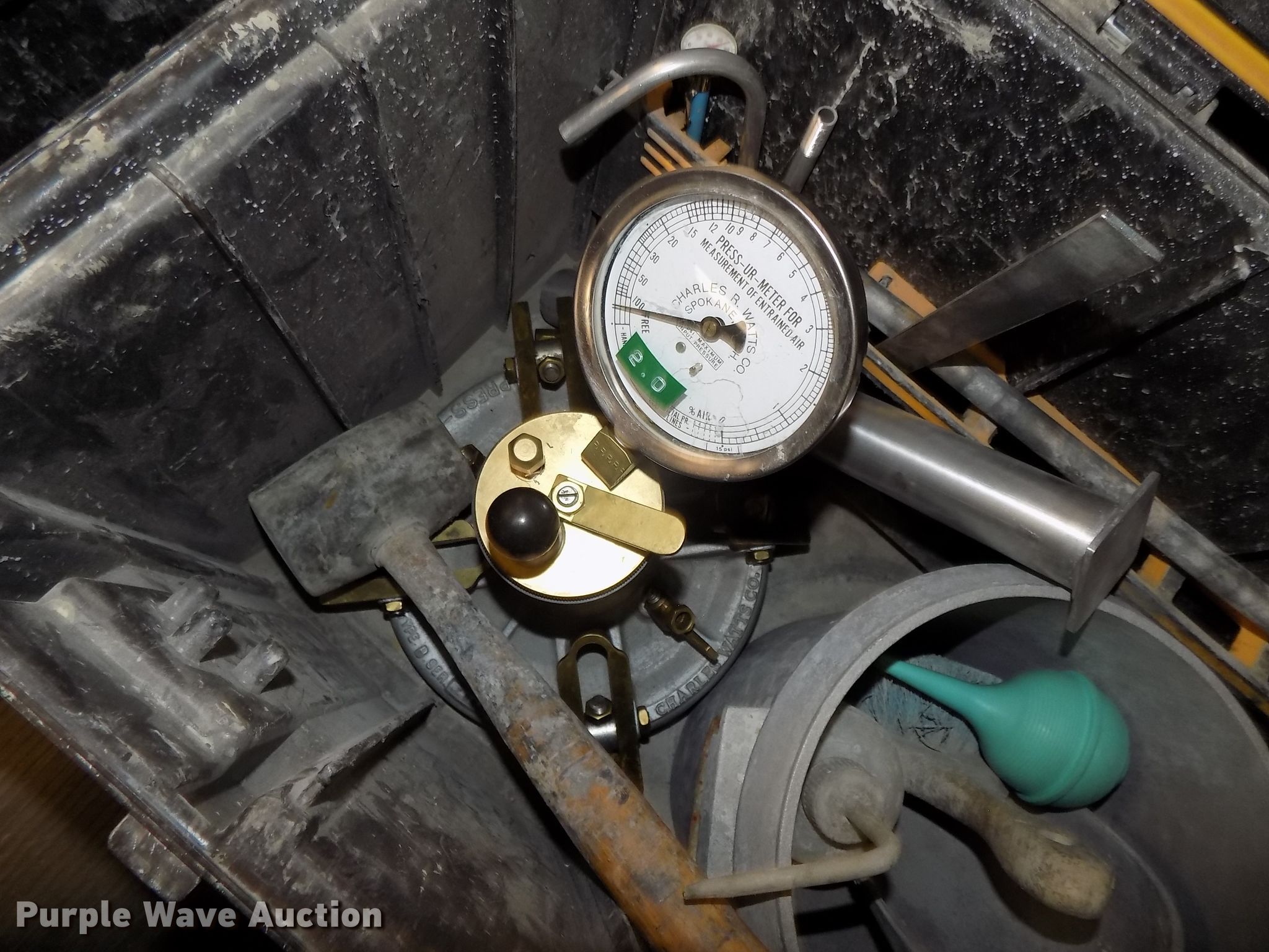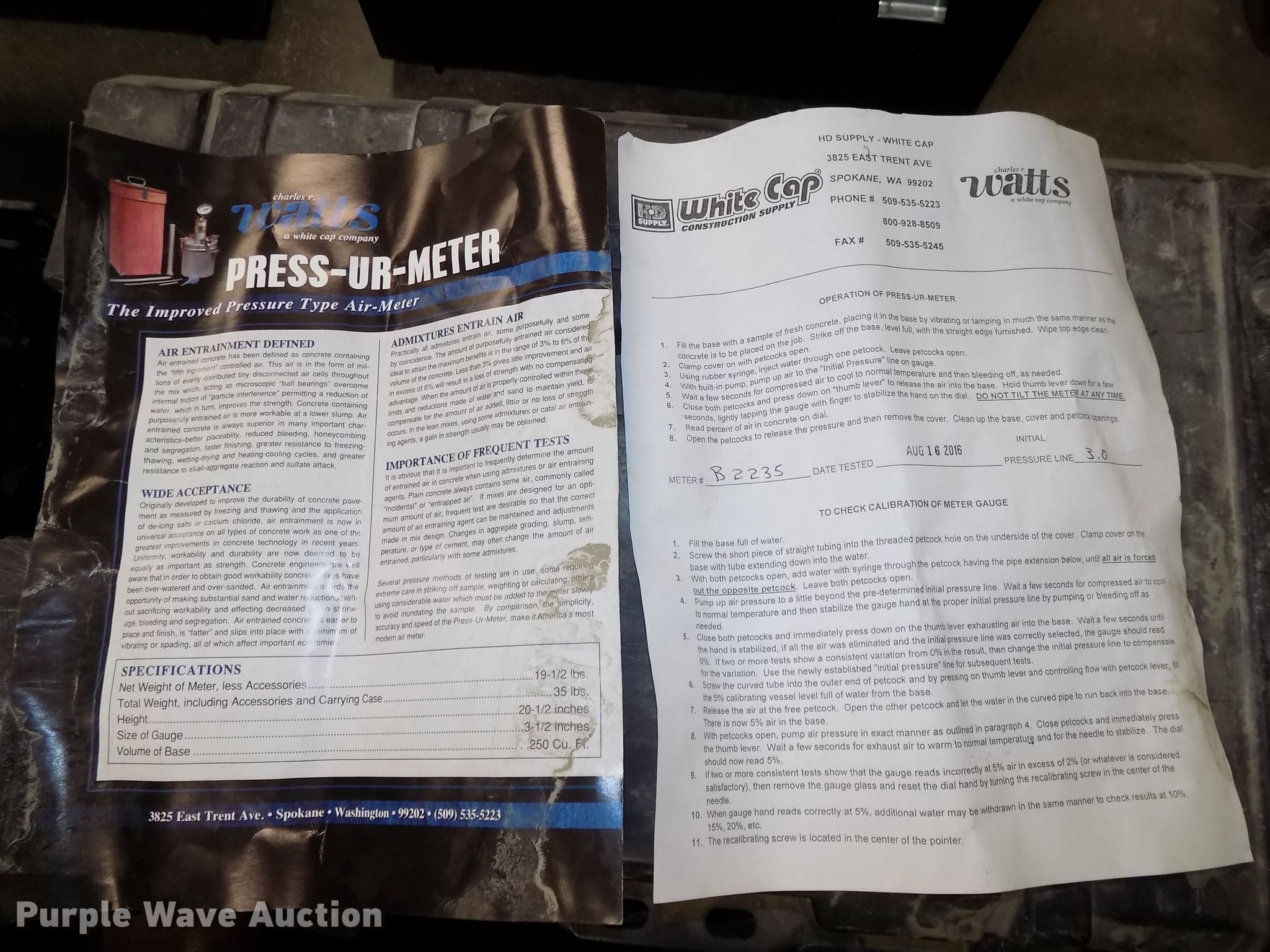 Purple Wave is selling a used Tools in Nebraska. This item is a (3) concrete air meters with the following: 2006 Watts concrete air meter, Gauge, Tools, Case, Unit# X542, 2011 Watts concrete air meter, Gauge, Tools, Case, Unit# Z886, 2017 Watts concrete air meter, Gauge, Tools, Case, Unit# 2235, Unused, Humboldt slump cone and base, Unit# SC-5, Gaskets, Seals, Pumps, Top caps, Valve assembly parts