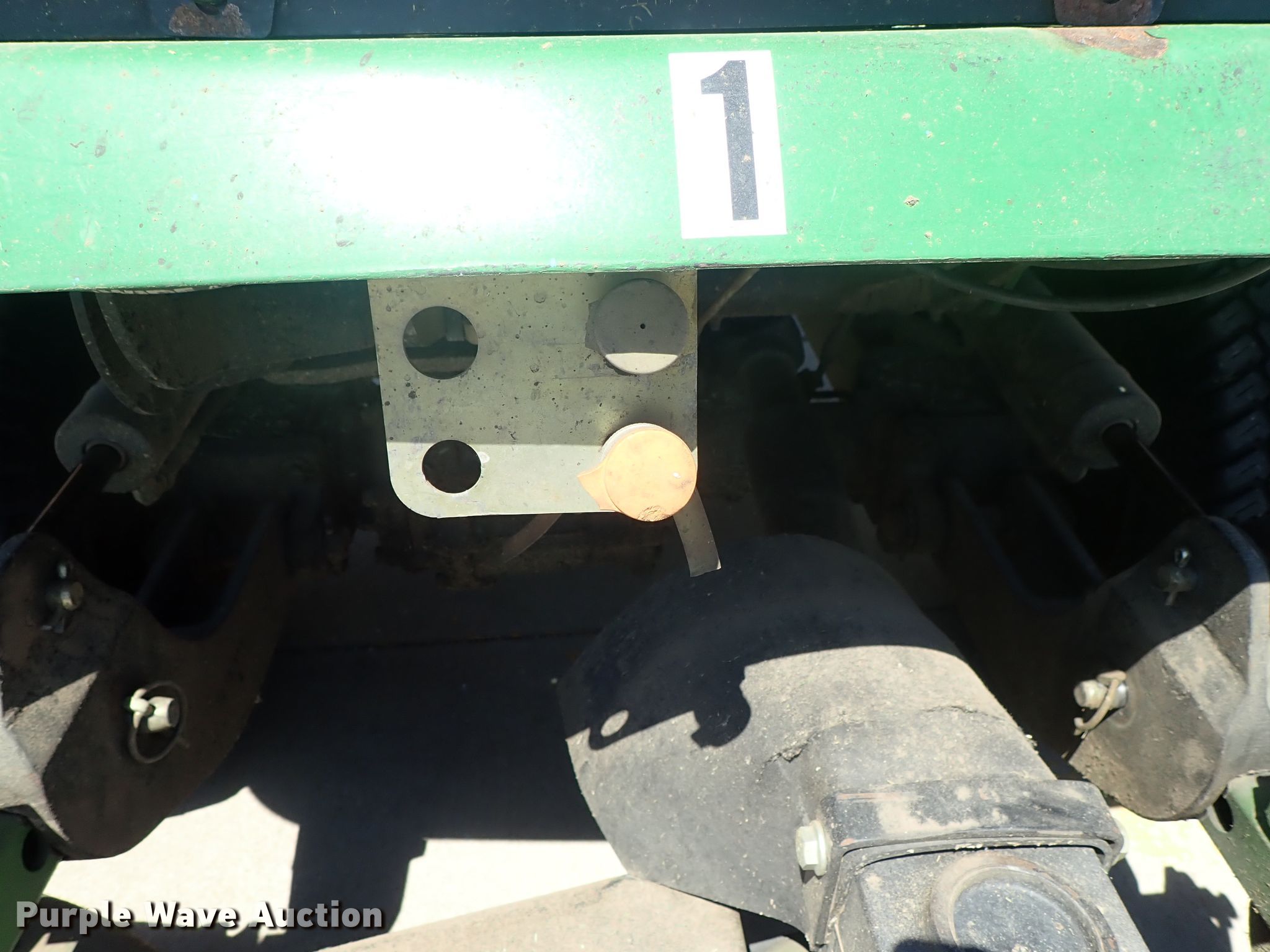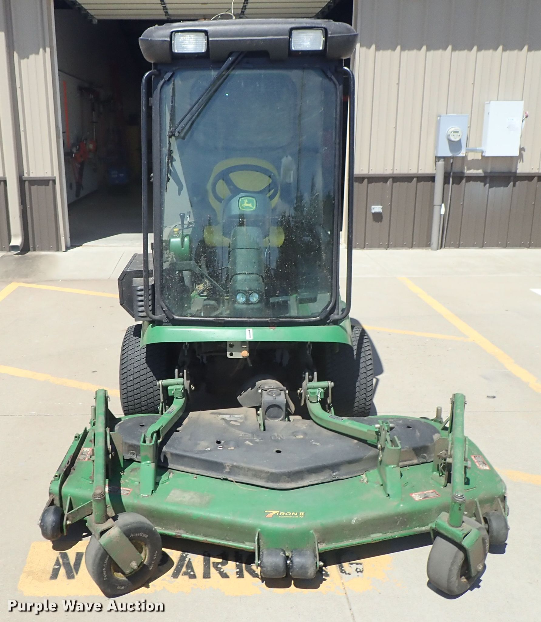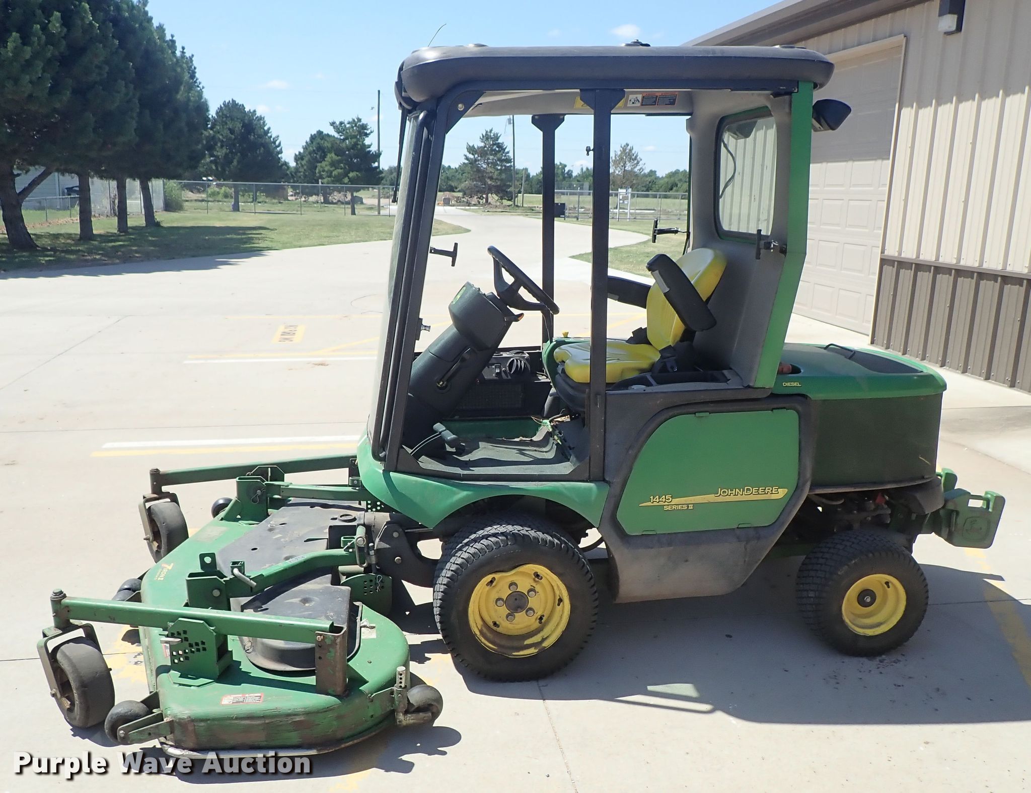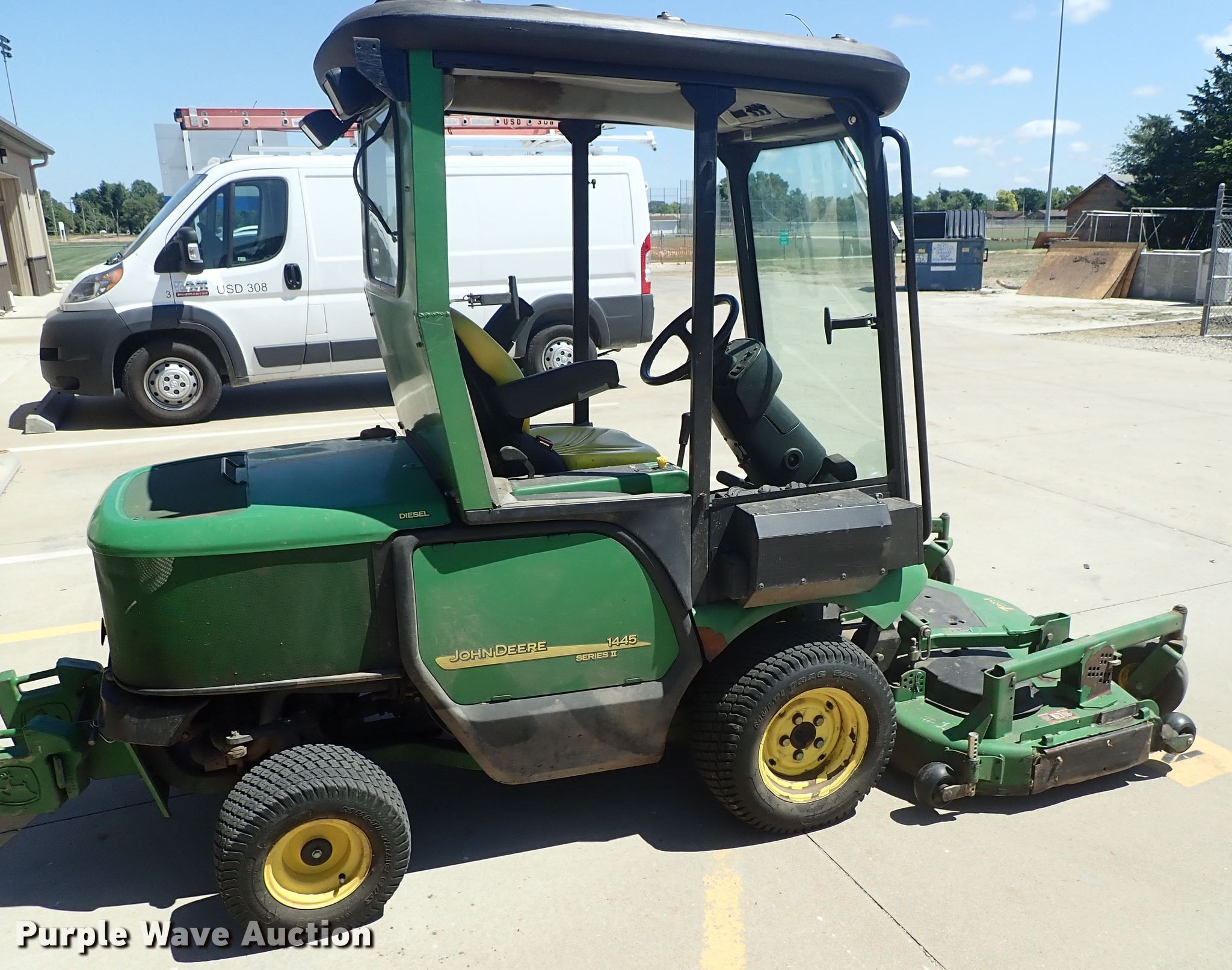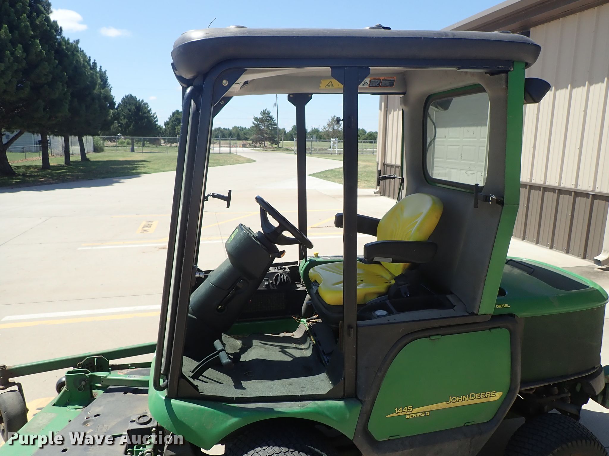 Purple Wave is selling a used Commercial Turf Mower in Kansas. This item is a John Deere 1445 lawn mower with the following: 2,069 hours on meter, 72"W deck, Yanmar three cylinder diesel engine, Hydrostatic transmission, Enclosed cab, Heat, Rear counter weights, Work lights, 23 x 10.50-12 tires