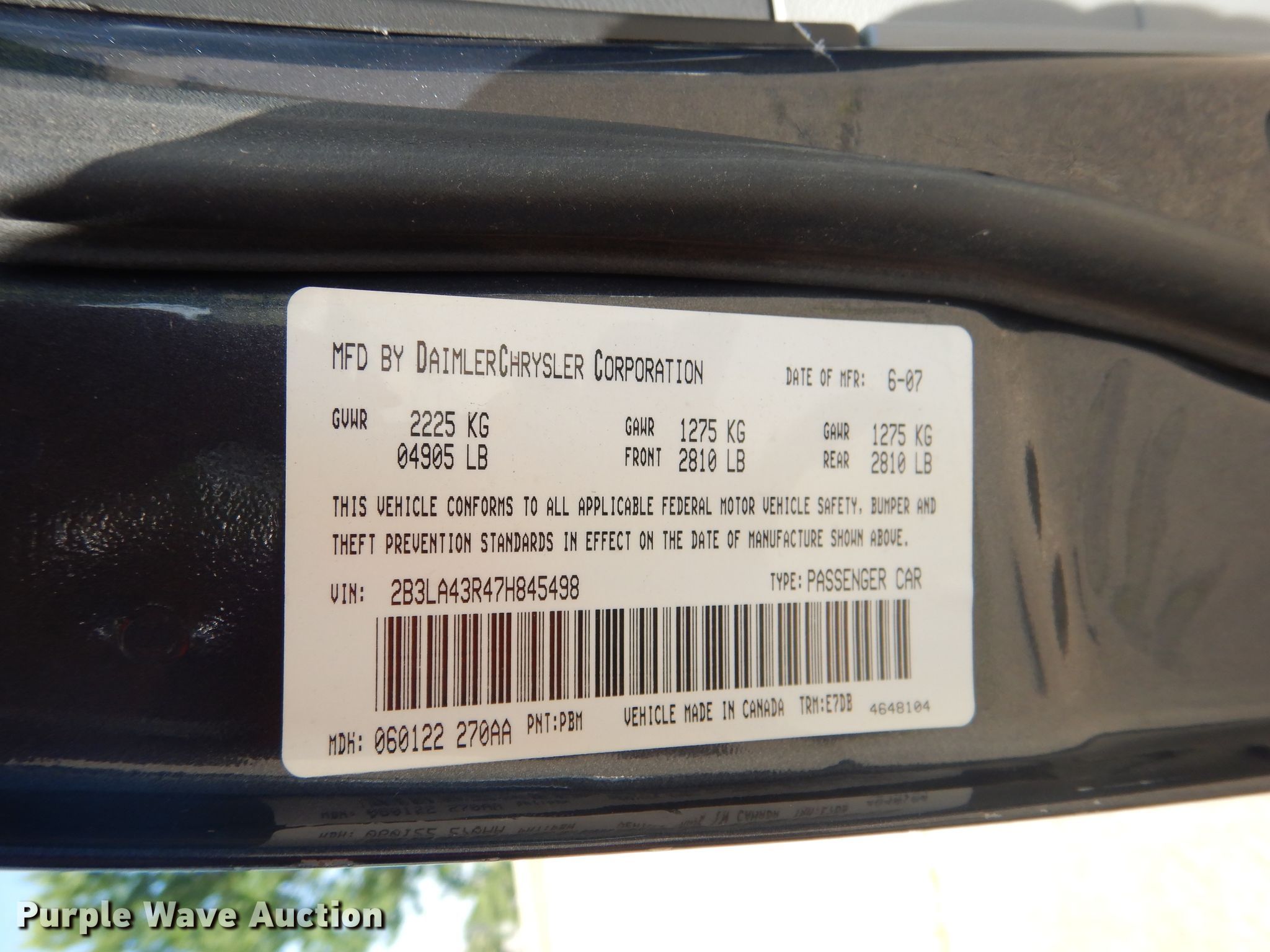 Purple Wave is selling a used Passenger Vehicle in Oklahoma. This item is a 2007 Dodge Charger with the following: 130,544 miles on odometer, 2.7L V6 DOHC 24V gas engine, Automatic transmission, AC and heat, Cruise, Power locks and seat, 215/65R17 tires, Windshield cracked, Wreck damage, Sale# 2004-KP, Unit# 241