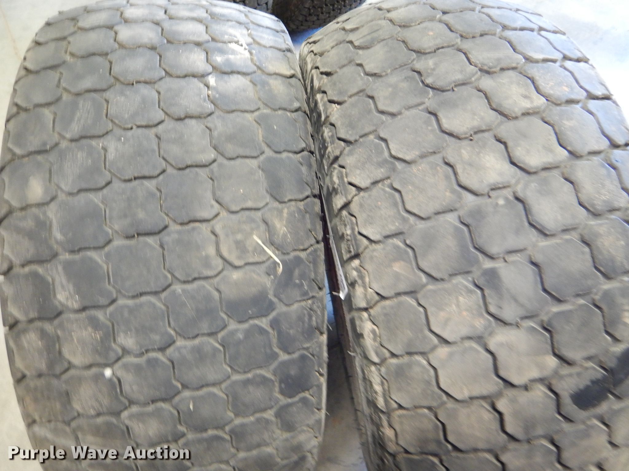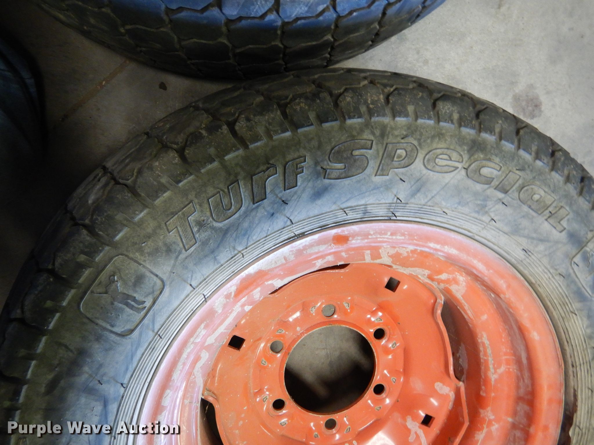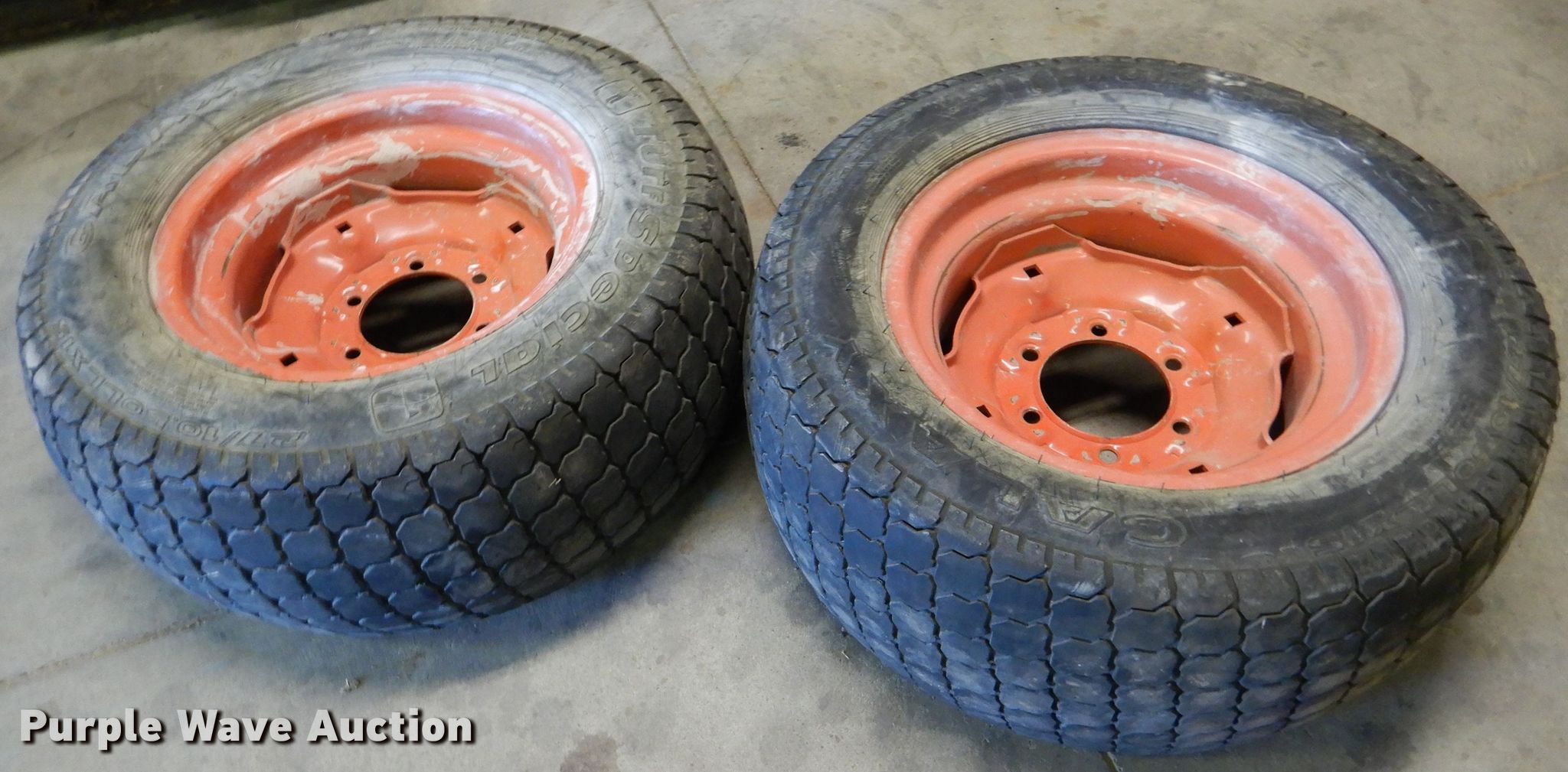Purple Wave is selling a used Industrial Tires or Tracks in Kansas. This item is a Galaxy Turf Special 27/10.50LLx15 tires and wheels with the following: 15x8 six bolt wheels