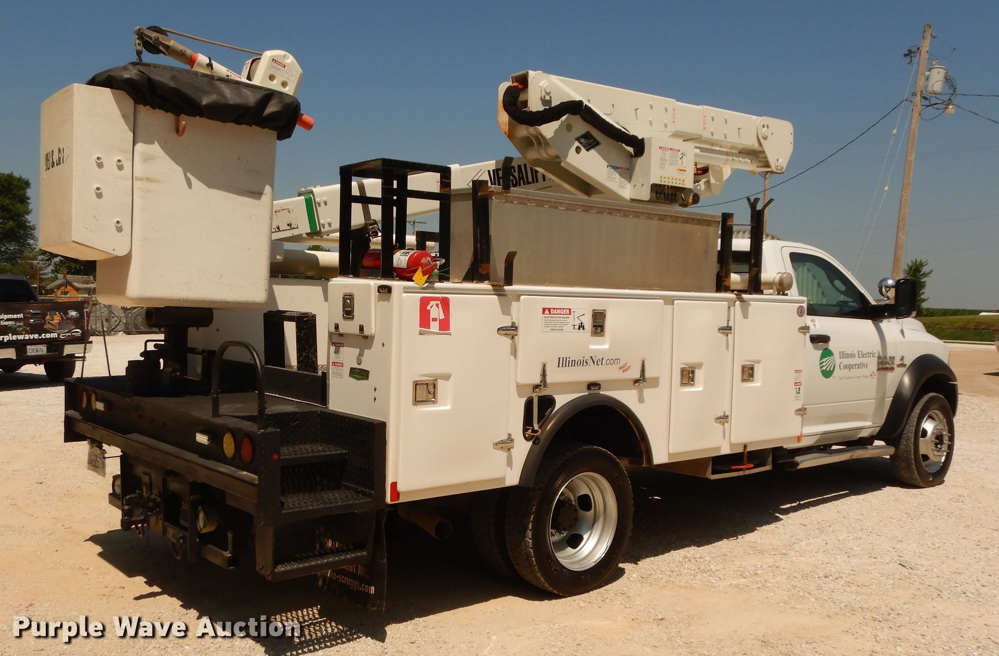 Purple Wave is selling a used Bucket Truck in Illinois. This item is a 2013 Dodge Ram 5500 bucket truck with the following: 147,920 miles on odometer, 6.7L L6 OHV 24V diesel engine, Serial 5831, Allison automatic transmission, Four wheel drive, Single axle, AC and heat, Power windows and locks, Auxiliary controls, Brake controller, PTO, Astoria service bed, 11'L, Serial 11244, 2013 Versalift KW130060 boom, 40' boom length, 45' mast height, 400 lbs max lift capacity, Man basket, Ground and platform controls, Articulating, insulated, and telescopic boom, Material handler, Pole guide, Certification valid through December 2019, Air suspension, Hydraulic brakes, 14' wheelbase, Continental 225/70R19.5 tires, GVWR 19,500 lbs, Unit# 19