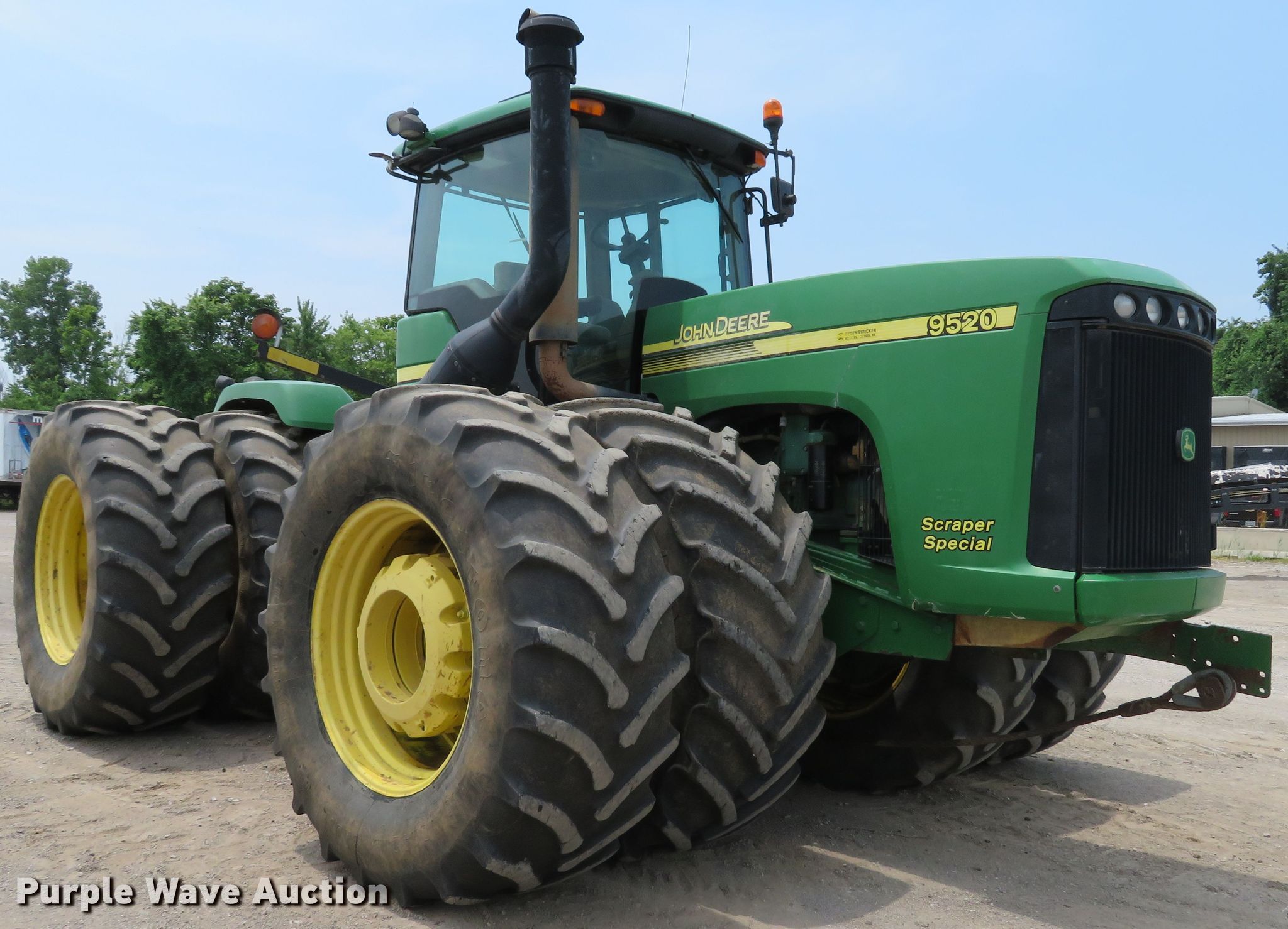 Purple Wave is selling a used Articulated 4-Wheel Drive Tractor in Illinois. This item is a 2006 John Deere 9520 Scraper Special 4WD tractor with the following: 9,626 hours on meter, John Deere 6125H six cylinder diesel engine, 450 HP, Powershift transmission, 18F-6R gears, AC and heat, AM/FM, Seven pin outlet, Scraper draw bar, (4) rear hydraulic remote sets, 710/70R42 dual tires, CB not included, Serial RW9520E041113