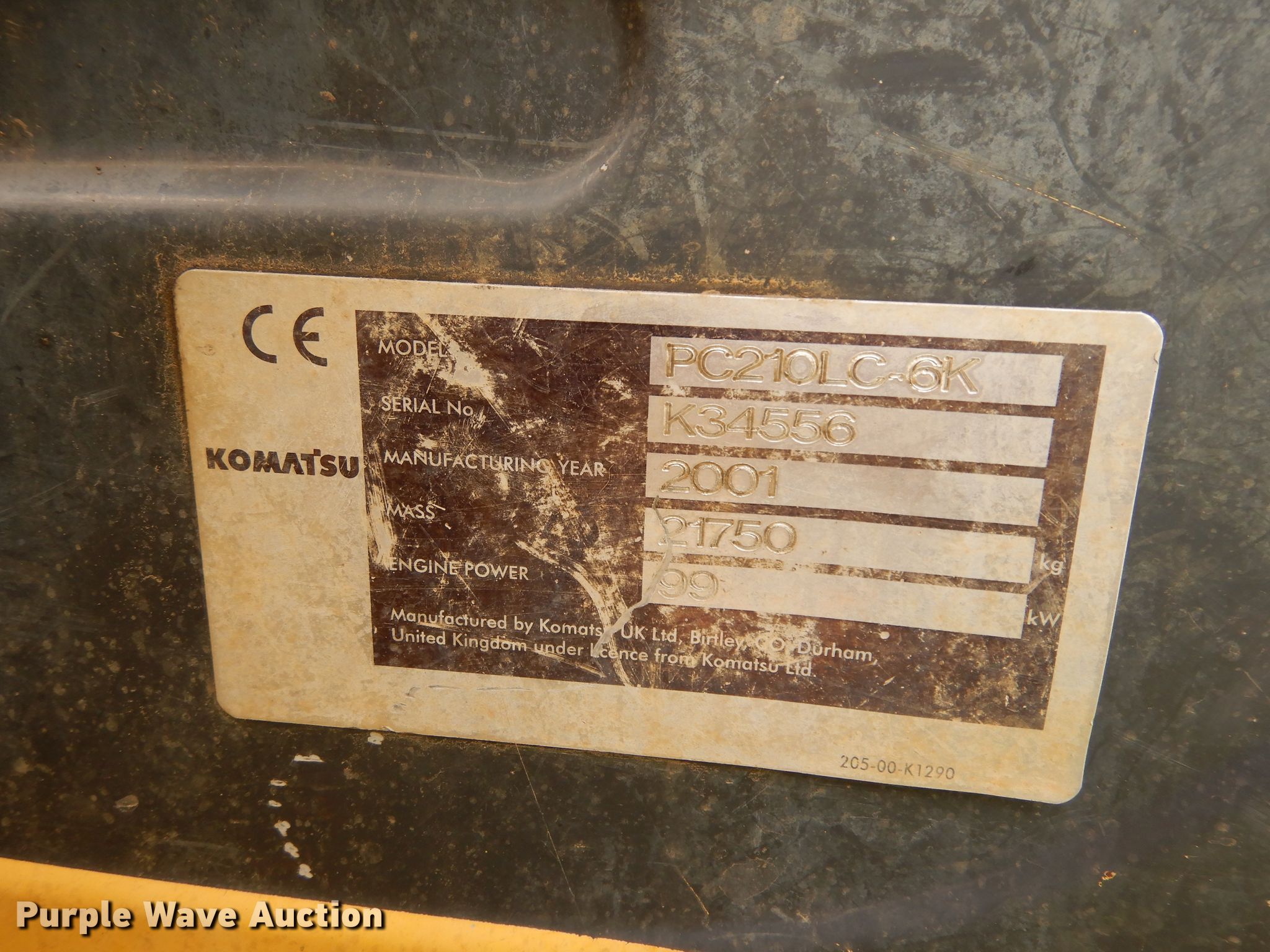 Purple Wave is selling a used Hydraulic Excavator in Illinois. This item is a 2001 Komatsu PC210LC-6K excavator with the following: 8,024 hours on meter, Komatsu six cylinder diesel engine, 99 HP, Hydrostatic transmission, Enclosed cab, AC and heat, Auxiliary hydraulics, Standard boom, 10' stick length, Amulet manual thumb, Hendrix bucket, 48"W, (6) teeth, 1.5 cu. yd. capacity, 32"W steel triple grouser track pads, Serial K34556