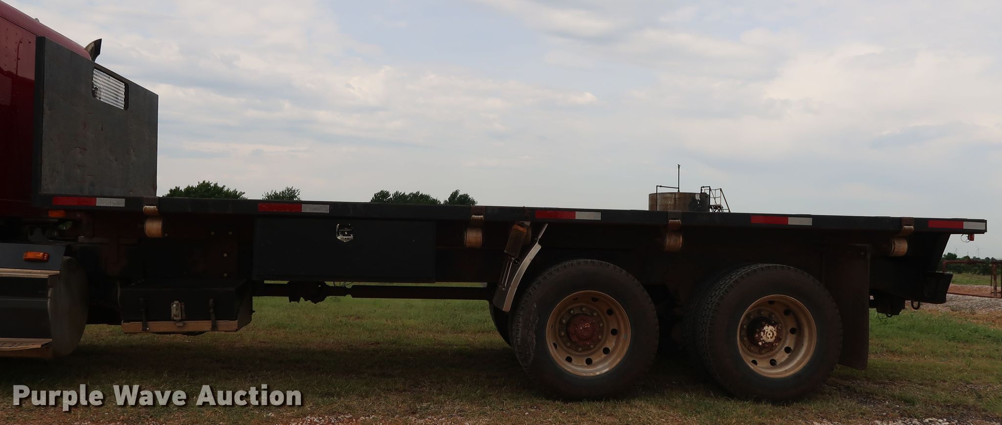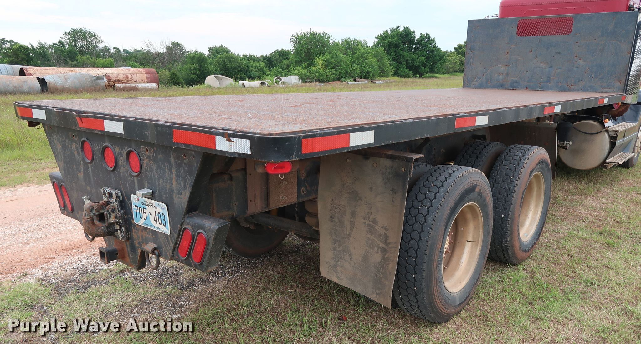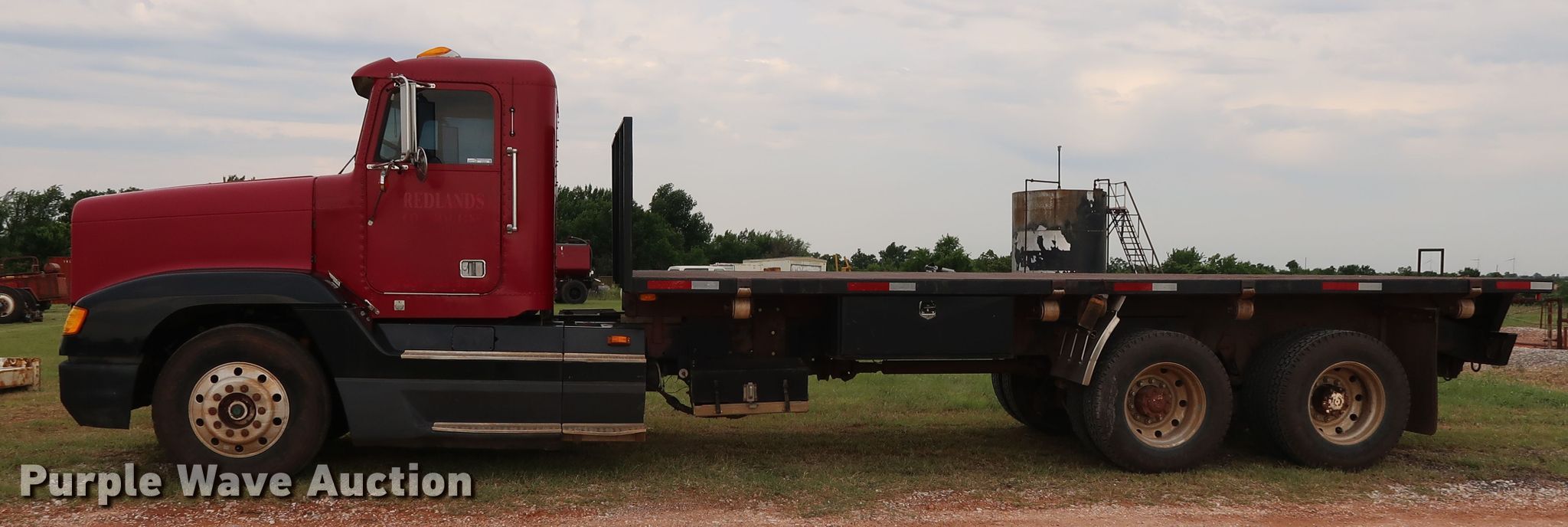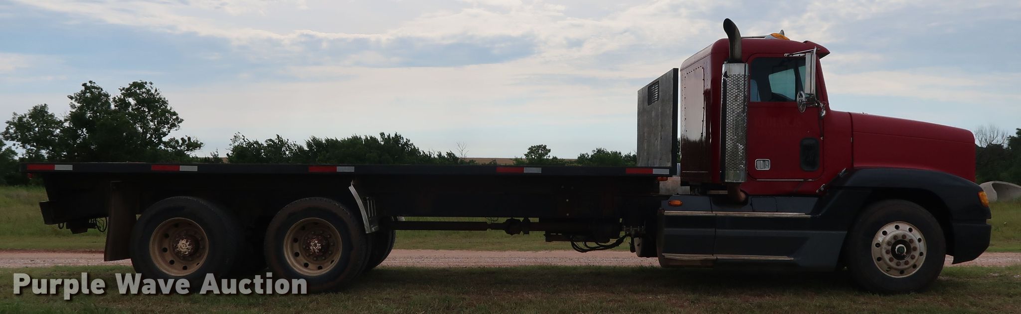 Purple Wave is selling a used Flat Bed Truck in Oklahoma. This item is a 1990 Freightliner FLD flatbed truck with the following: 859,636 miles on odometer, Cummins 14.0L L6 diesel engine, 350 HP, Eaton Fuller Road Ranger nine speed manual transmission, Inter-axle differential lock, Tandem axle, AC and heat, Power windows, Heated mirrors, Brake controller, 22'L x 96"W flatbed, 264" wheelbase, Air suspension, Air brakes, 295/75R22.5 front tires, 11R22.5 rear tires
